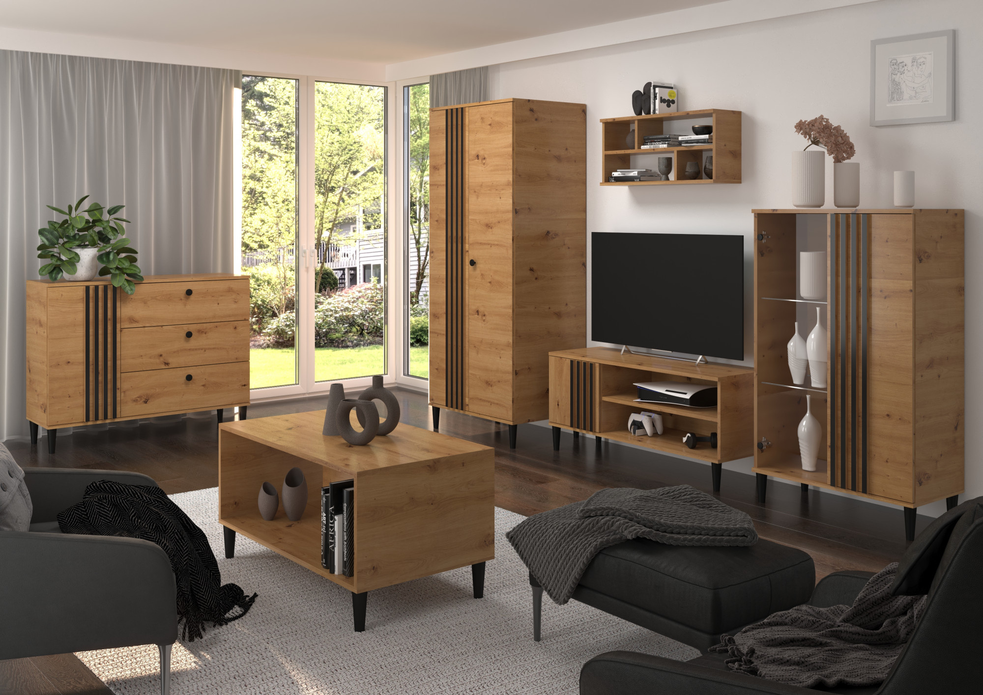 A LIVIA kollekció komódja nappaliba, hálószobába vagy irodába szánt bútor. A természetes fa hatását a fekete színű kiegészítők és betétek hangsúlyozzák. Modern stílusban karbantartva biztosan felkelti a figyelmet. Egyszerű és egyben funkcionális. Javasoljuk, hogy ismerkedjen meg a **LIVIA** kollekció többi termékével.