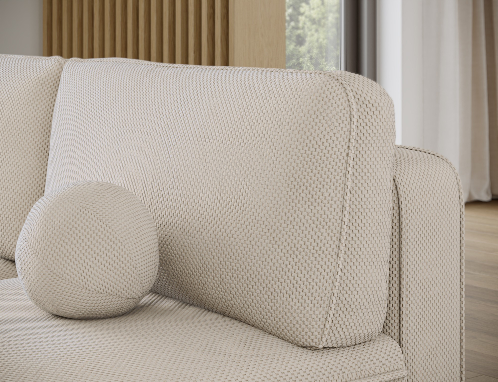 Livosa corner sofa is a modern L-shaped sofa with sleeping function that combines everyday comfort with practical living room solutions. The ergonomic seat and backrest, filled with B-type wave springs and T2540 polyurethane foam, provide excellent support, durability, and comfort. The sofa features a DL unfolding mechanism, allowing quick and easy conversion into a sleeping surface measuring 125 × 220 × 48 cm, making it ideal as a sofa bed. An additional advantage is the bedding storage compartment measuring 50 × 104 × 24 cm. The design is completed with decorative cushions filled with foam granules, low black legs with a height of 3 cm, and a solid construction with overall dimensions of 220 × 144 × 93 cm, making Livosa a perfect fit for modern interiors.