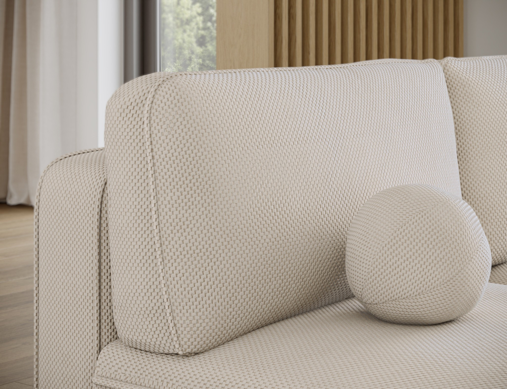 Livosa corner sofa is a modern L-shaped sofa with sleeping function that combines everyday comfort with practical living room solutions. The ergonomic seat and backrest, filled with B-type wave springs and T2540 polyurethane foam, provide excellent support, durability, and comfort. The sofa features a DL unfolding mechanism, allowing quick and easy conversion into a sleeping surface measuring 125 × 220 × 48 cm, making it ideal as a sofa bed. An additional advantage is the bedding storage compartment measuring 50 × 104 × 24 cm. The design is completed with decorative cushions filled with foam granules, low black legs with a height of 3 cm, and a solid construction with overall dimensions of 220 × 144 × 93 cm, making Livosa a perfect fit for modern interiors.