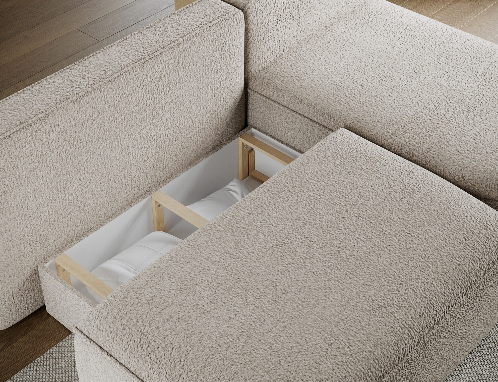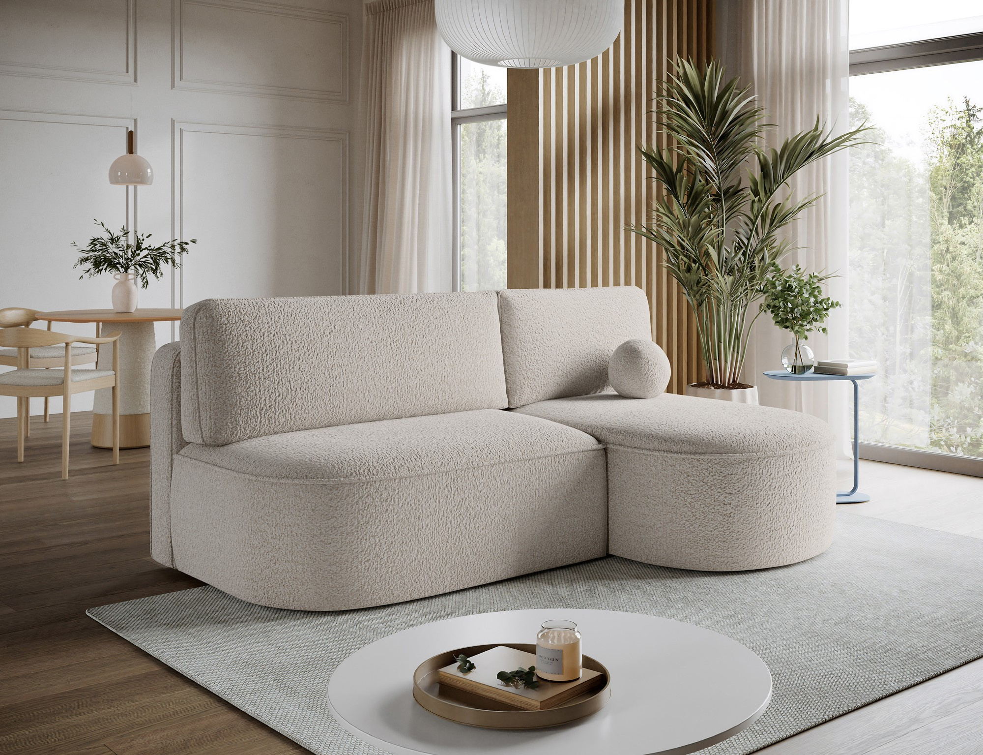 Livosa corner sofa is a modern L-shaped sofa with sleeping function that combines everyday comfort with practical living room solutions. The ergonomic seat and backrest, filled with B-type wave springs and T2540 polyurethane foam, provide excellent support, durability, and comfort. The sofa features a DL unfolding mechanism, allowing quick and easy conversion into a sleeping surface measuring 125 × 220 × 48 cm, making it ideal as a sofa bed. An additional advantage is the bedding storage compartment measuring 50 × 104 × 24 cm. The design is completed with decorative cushions filled with foam granules, low black legs with a height of 3 cm, and a solid construction with overall dimensions of 220 × 144 × 93 cm, making Livosa a perfect fit for modern interiors.