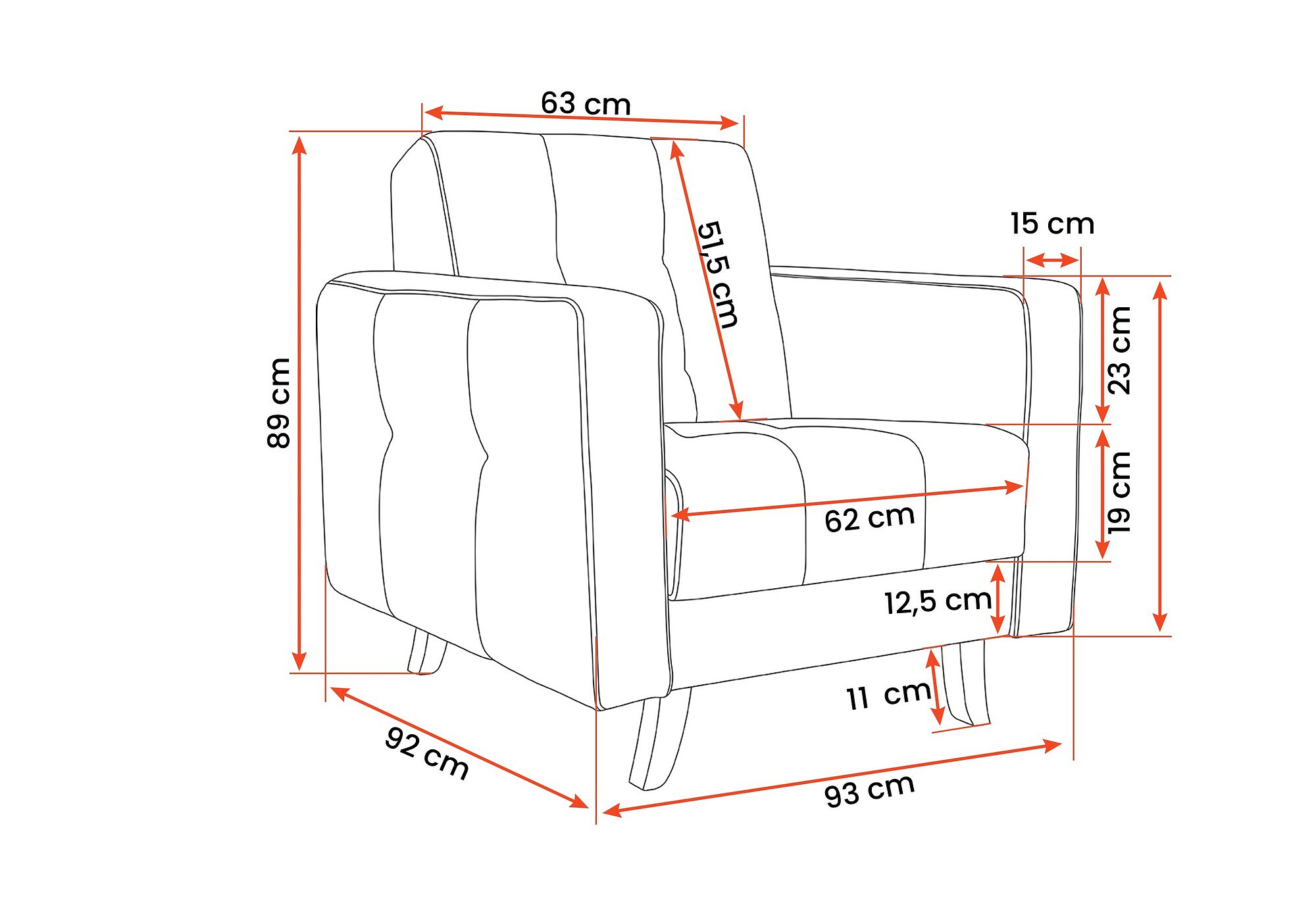 A 94 cm szélességgel, 89 cm maximális magassággal és 92 cm mélységgel a LIZBONA fotel elegendő helyet biztosít a kényelmes üléshez. Ergonomikus formája támogatja a helyes testtartást, ami ideális hosszú órákon át tartó pihenéshez vagy kedvenc könyvének olvasásához.
