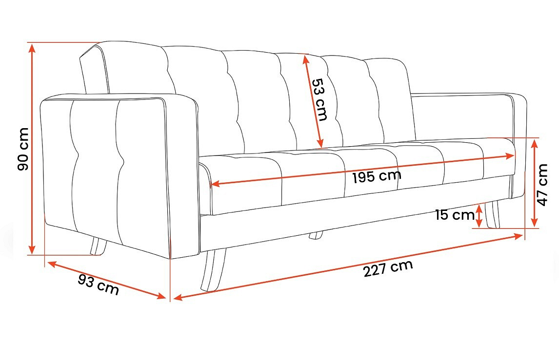 A LIZBONA kanapé méretei 227 x 90 x 93 cm, kinyitva pedig 118 x 195 cm. Maximális magassága 90 cm, az ülés minimális magassága pedig 47 cm. Ez a kanapé tökéletes hosszú estékhez a tévé előtt, délutáni szundikáláshoz vagy kényelmes könyvolvasáshoz.
