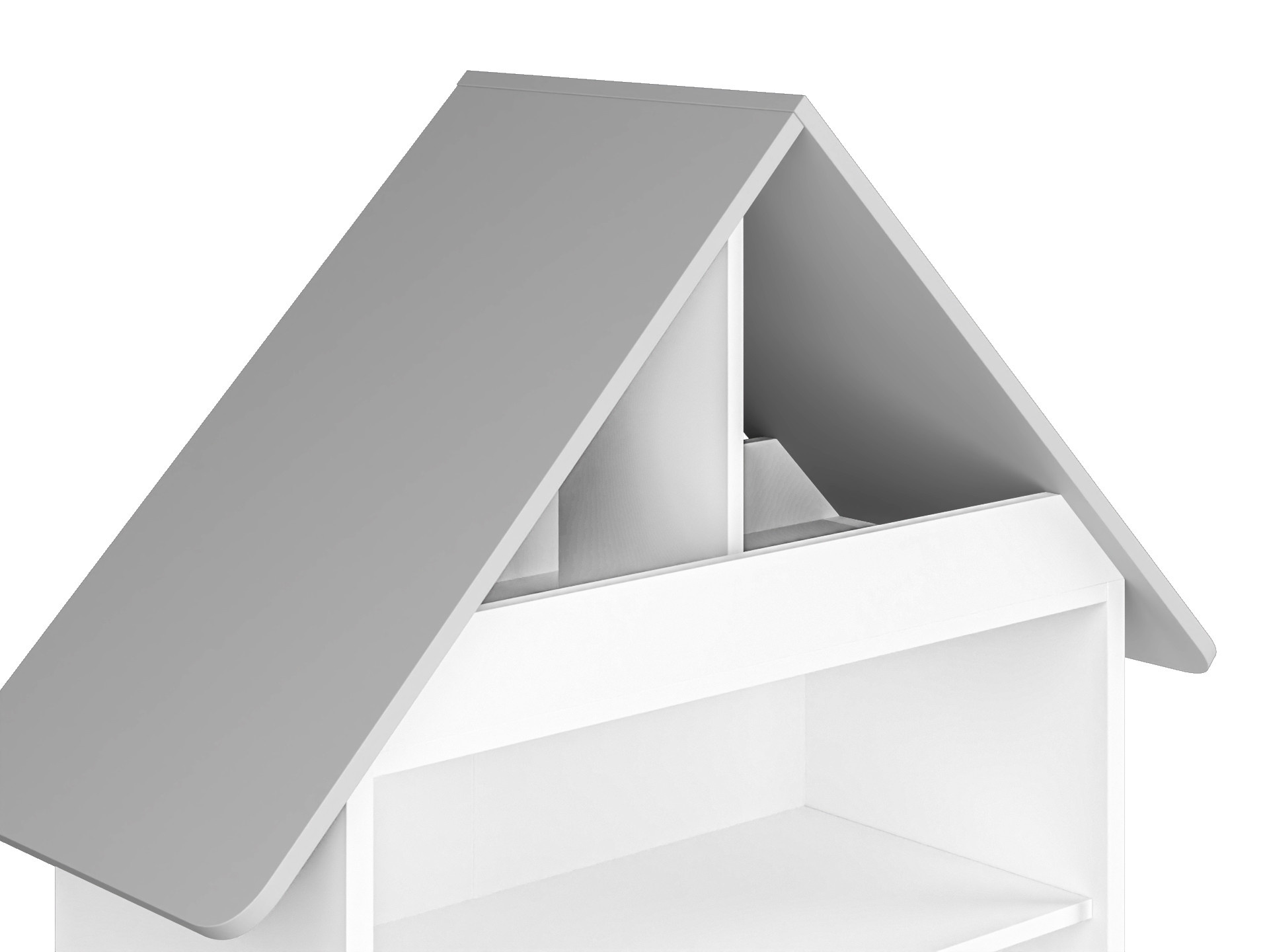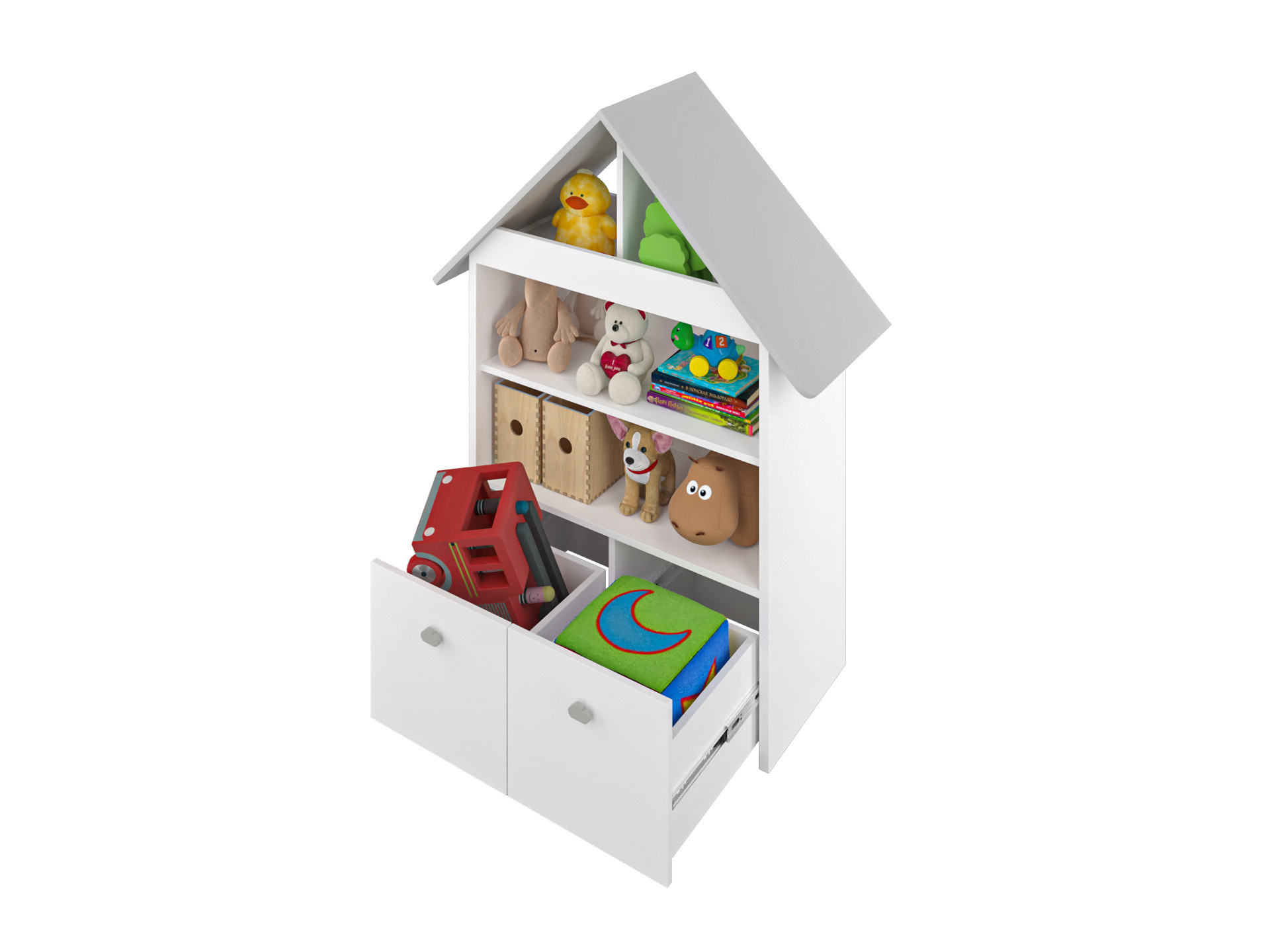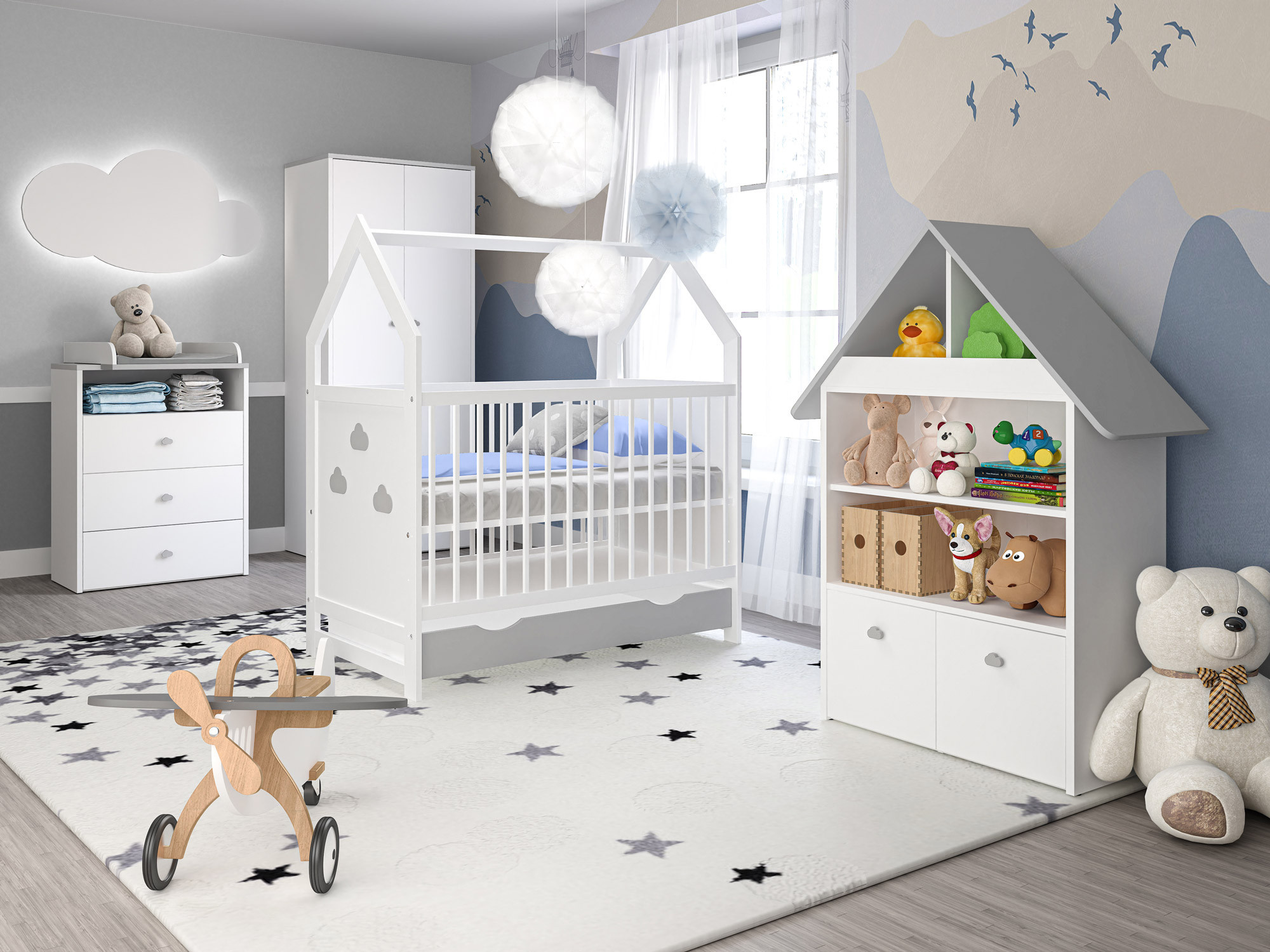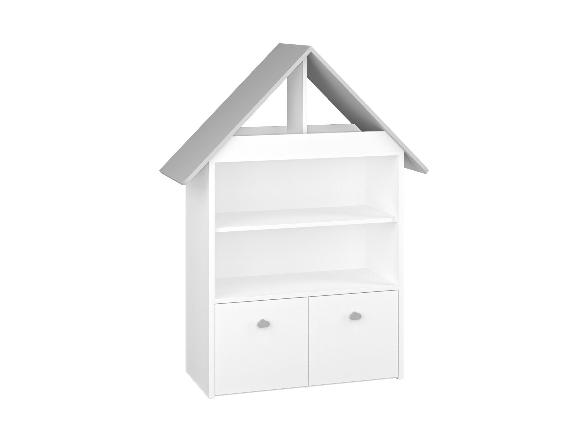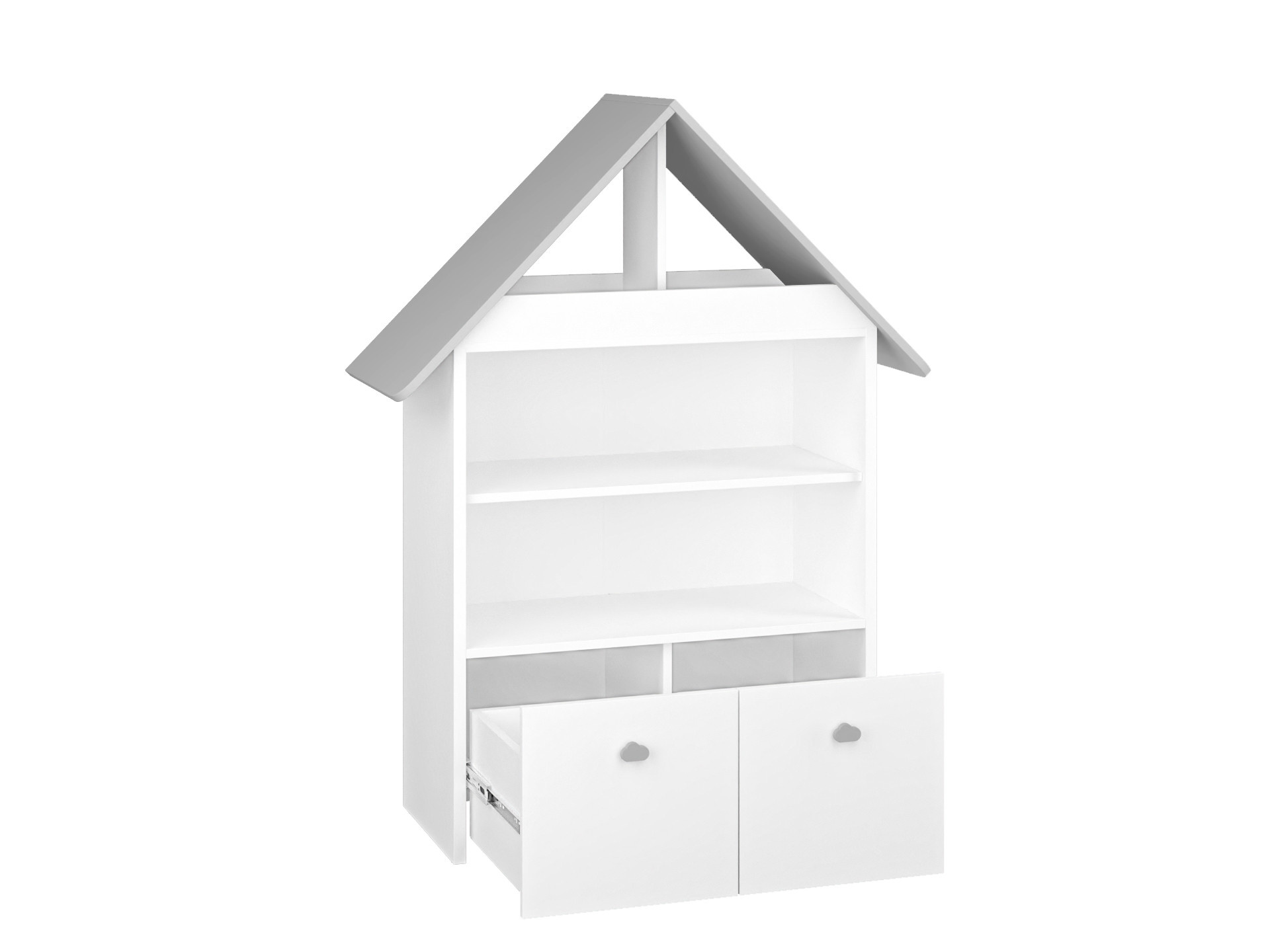 Komoda LOEN 03 to ergonomiczny mebel o niebanalnym designie. Kształt bryły przypominający dom to propozycja, która rozbudzi wyobraźnię Twojego dziecka i stanie sie miejscem wielu kreatywnych zabaw. Wśród głównych zalet mebla należy wymienić przede wszystkich dwie bardzo pojemne szuflady, które pozwolną na umieszczenie np. zabawek dziecka. Ponadto komoda wyróżniają cztery otwarte wnęki, dzięki którym Twoja pociecha wyeksponuje ulubione przedmioty. Mebel wyróżnia się pięknymi, gumowymi uchywtami w kształcie chmurki. Kolory bieli oraz szarości zapewnią swobodę aranżycjną oraz z łatwością pozwolą na urządzenie zarówno pokoiku dziewczynki, jak i chłopca.