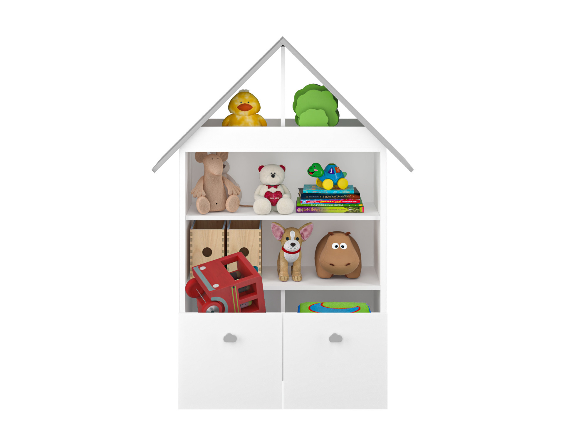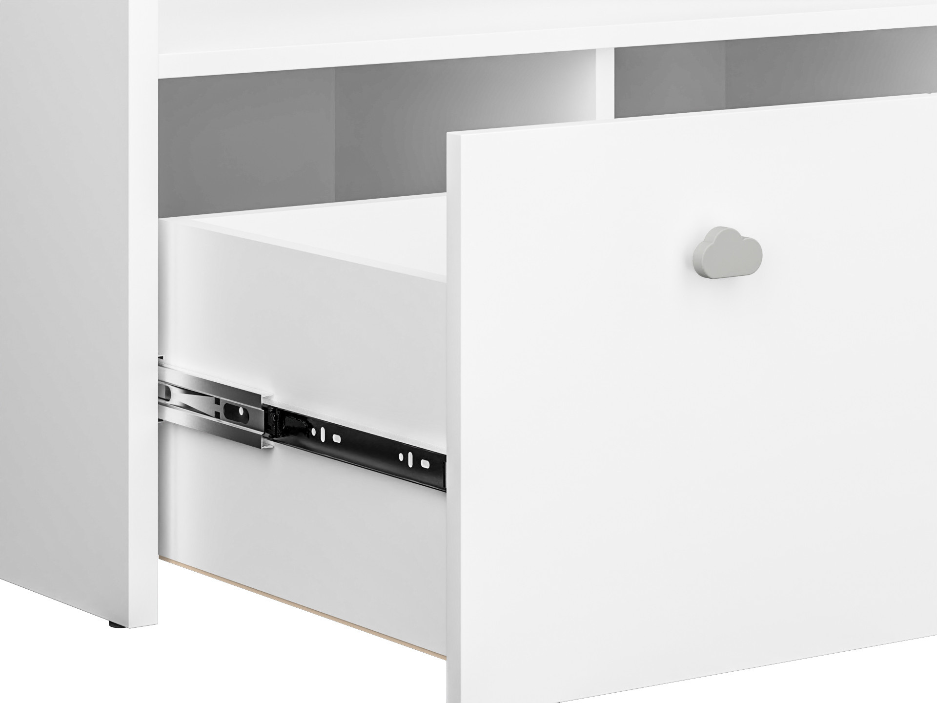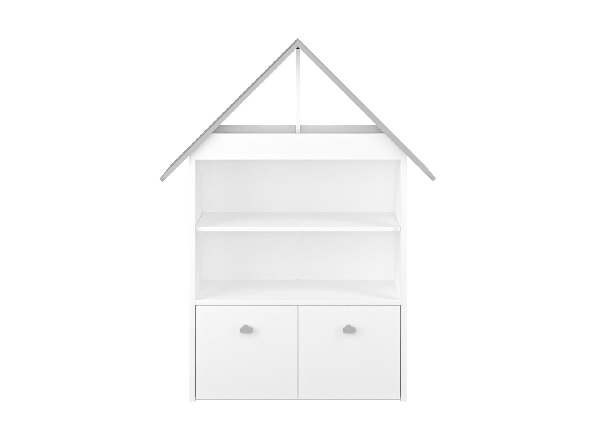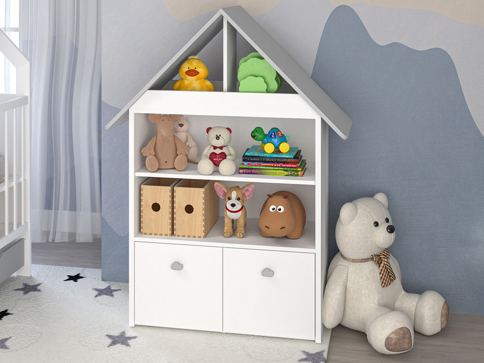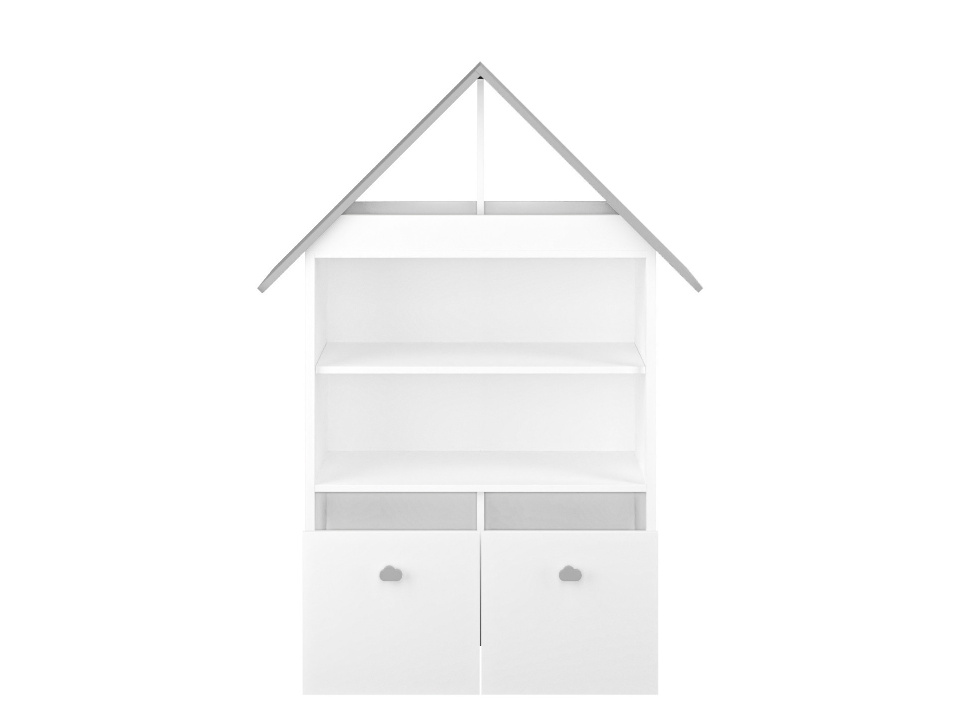 Komoda LOEN 03 to ergonomiczny mebel o niebanalnym designie. Kształt bryły przypominający dom to propozycja, która rozbudzi wyobraźnię Twojego dziecka i stanie sie miejscem wielu kreatywnych zabaw. Wśród głównych zalet mebla należy wymienić przede wszystkich dwie bardzo pojemne szuflady, które pozwolną na umieszczenie np. zabawek dziecka. Ponadto komoda wyróżniają cztery otwarte wnęki, dzięki którym Twoja pociecha wyeksponuje ulubione przedmioty. Mebel wyróżnia się pięknymi, gumowymi uchywtami w kształcie chmurki. Kolory bieli oraz szarości zapewnią swobodę aranżycjną oraz z łatwością pozwolą na urządzenie zarówno pokoiku dziewczynki, jak i chłopca.