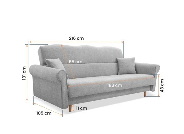 A 216 cm szélességgel, 101 cm magassággal és 105 cm mélységgel a kanapé elegendő helyet biztosít a kényelmes üléshez és fekvéshez. Az ülés magassága 43 cm, ami kényelmes felállást és ülést biztosít, amit a mindennapi használat során értékelni fog. A kanapé könnyen átalakítható tágas ággyá, ami ideális vendégek fogadására vagy egy fárasztó nap utáni pihenésre.