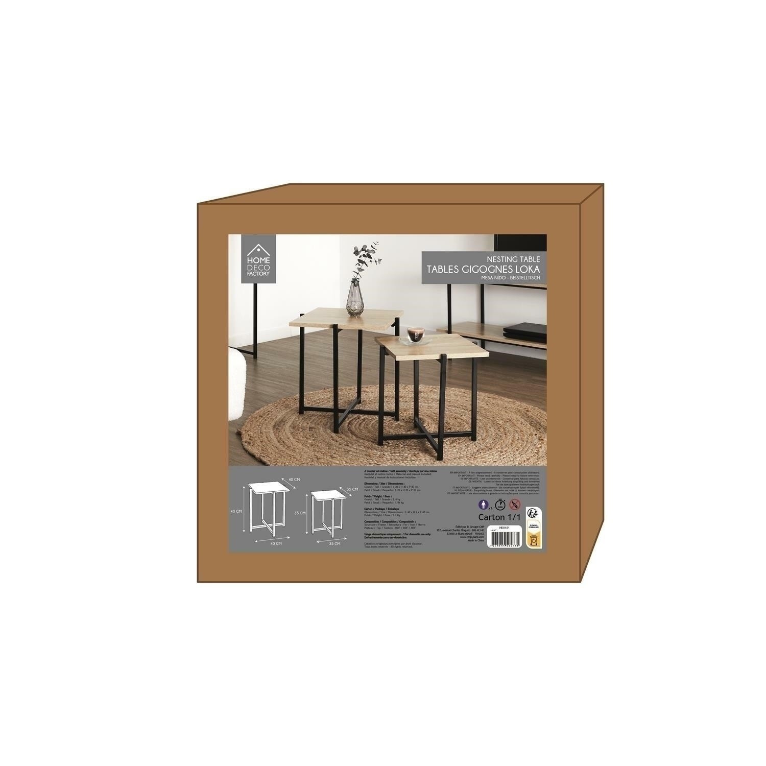 A Loka 2 asztal szett jól beválik a nappaliban a kanapé előtt, vagy két különálló asztalként a belső térben. A készlet két különböző méretű asztalból áll. Az asztalok MDF lapból és feketére porfestett fém talapzatokból készültek. Asztalok méretei: nagy 40 x 40 x 40 cm kicsi: 35 x 35 x 35 cm Asztallap anyaga MDF Alapanyag fém Összeszerelést igényel