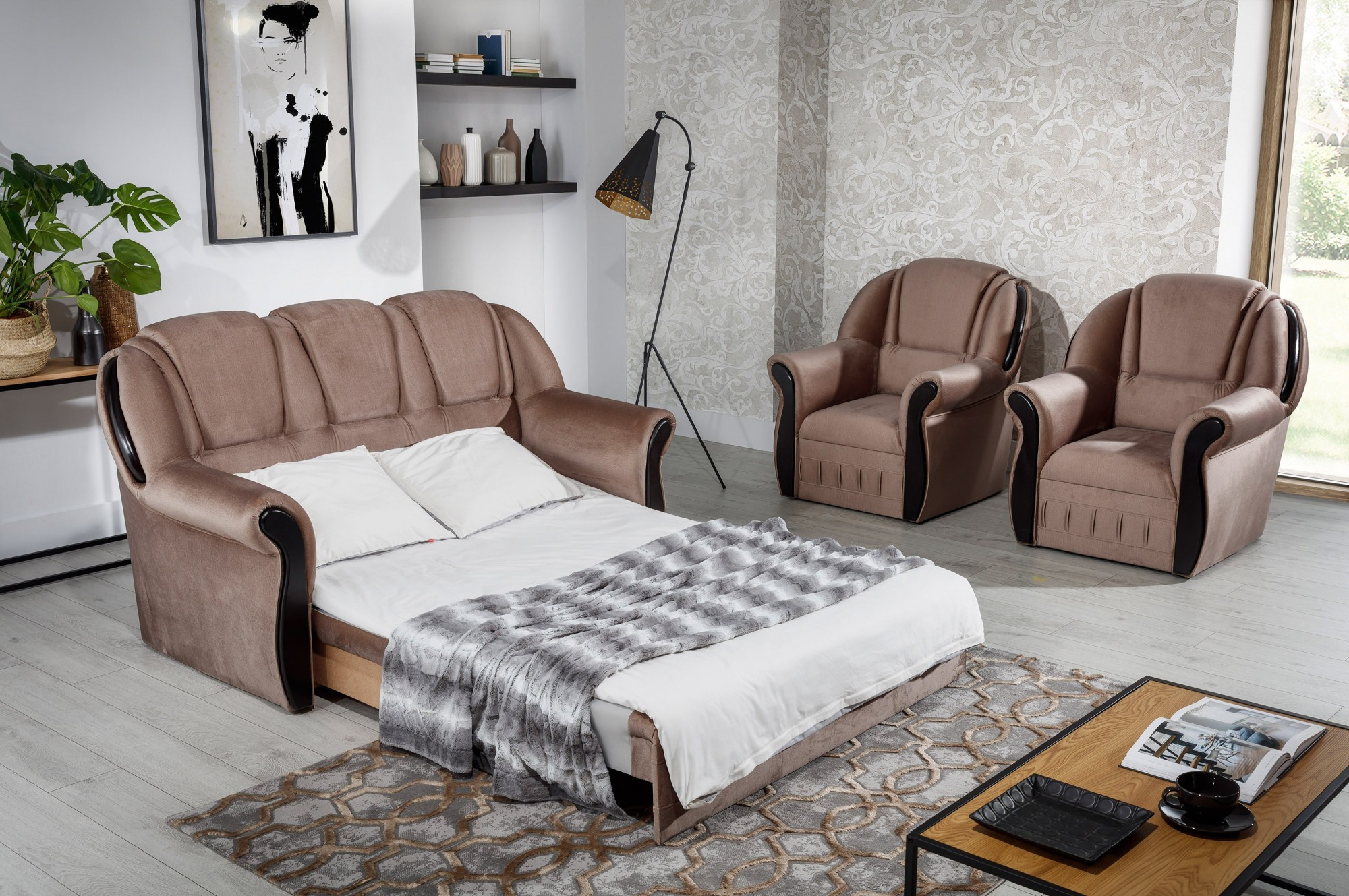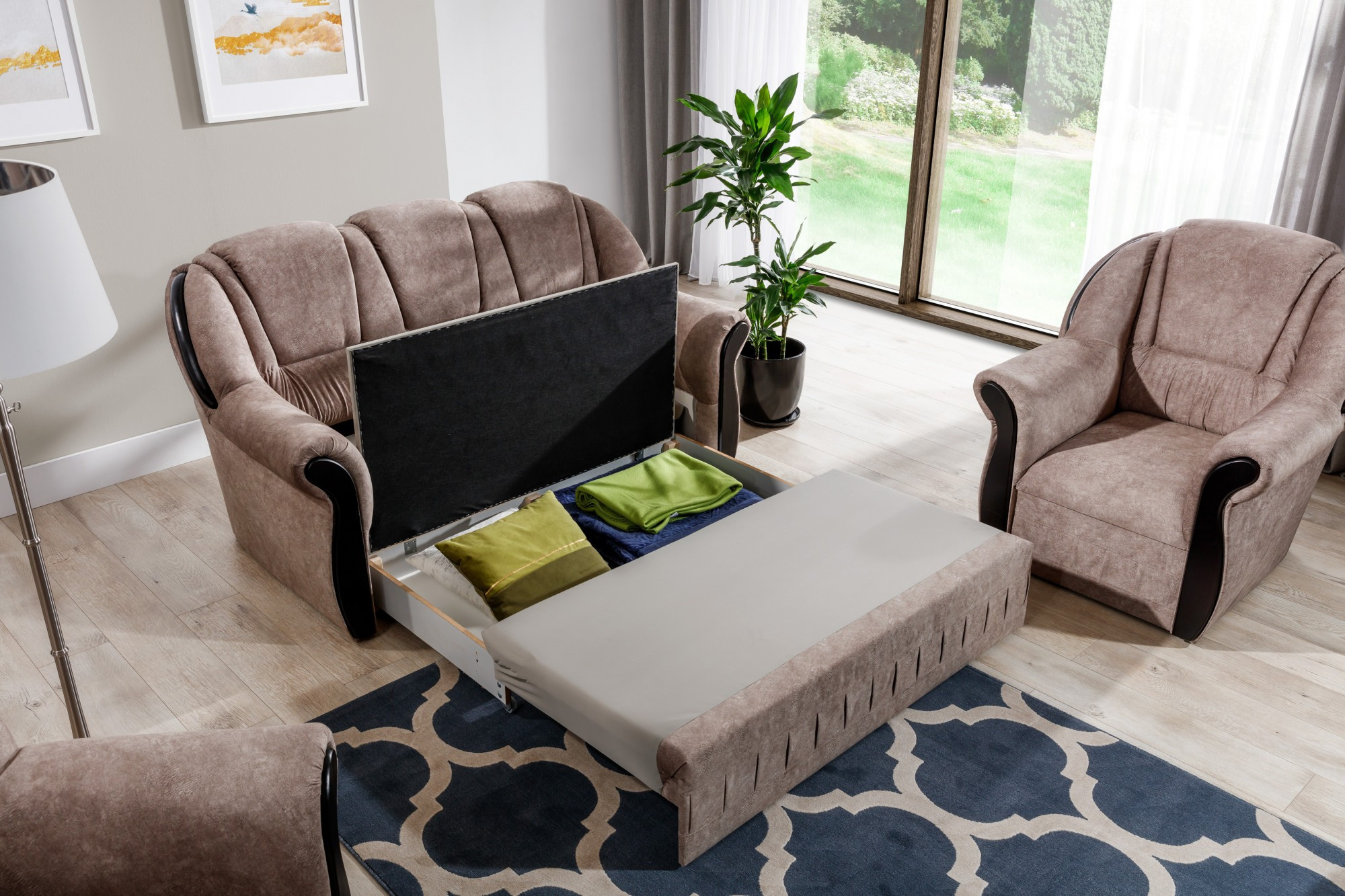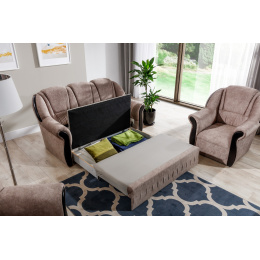 The Lord sofa is an elegant piece of furniture in a traditional style that combines classic design with comfort and functionality. With its compact dimensions of 180x85x105 cm, it fits perfectly in both small and large interiors. The seat, filled with wave spring type A and foam T3030, ensures durability and comfort, while the backrest with foam T2130 and T2540 provides proper support for the back. An additional advantage of the sofa is its sleeping function, allowing for quick transformation into a comfortable resting space, as well as a bedding storage compartment for easy organization of essentials. The upholstered back makes it suitable for placement anywhere in the living room, while the 2.5 cm black glides ensure stability and protect the floor. Its classic design, precise craftsmanship, and high-quality materials make the Lord sofa a perfect choice for elegant interiors that combine timeless style with functionality.