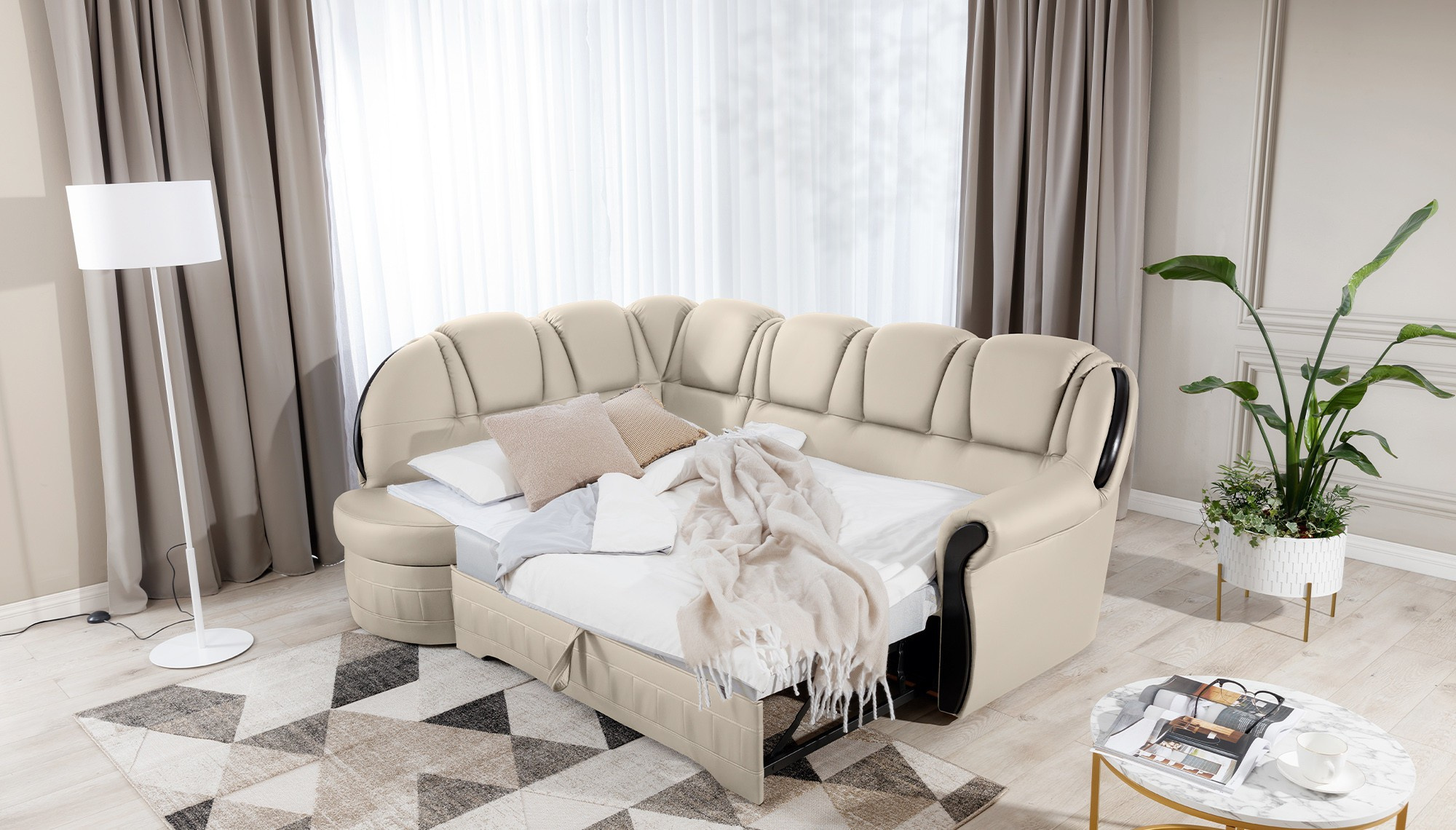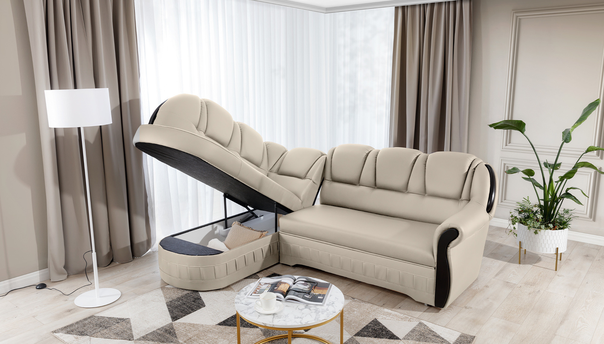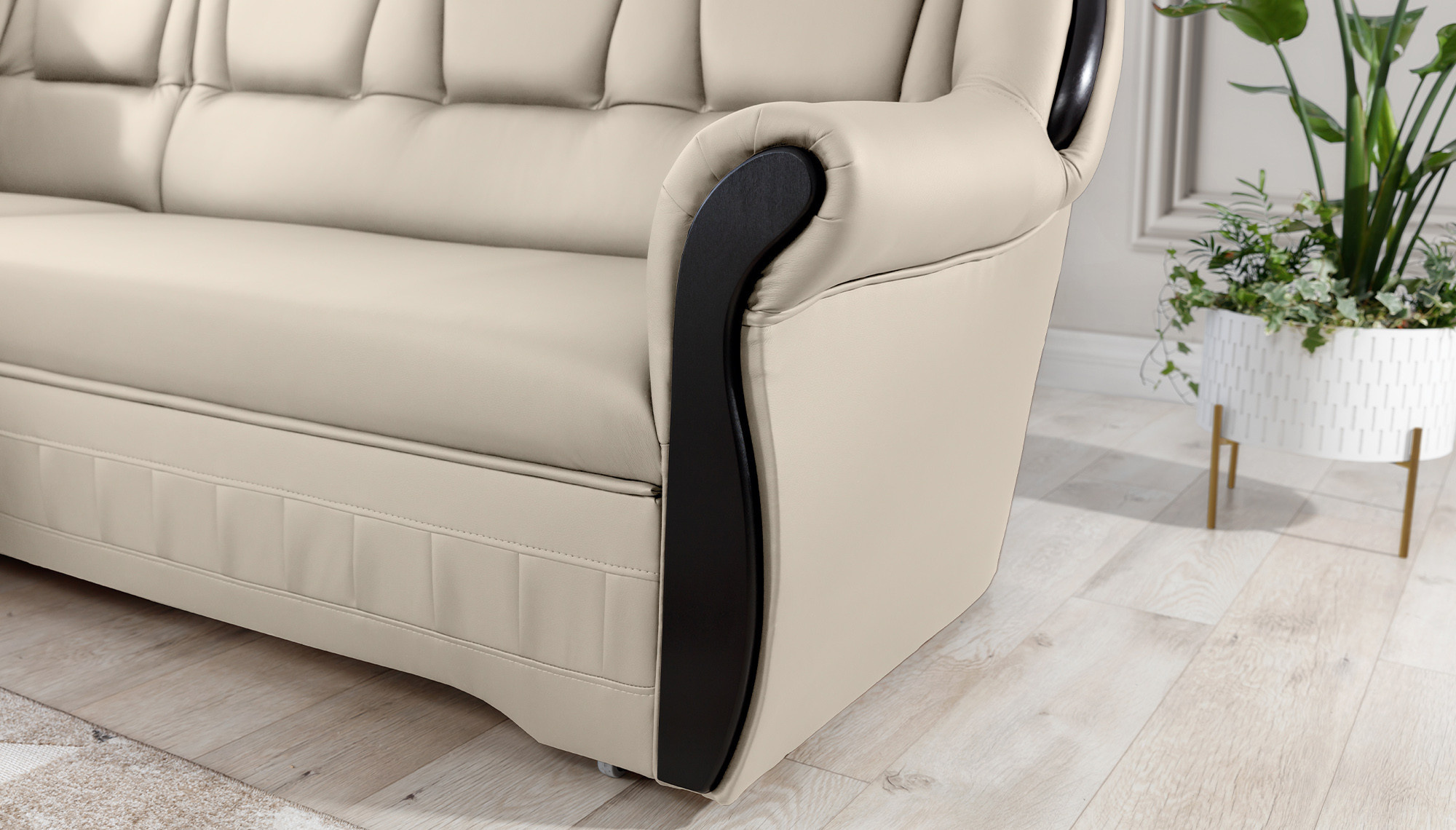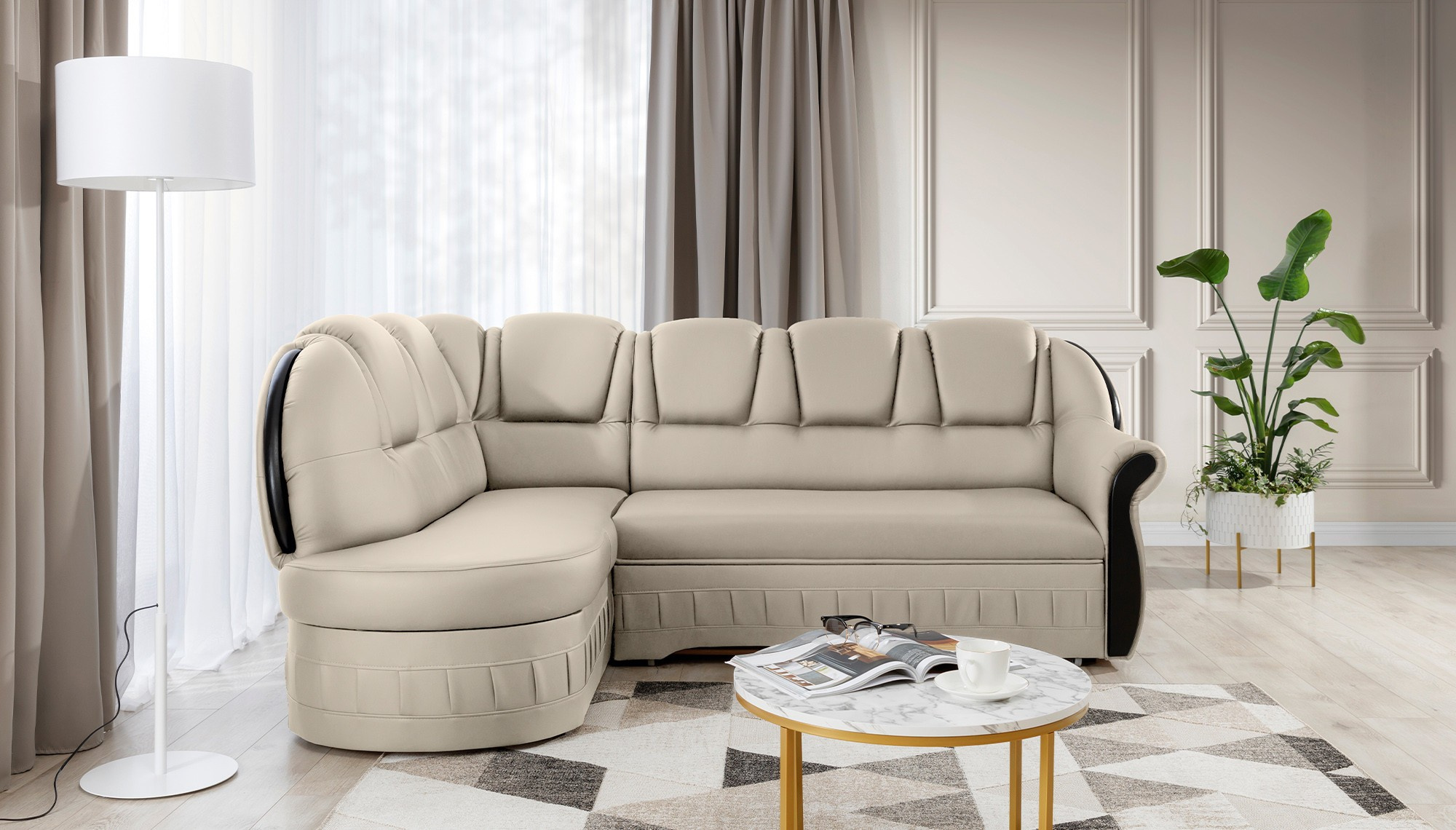 Lord is an elegant and tasteful corner sofa, which is not only a functional piece of furniture, but through its design can also become an extraordinary decoration of the living room. The dimensions of 243 x 180 x 105 cm guarantee a large space for relaxation during the day, and thanks to the function of the intuitive dolphin-type unfolding system used, this comfort can also be felt at night. Spacious sleeping area of 195 x 125 cm allows you to enjoy the exceptional softness and flexibility of the seat of our furniture. All this is due to the corrugated spring and T30 foam, from which the corner is made. thanks to which the body during rest is stabilized and properly supported. Thanks to such use, the risk of the appearance of unsightly indentations, damage and abrasions is minimized, and our body always maintains the correct position. In the Lord model it is impossible not to pay attention to: rounded backrests, comfortable armrest, spacious seats, spacious bedding container, tasteful stitching, unique body and style in which the corner has been maintained. It is certainly worth having such a unique corner sofa in your home.