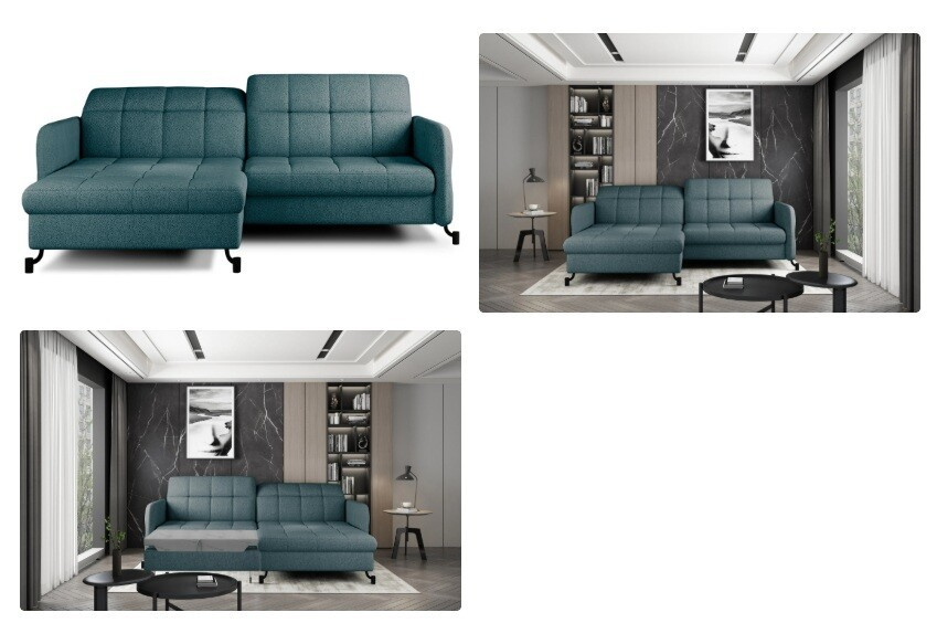 Lorelle is a stylish, elegant and modern corner sofa for our times, which is not only a functional piece of furniture, but can also work perfectly as an apartment decoration. L-shaped Lorelle - with dimensions of 225 x 160 x 105 cm - guarantees spaciousness and comfort during the day, as well as maximum comfort on the sleeping surface of 200 x 110 cm - at night. Thanks to the automatic and intuitive dolphin-type mechanism, unfolding the bed to the sleeping function is pleasant and completely uncomplicated. The advantage of this model is also the capacious storage compartment - a place for bedding - which is located in the ottoman. Positive sensations are enhanced by the way the furniture is made through a B-type corrugated spring, as well as HR + T25 foam, thanks to which the body is stabilized and properly supported while resting. Such a combination provides users, a sense of maximum comfort. Among the distinguishing features of this model, we can certainly include careful, modern finishing, a wide choice of colors, as well as original, stylish black legs of irregular shape. If you are looking for a breath of freshness and an interesting, elegant finish - Lorello will certainly be perfect for you. It is worth applying such a solution in your apartment.