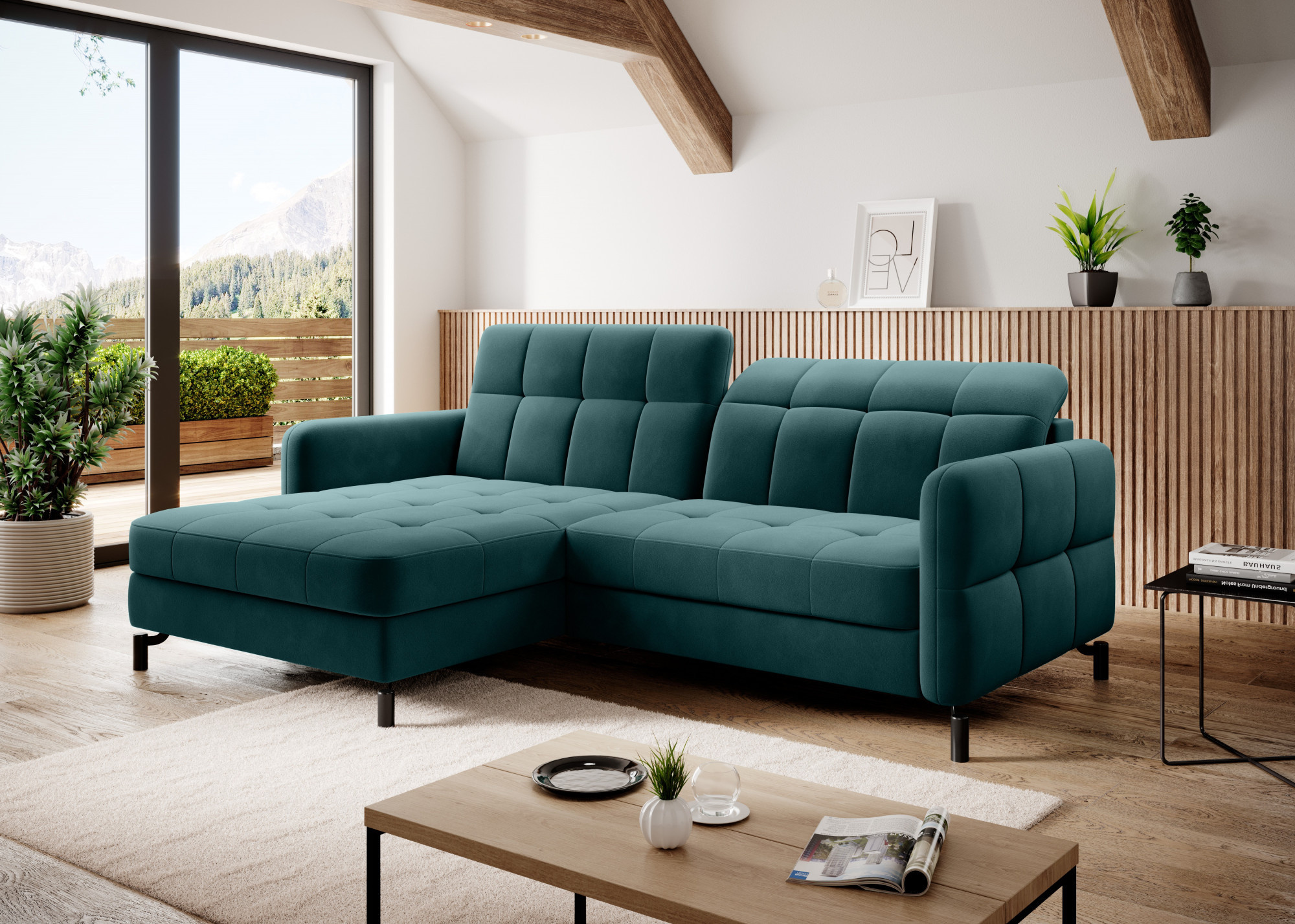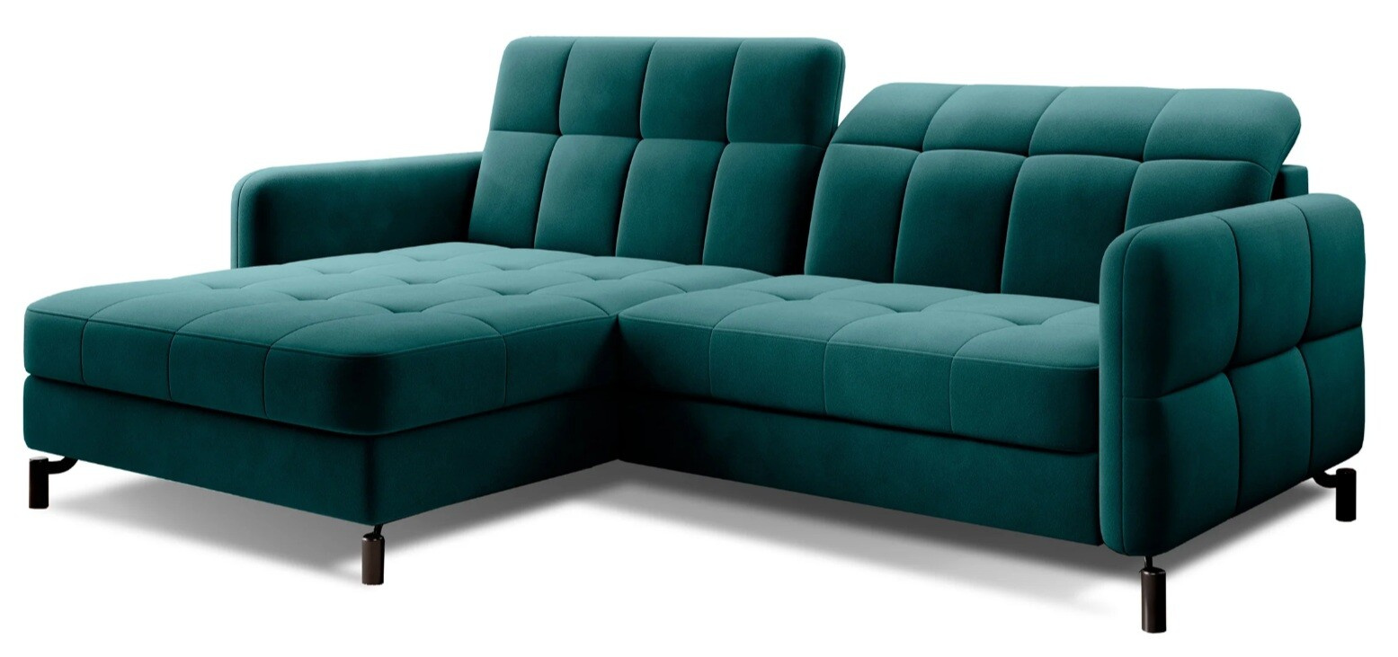 Lorelle is a stylish, elegant and modern corner sofa for our times, which is not only a functional piece of furniture, but can also work perfectly as an apartment decoration. L-shaped Lorelle - with dimensions of 225 x 160 x 105 cm - guarantees spaciousness and comfort during the day, as well as maximum comfort on the sleeping surface of 200 x 110 cm - at night. Thanks to the automatic and intuitive dolphin-type mechanism, unfolding the bed to the sleeping function is pleasant and completely uncomplicated. The advantage of this model is also the capacious storage compartment - a place for bedding - which is located in the ottoman. Positive sensations are enhanced by the way the furniture is made through a B-type corrugated spring, as well as HR + T25 foam, thanks to which the body is stabilized and properly supported while resting. Such a combination provides users, a sense of maximum comfort. Among the distinguishing features of this model, we can certainly include careful, modern finishing, a wide choice of colors, as well as original, stylish black legs of irregular shape. If you are looking for a breath of freshness and an interesting, elegant finish - Lorello will certainly be perfect for you. It is worth applying such a solution in your apartment.