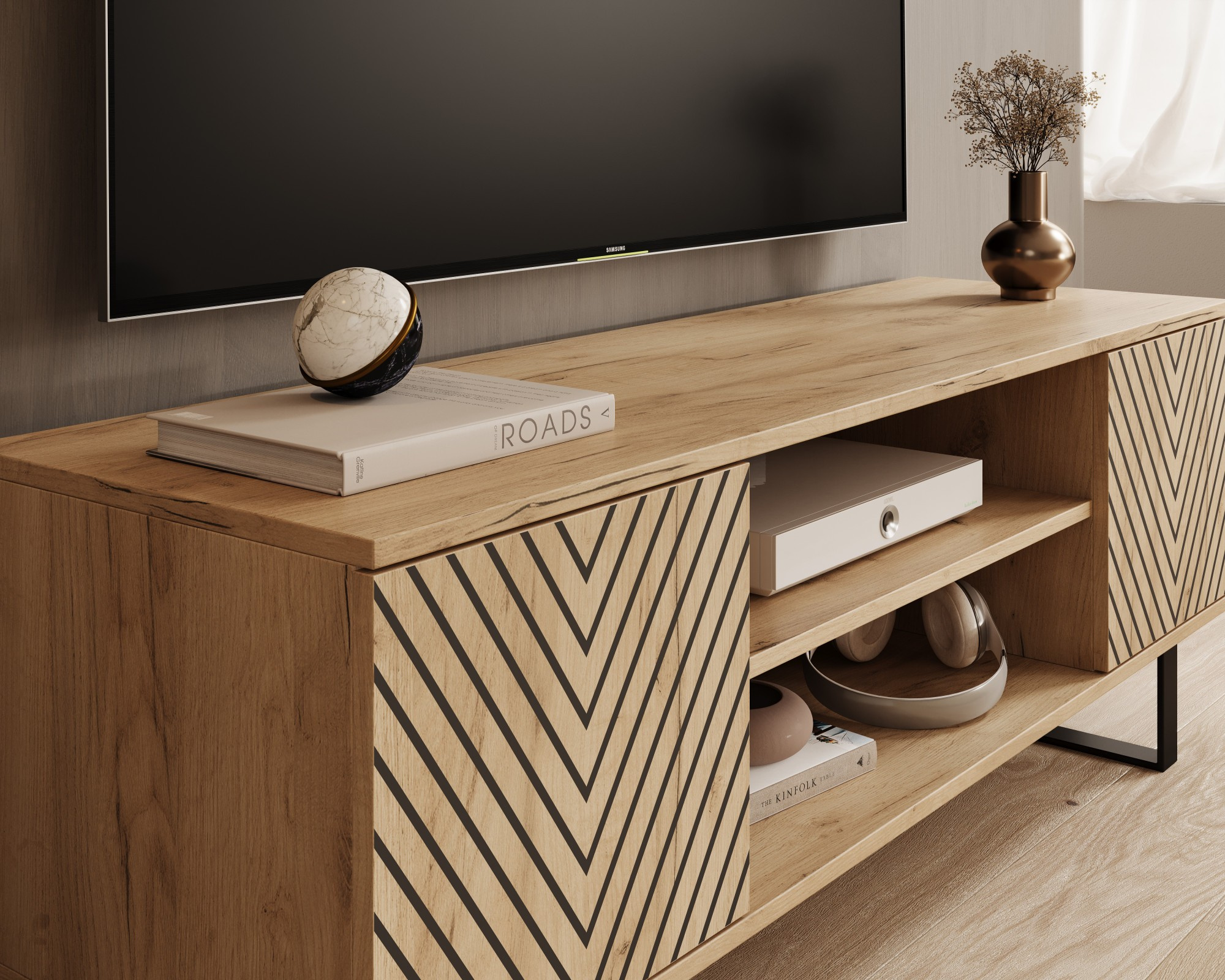 A Lorello RTV szekrény az elegancia és a modernség tökéletes kombinációja, amely kivételes jelleget kölcsönöz a belső térnek. A fejtámlát finom lamellás minták és látványos halszálka díszíti, amelyek egyedi stílust kölcsönöznek a bútornak, skandináv és ipari dizájn ihletésével. A fekete, fém lábak kiemelik a minimalista esztétikát, miközben biztosítják a szerkezet stabilitását és tartósságát. A Lorello szekrény átgondolt belső elrendezésének köszönhetően rengeteg helyet kínál az RTV eszközök, kiegészítők vagy apróságok tárolására. Praktikus polcok és fiókok megkönnyítik a rend fenntartását, a kábelnyílások pedig biztosítják, hogy a kábelek láthatatlanok maradjanak. A Lorello RTV szekrény ideális választás azok számára, akik értékelik a funkcionalitást, a stílust és a magas színvonalú kidolgozást. Kiválóan illik loft, modern vagy klasszikus stílusban berendezett nappalikba, elegáns érintéssel.