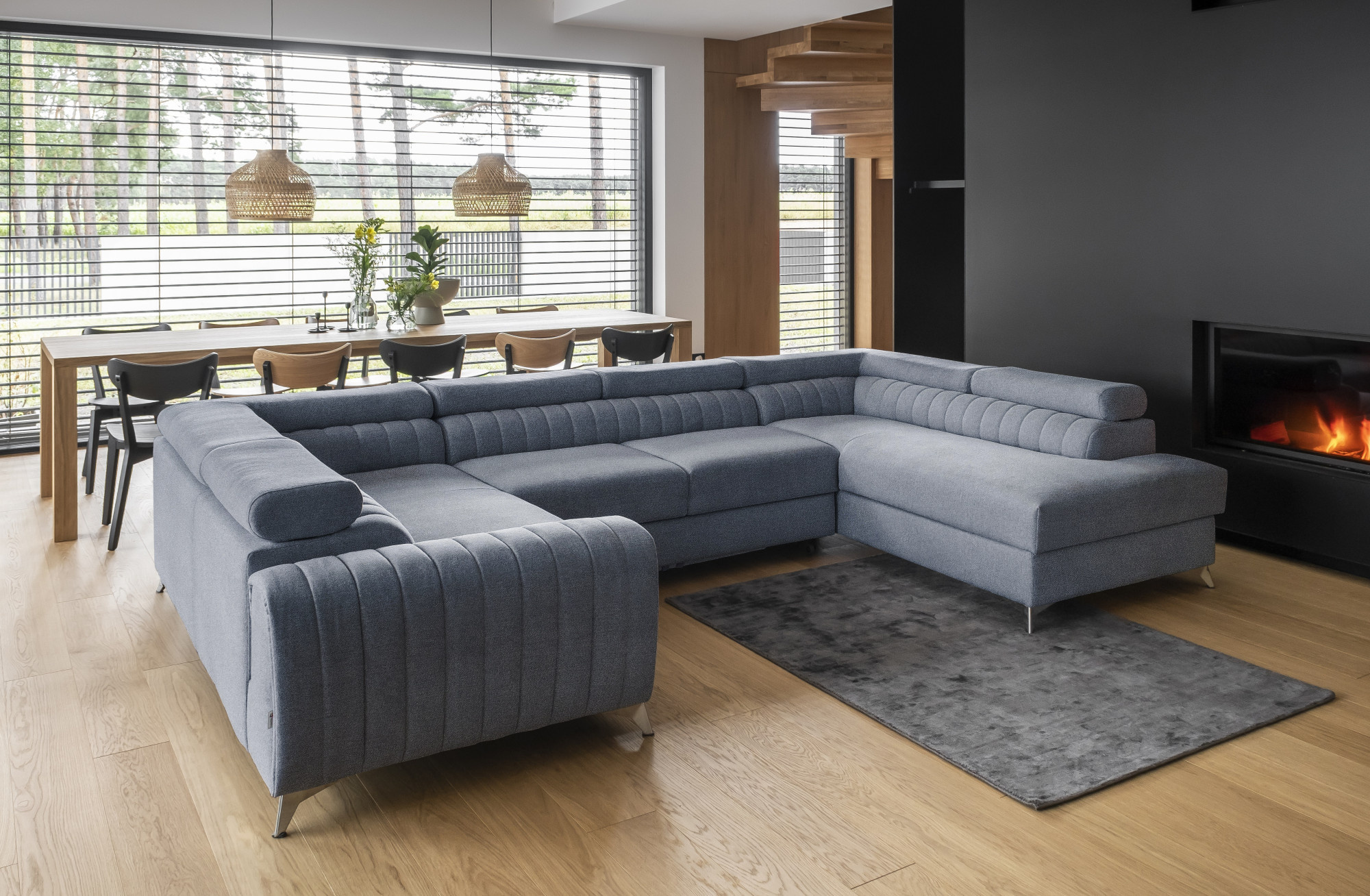 Louis corner sofa is comfortable, stylish and, above all, functional. The seat consists of a corrugated spring and foam filling: T30 and high-flexible HR foam, which perfectly adapt to the body and increase the feeling of comfort. The dimensions of the Louis corner sofa: 347 x 202 x 92 cm intensify the level of comfort. The corner's strengths also include four adjustable headrests, a bedding container and a large sleeping surface of 210 x 125 cm. In addition, the dolphin-type unfolding mechanism, with which the furniture is equipped, is a simple and intuitive system. It is also possible to choose the color of the upholstery of the Louis corner sofa from the color palette of the Eltap collection. It is also worth noting the furniture's designer legs. Steel, chrome-plated, high legs are an interesting and elegant decoration of the corner piece. The aesthetic value is also emphasized by vertical stitching on the side and backrest of Louis.