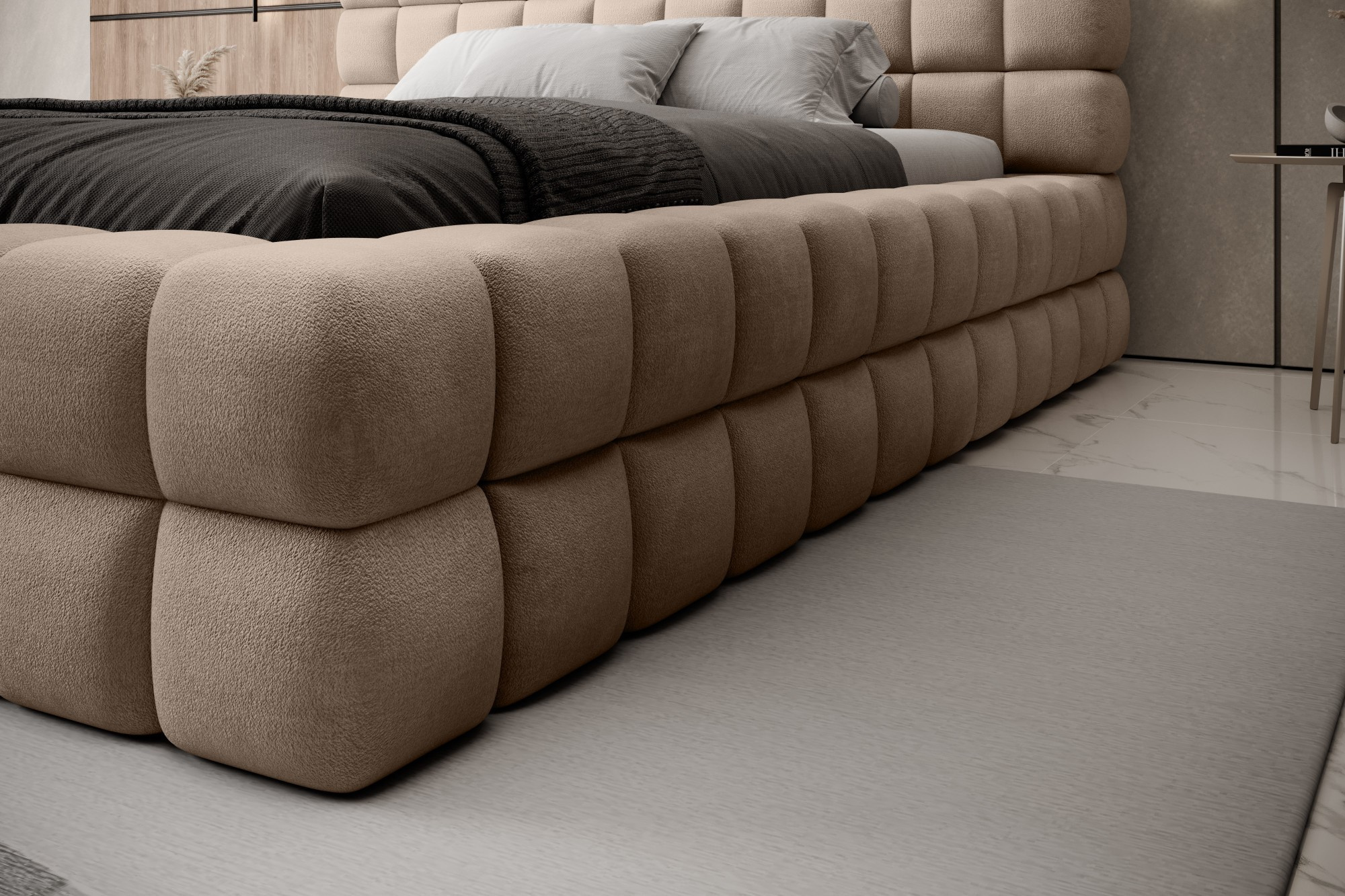 The Dizzle Bed in the version with a width of 140 cm is the ideal solution for those who value compact dimensions without compromising on sleep comfort. This bed combines modern design with functionality. It uses T2130 foam, ensuring elasticity and comfort. With three different width options, the choice of 140 cm provides optimal space for relaxation. The length of the bed is 225 cm, and its impressive height of 104 cm gives it an elegant appearance.The seat height is 42 cm; however, remember to add the mattress height to achieve full sleep comfort. Black plastic legs with a height of 2 cm ensure stability. The metal frame guarantees the durability of the construction, and one storage compartment makes the Dizzle Bed 140 also a practical place for storing additional items.With 36 slats for even mattress support, the Dizzle Bed, with its shape resembling an elegant cube, introduces unique design and comfortable relaxation to your bedroom.