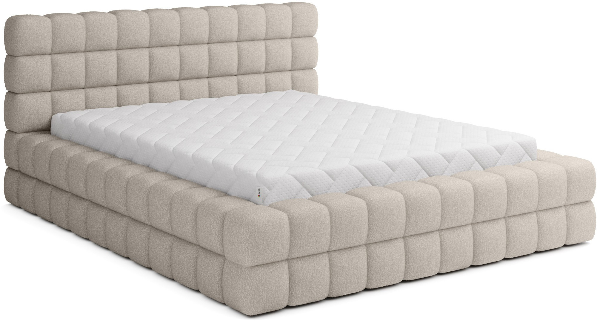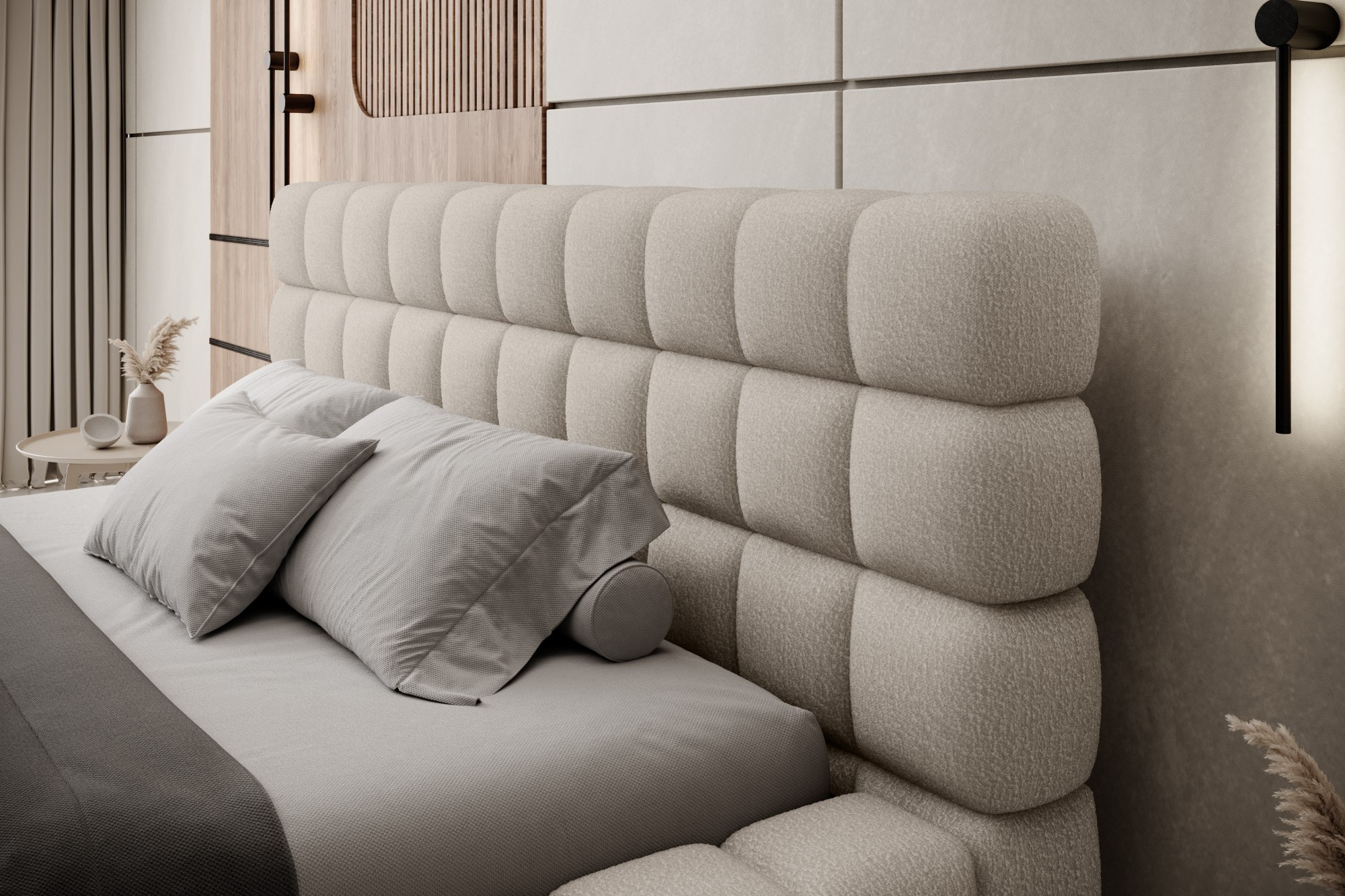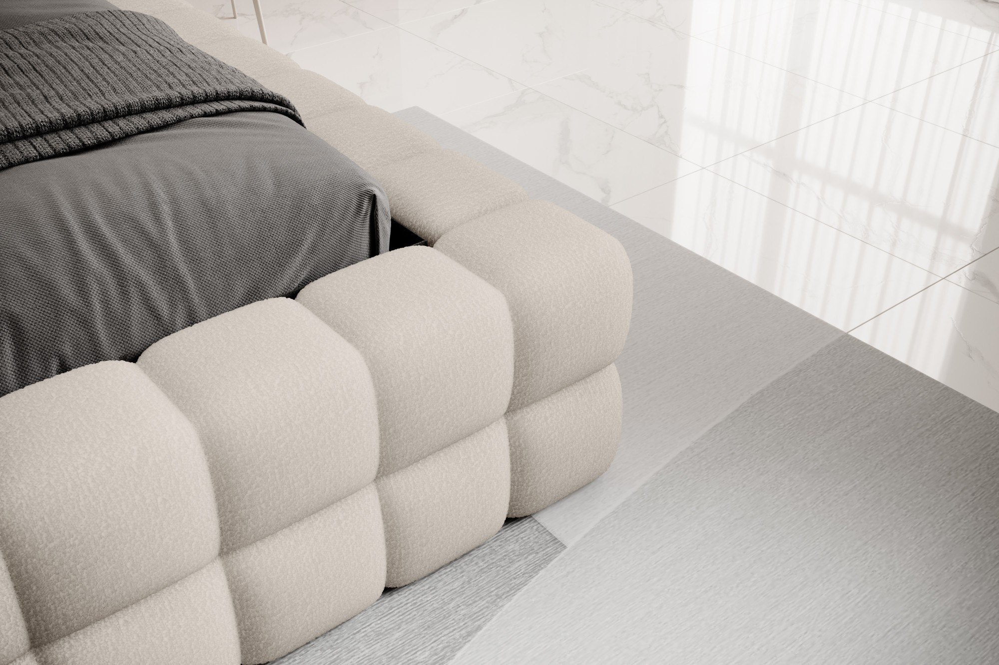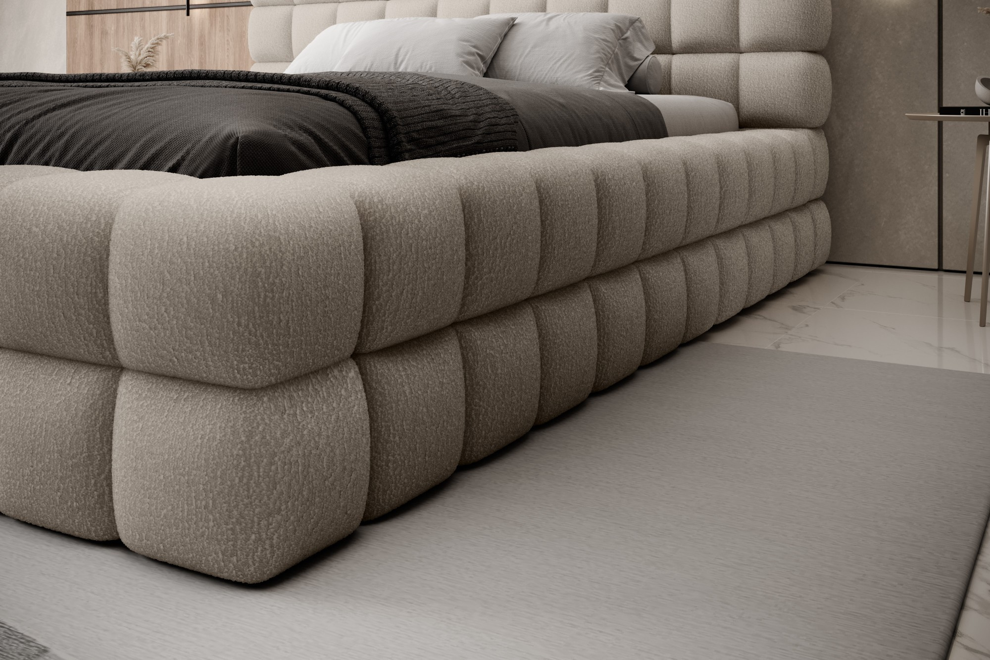 The Dizzle Bed in the version with a width of 140 cm is the ideal solution for those who value compact dimensions without compromising on sleep comfort. This bed combines modern design with functionality. It uses T2130 foam, ensuring elasticity and comfort. With three different width options, the choice of 140 cm provides optimal space for relaxation. The length of the bed is 225 cm, and its impressive height of 104 cm gives it an elegant appearance.The seat height is 42 cm; however, remember to add the mattress height to achieve full sleep comfort. Black plastic legs with a height of 2 cm ensure stability. The metal frame guarantees the durability of the construction, and one storage compartment makes the Dizzle Bed 140 also a practical place for storing additional items.With 36 slats for even mattress support, the Dizzle Bed, with its shape resembling an elegant cube, introduces unique design and comfortable relaxation to your bedroom.