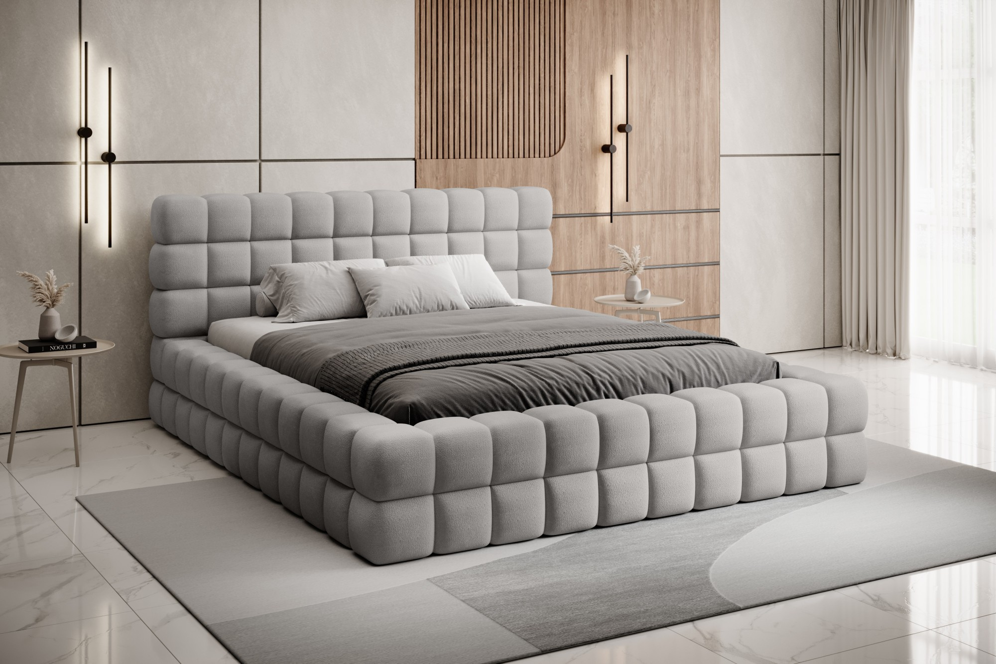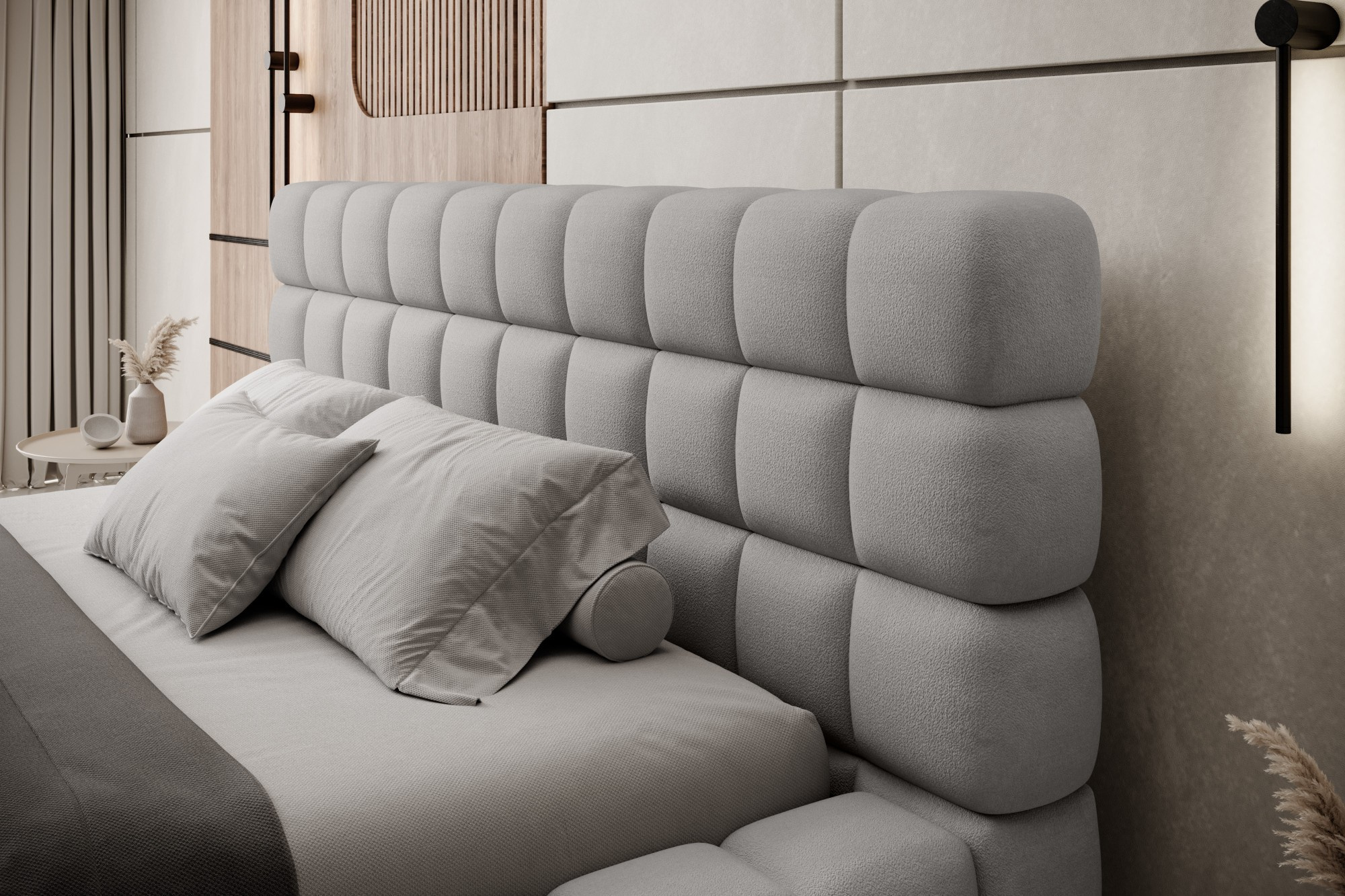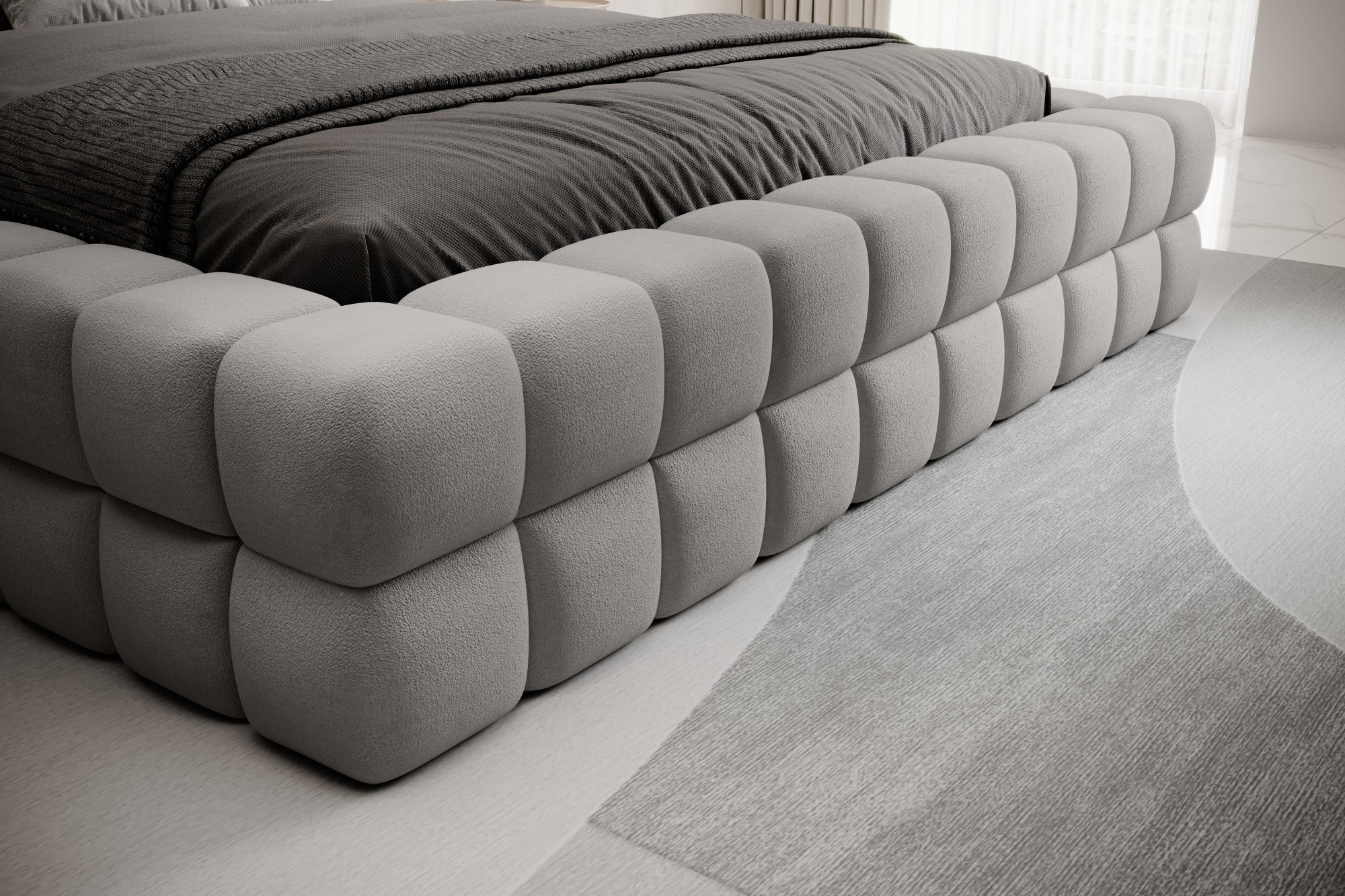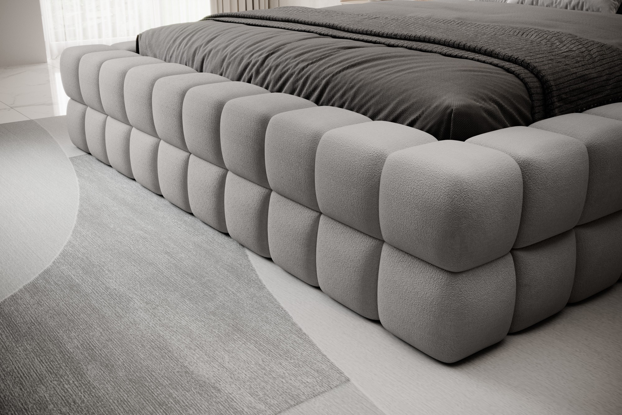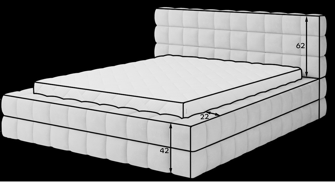 The Dizzle Bed in the version with a width of 140 cm is the ideal solution for those who value compact dimensions without compromising on sleep comfort. This bed combines modern design with functionality. It uses T2130 foam, ensuring elasticity and comfort. With three different width options, the choice of 140 cm provides optimal space for relaxation. The length of the bed is 225 cm, and its impressive height of 104 cm gives it an elegant appearance.The seat height is 42 cm; however, remember to add the mattress height to achieve full sleep comfort. Black plastic legs with a height of 2 cm ensure stability. The metal frame guarantees the durability of the construction, and one storage compartment makes the Dizzle Bed 140 also a practical place for storing additional items.With 36 slats for even mattress support, the Dizzle Bed, with its shape resembling an elegant cube, introduces unique design and comfortable relaxation to your bedroom.