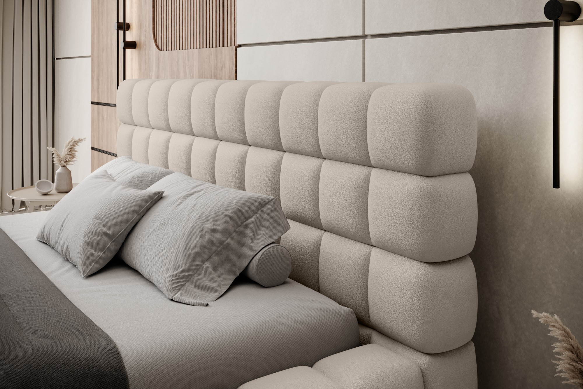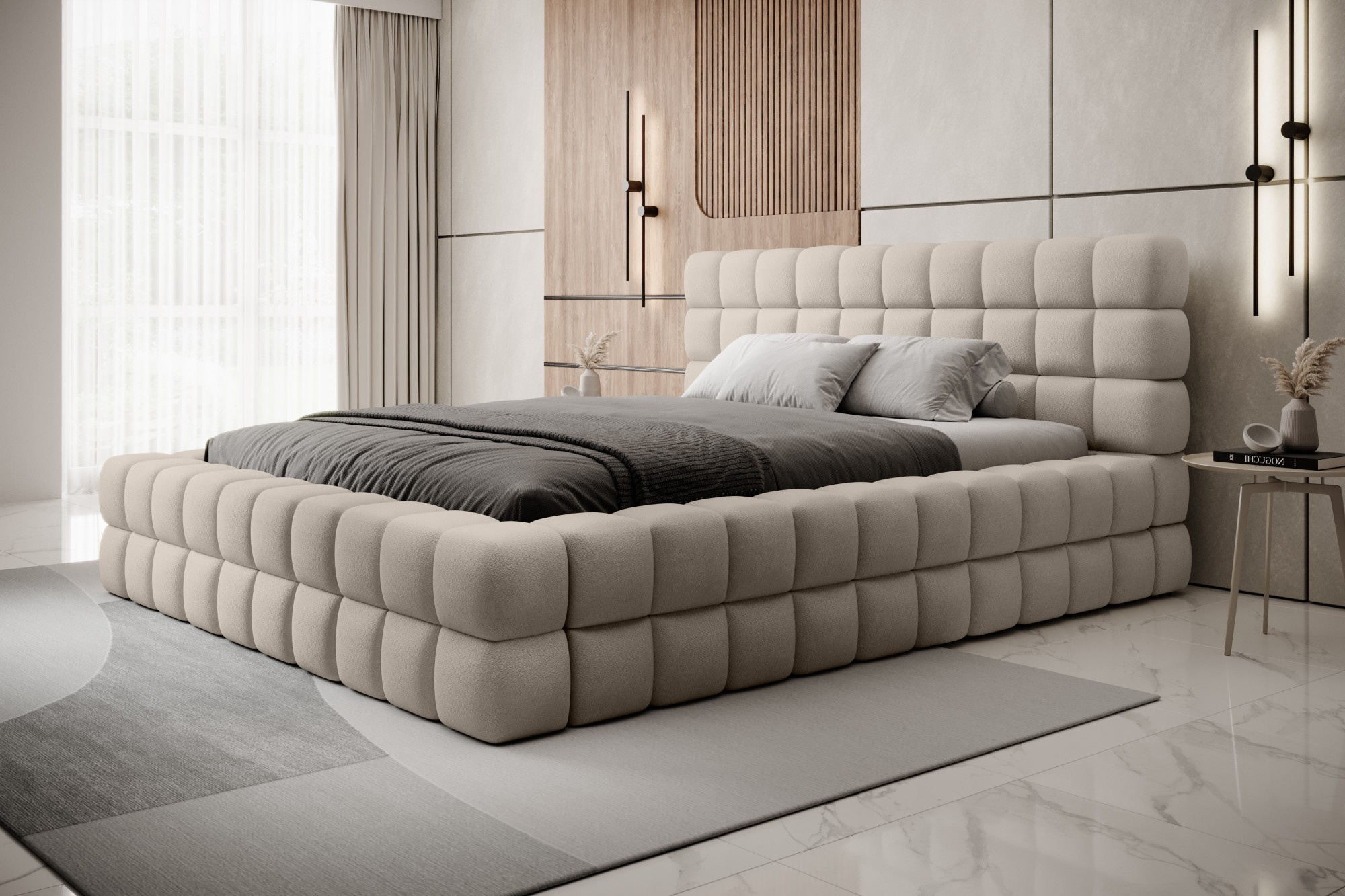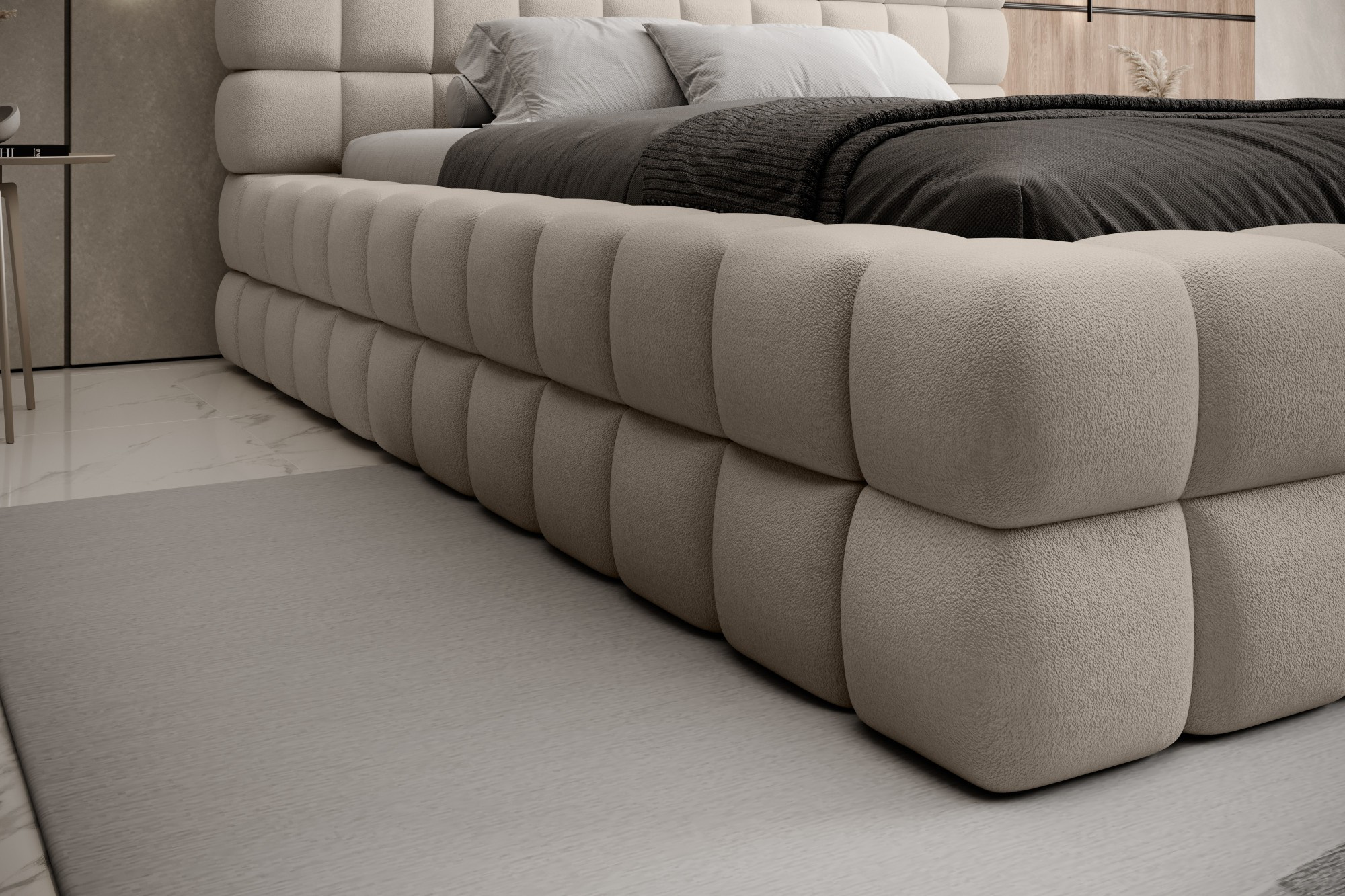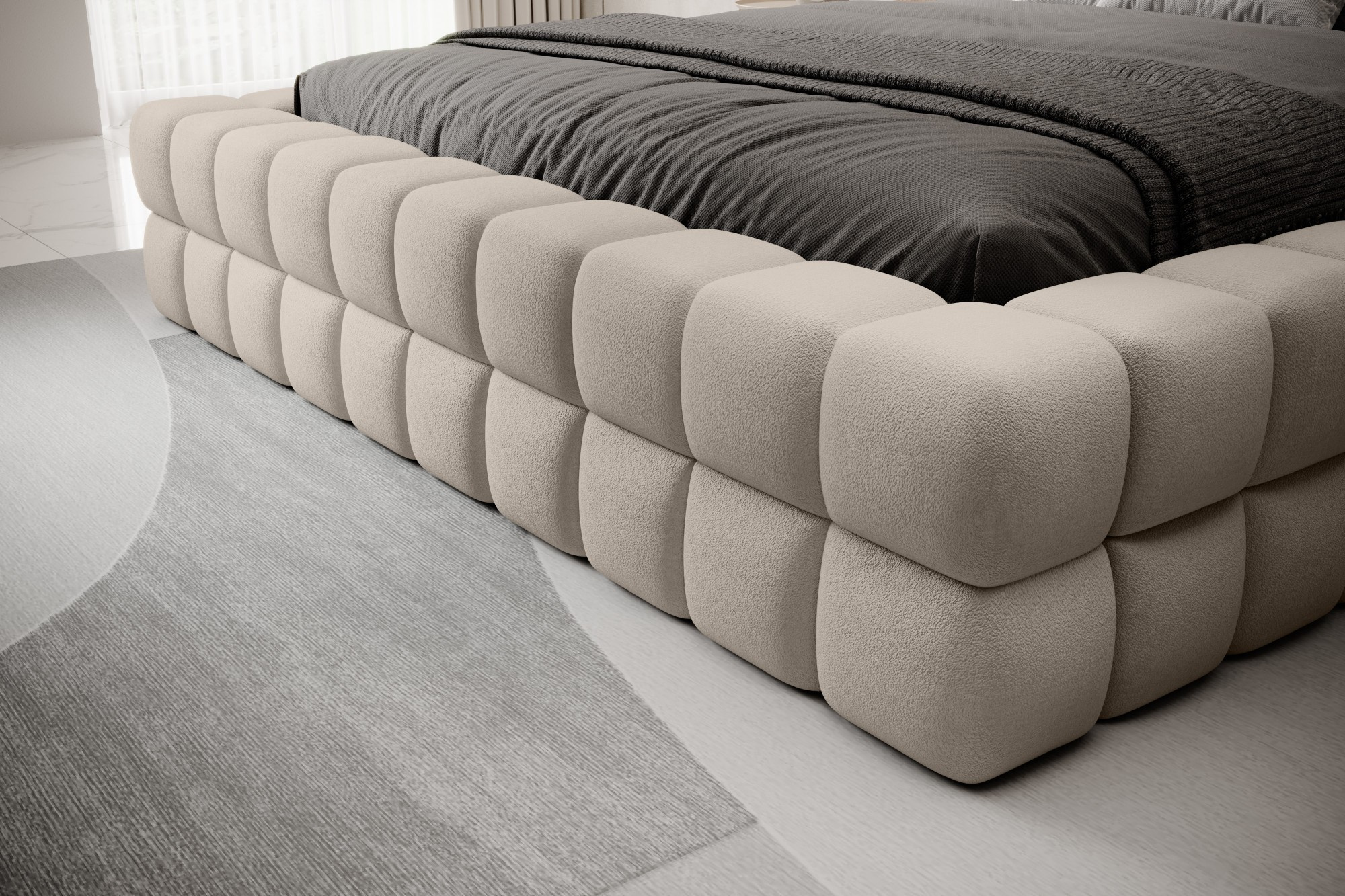 The Dizzle Bed in the version with an impressive width of 180 cm is the perfect solution for those who desire even more space for sleep, without sacrificing elegance and comfort. It utilizes T2130 foam, providing elasticity and a unique sleep comfort. With three different width options, 180 cm is a proposal for enthusiasts of spaciousness. The length of the bed is 225 cm, and its impressive height of 104 cm adds elegance to the entire construction.The seat height is 42 cm; however, it is recommended to add the mattress height for full usability comfort. Black plastic legs with a height of 2 cm ensure stability. The metal frame guarantees the durability of the construction, and one storage compartment makes the Dizzle Bed 180 a practical place for storing additional items.With 36 slats for even mattress support, the Dizzle Bed, whose shape resembles an elegant cube, introduces not only spaciousness but also stylish design and comfortable relaxation into your bedroom.