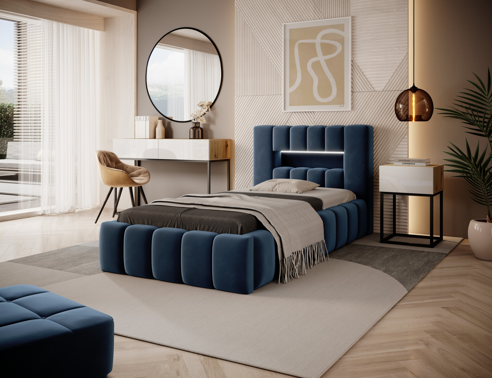 Lamica is a very comfortable, soft and original glamour style bed, which impresses with its unprecedented shape and form. This furniture consists of a body and a wooden frame. It also has a container for bedding. The size of the sleeping surface of 90x200 cm provides adequate space for a relaxing rest. Our bed is distinguished by its workmanship, as the high headrest and sides of the bed, are made of additional foam. The aesthetic experience is enhanced by longitudinal, extensive quilting. A wide range of color options makes it easy to match the bed with the entire room. Another advantage is the headrest with LED lighting, thanks to which rest will be even more pleasant. In this case, modernity and modernistic finish, goes hand in hand with elegance by which Lamica will always be an ideal choice. It is certainly worth having.