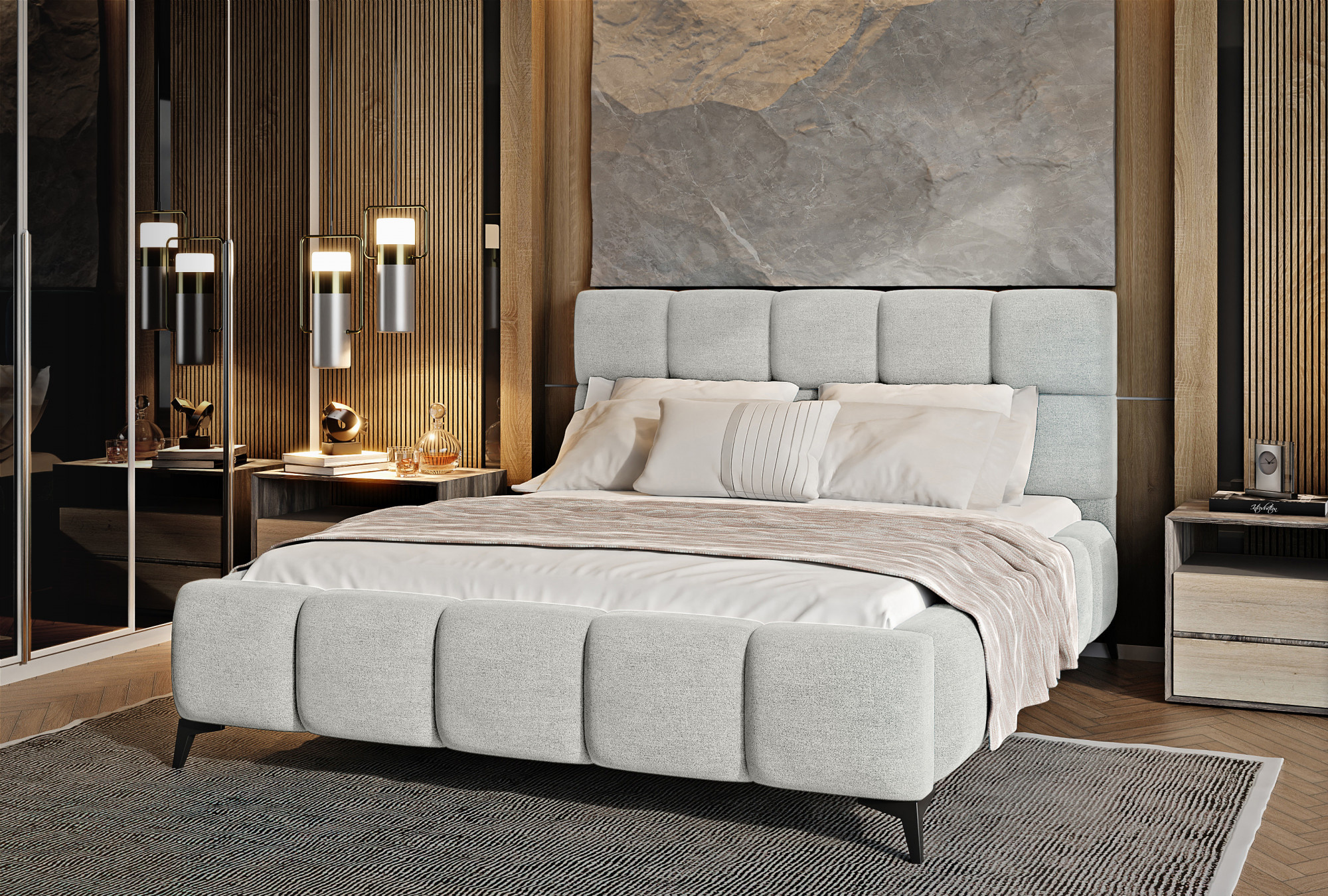 The Mist bed is a combination of modern design and glamour style, which brings a touch of elegance to any bedroom. The headrest has a soft foam filling covered with high-quality upholstery. Quilting, which decorates the Mist bed, adds style and character, and brings an air of modernity.The furniture is available in three widths of sleeping surface: 140, 160, 180 x 200 centimeters. This makes it easier to adjust the bed to the conditions in the apartment. Black steel legs with a length of as much as 13.5 centimeters make the bed give the impression of floating above the ground, which further optically enlarges the room in which the Mist bed will be placed. In addition, the furniture is also equipped with a bedding container, which is a very good solution for small spaces and allows you to keep the bedroom tidy.