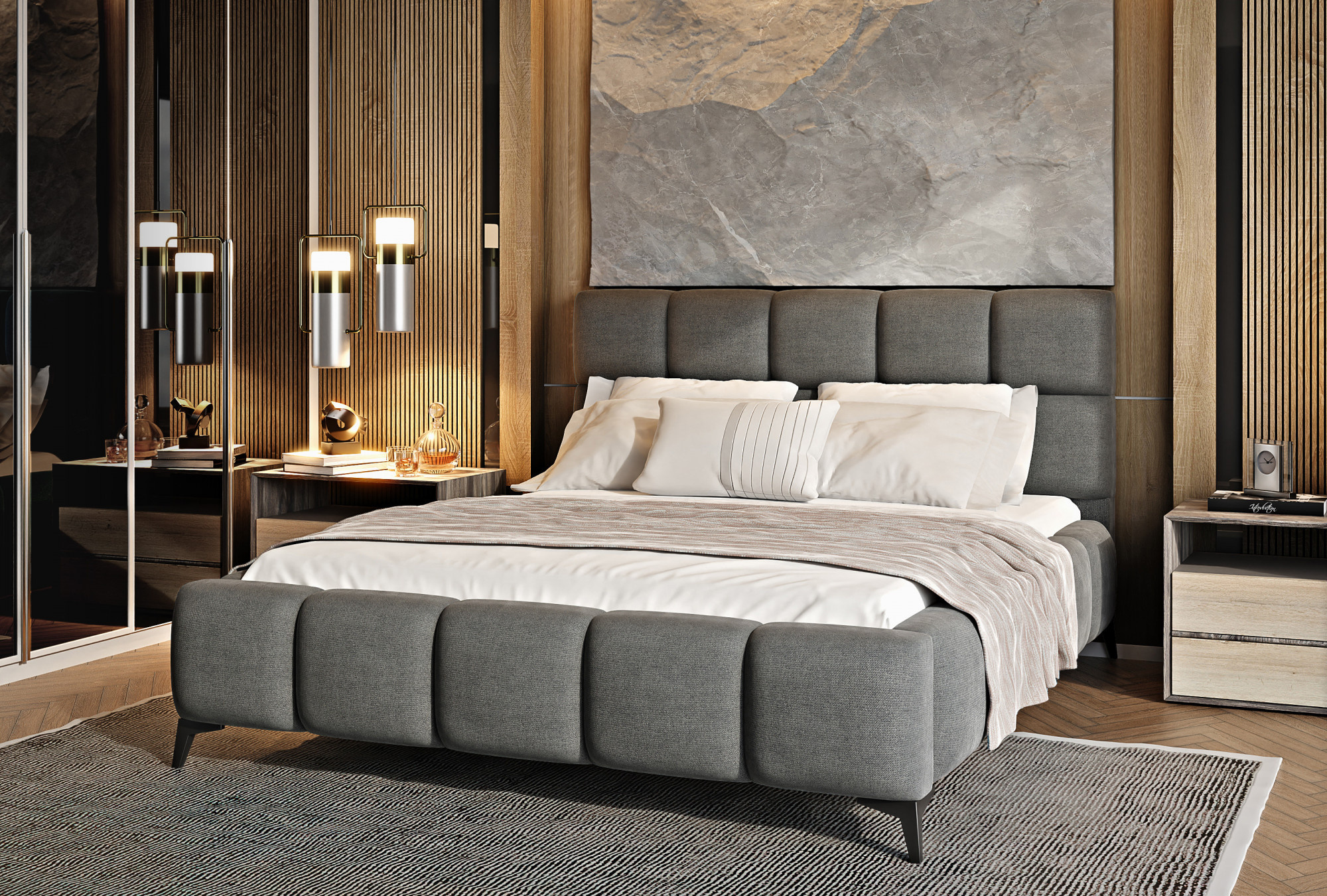 The Mist bed is a combination of modern design and glamour style, which brings a touch of elegance to any bedroom. The headrest has a soft foam filling covered with high-quality upholstery. Quilting, which decorates the Mist bed, adds style and character, and brings an air of modernity.The furniture is available in three widths of sleeping surface: 140, 160, 180 x 200 centimeters. This makes it easier to adjust the bed to the conditions in the apartment. Black steel legs with a length of as much as 13.5 centimeters make the bed give the impression of floating above the ground, which further optically enlarges the room in which the Mist bed will be placed. In addition, the furniture is also equipped with a bedding container, which is a very good solution for small spaces and allows you to keep the bedroom tidy.