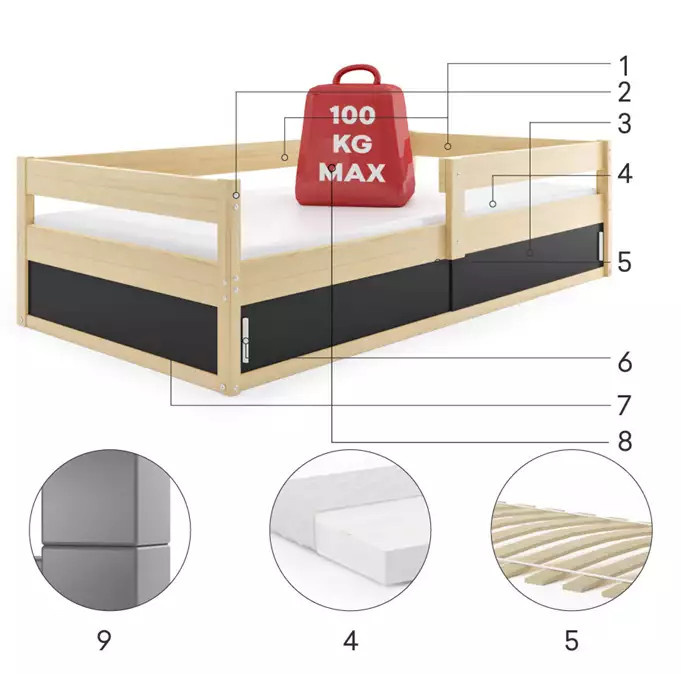 - Rama łóżka z drewna sosnowego pomalowana lakierem wodnym.