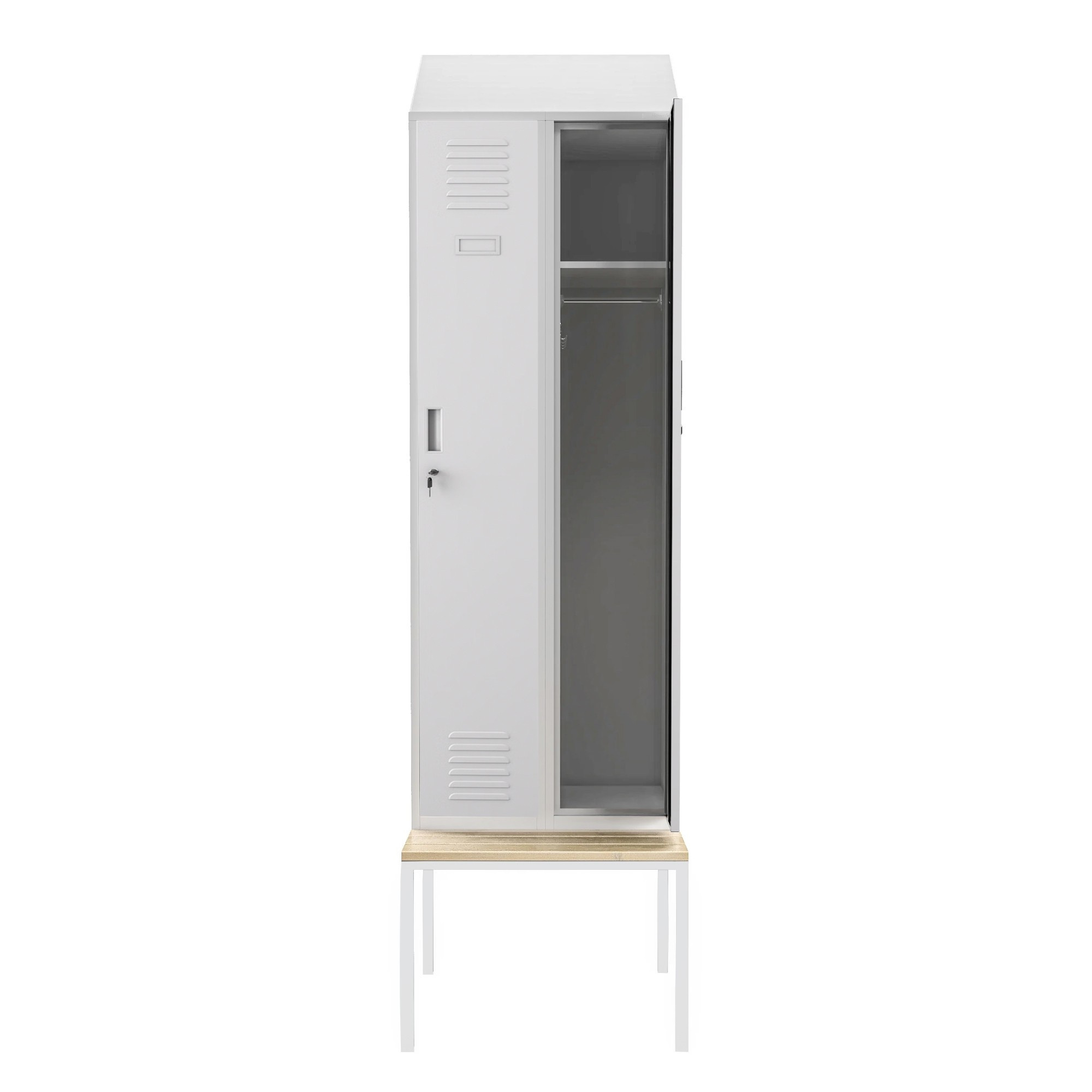 Mindkét zárható rekesz erős zárral van felszerelve, amely megvédi a tárolt tárgyakat az illetéktelen hozzáféréstől. A felhasználók így biztonságosan tárolhatják személyes tárgyaikat, értékeiket és munkaeszközeiket. Két független rekesz lehetővé teszi a szekrény egyidejű használatát két személy számára, ami ideális közös terekhez.