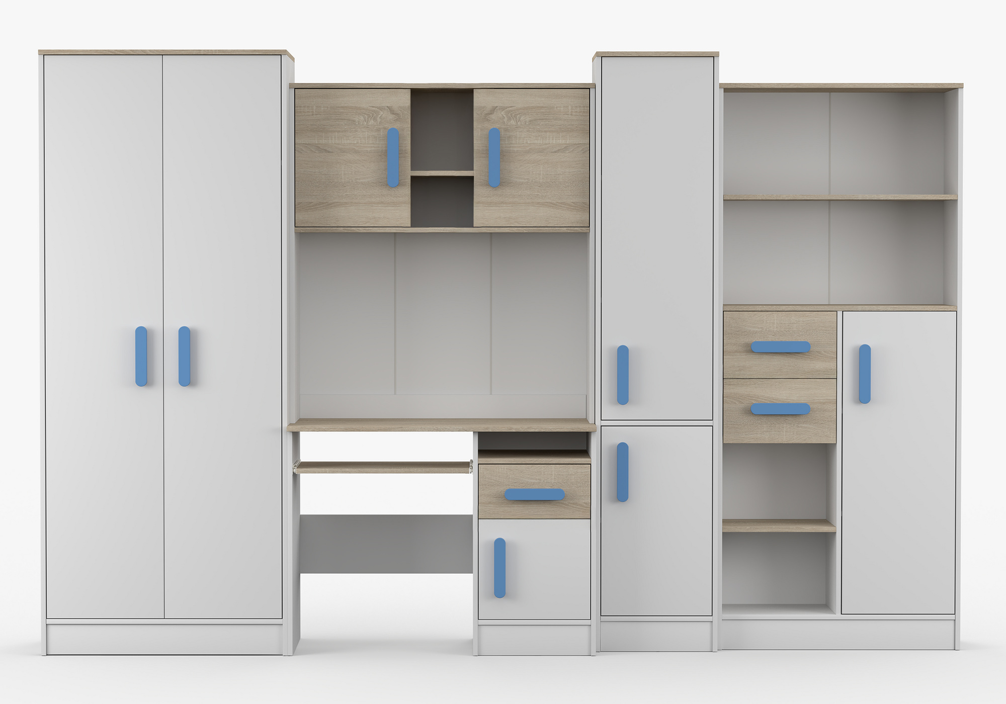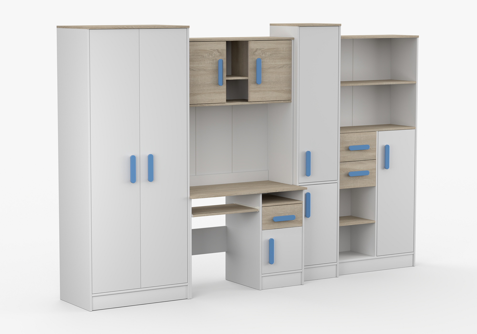 A MACIUS gyerekbútor egy 5 részes bútorkészlet, amely elengedhetetlen egy tinédzser szobájában. A legfontosabb része az összeállításnak az íróasztal, amely tágas szekrénnyel és nagy fiókkal van felszerelve. Van egy kihúzható billentyűzettartó polca és egy nyitott polca az apró kiegészítők számára, amelyeket kéznél szeretne tartani. Biztosítson gyermekének kényelmes helyet a házi feladatok elkészítéséhez. Az asztal fel van szerelve egy toldalékkal.A készlet része egy kétszárnyú szekrény is. A szekrény belsejében találunk egy polcot és egy ruhafogast a ruhák felakasztására. A készlet következő része egy egylapos polcos szekrény és egy polcos állvány. A bútor összeállítás nem tartalmaz falra szerelhető lapot az íróasztal és az íróasztal fölötti toldalék között.