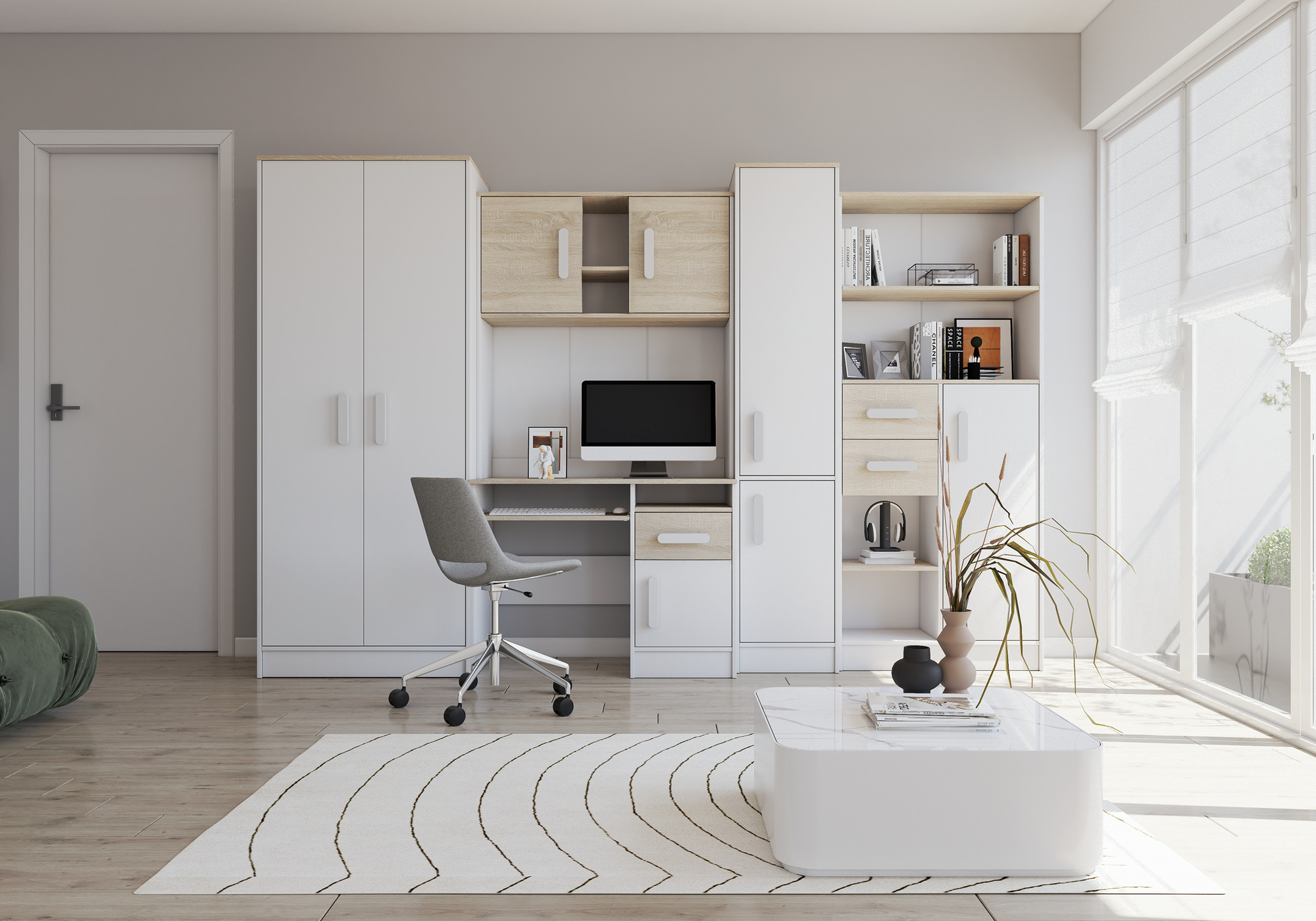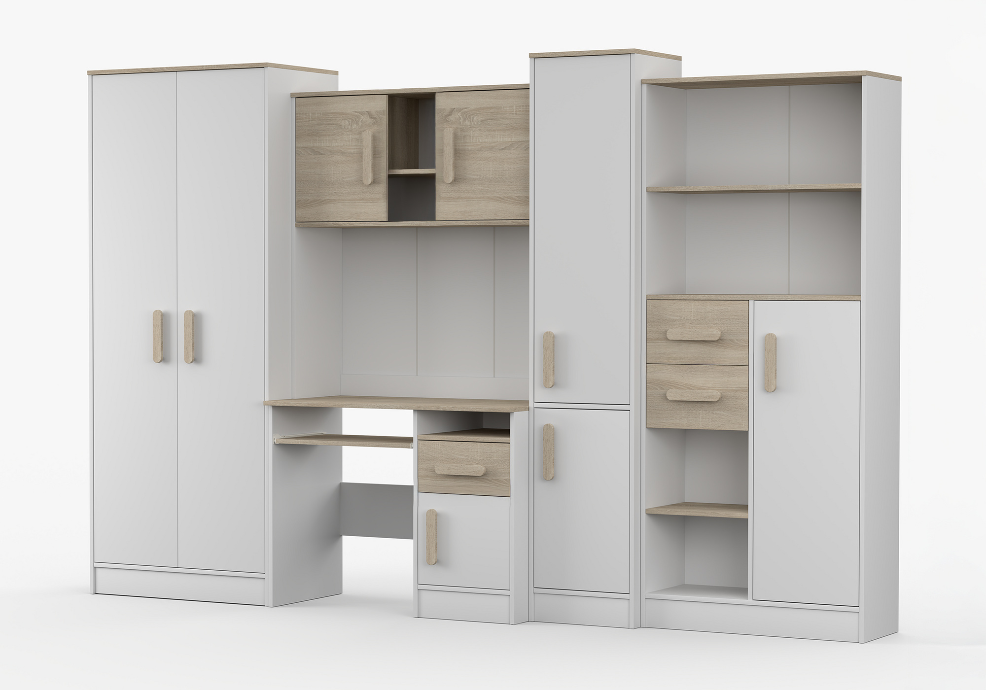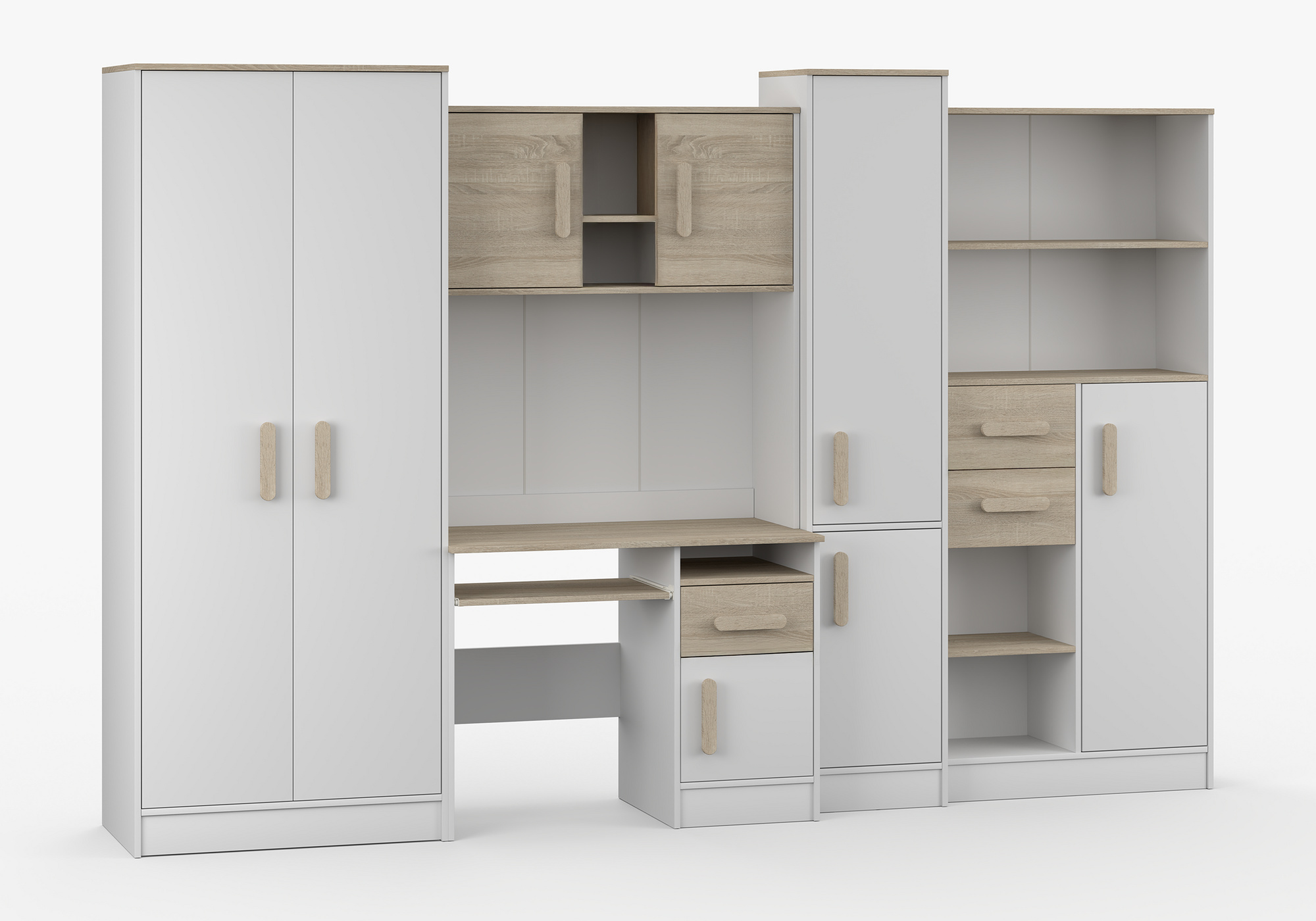 A MACIUS gyerekbútor egy 5 részes bútorkészlet, amely elengedhetetlen egy tinédzser szobájában. A legfontosabb része az összeállításnak az íróasztal, amely tágas szekrénnyel és nagy fiókkal van felszerelve. Van egy kihúzható billentyűzettartó polca és egy nyitott polca az apró kiegészítők számára, amelyeket kéznél szeretne tartani. Biztosítson gyermekének kényelmes helyet a házi feladatok elkészítéséhez. Az asztal fel van szerelve egy toldalékkal.A készlet része egy kétszárnyú szekrény is. A szekrény belsejében találunk egy polcot és egy ruhafogast a ruhák felakasztására. A készlet következő része egy egylapos polcos szekrény és egy polcos állvány. A bútor összeállítás nem tartalmaz falra szerelhető lapot az íróasztal és az íróasztal fölötti toldalék között.