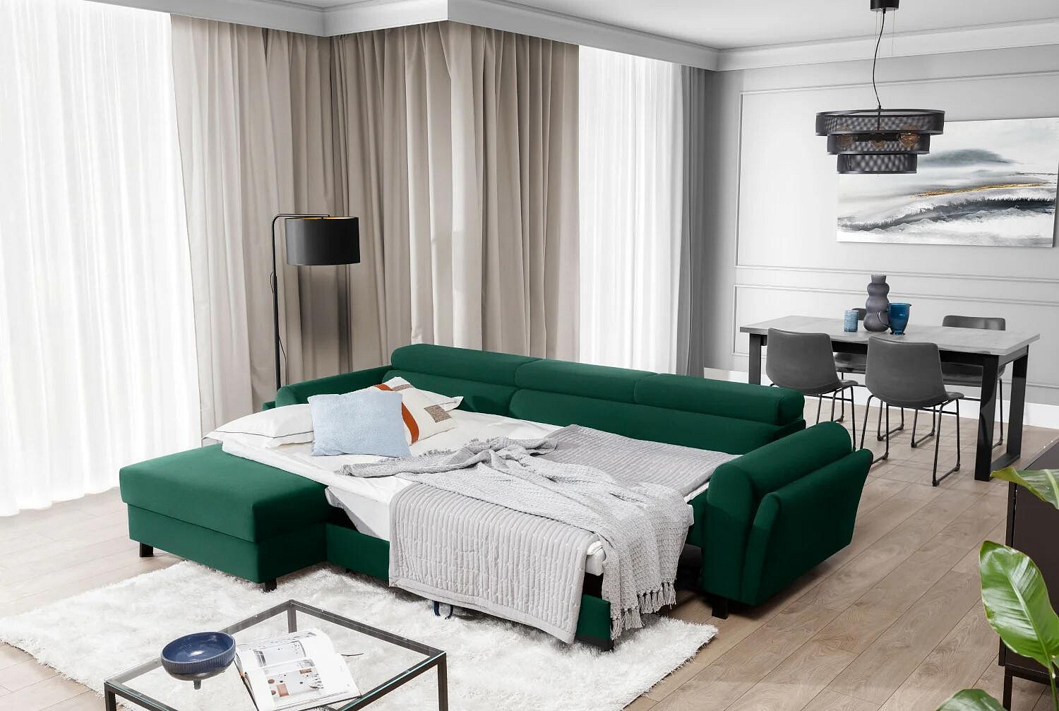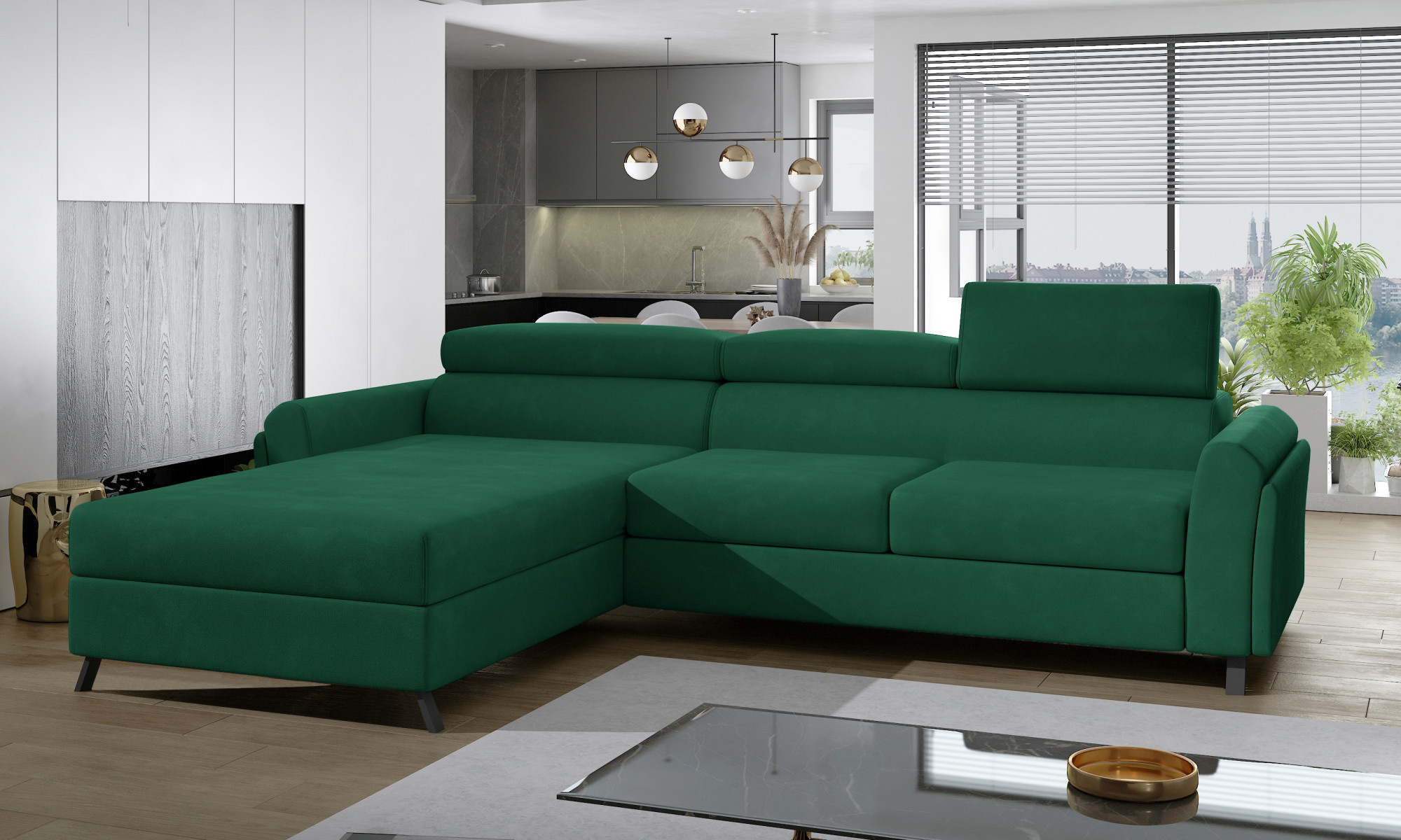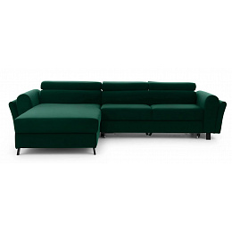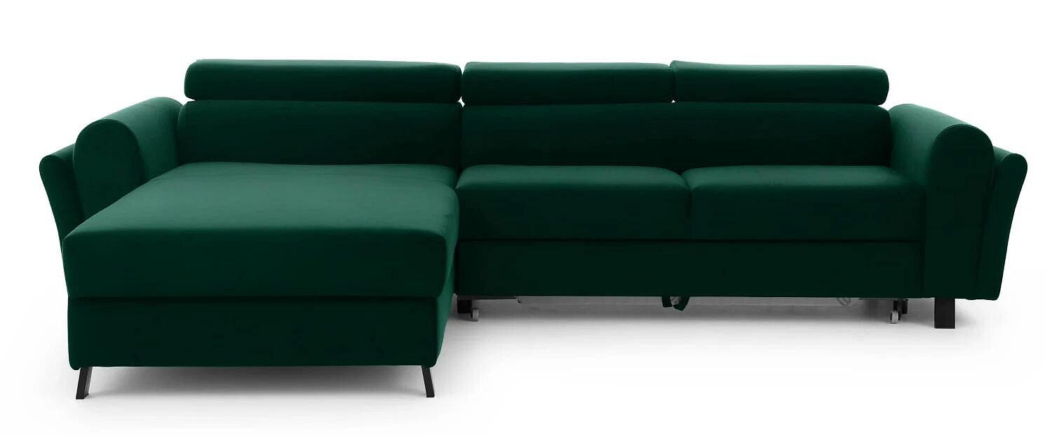 Mariall is a classic, yet comfortable and chic L-shaped corner sofa, measuring 300 x 190 x 98 cm. Its distinguishing features include: adjustable headrests, upholstered back of the sofa, elegant metal legs with wooden finish and deep, soft seat made of innovative T30 and HR foam, which are resistant to deformation and damage. In addition, they guarantee maximum comfort both during daytime relaxation and while sleeping. Due to its sleeping function, Mariall is a multifunctional piece of furniture. After unfolding the sofa using the intuitive and uncomplicated dolphin mechanism, we get a spacious bed of 110 x 240 cm, as well as a capacious, deep bedding compartment located in the ottoman. If you are looking for a functional, yet classic and elegant piece of furniture - there can be only one choice - with a clear conscience we recommend the Mariall corner sofa, which is the answer to all questions.