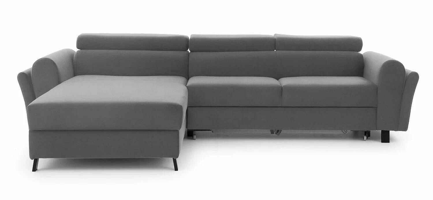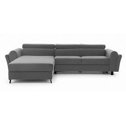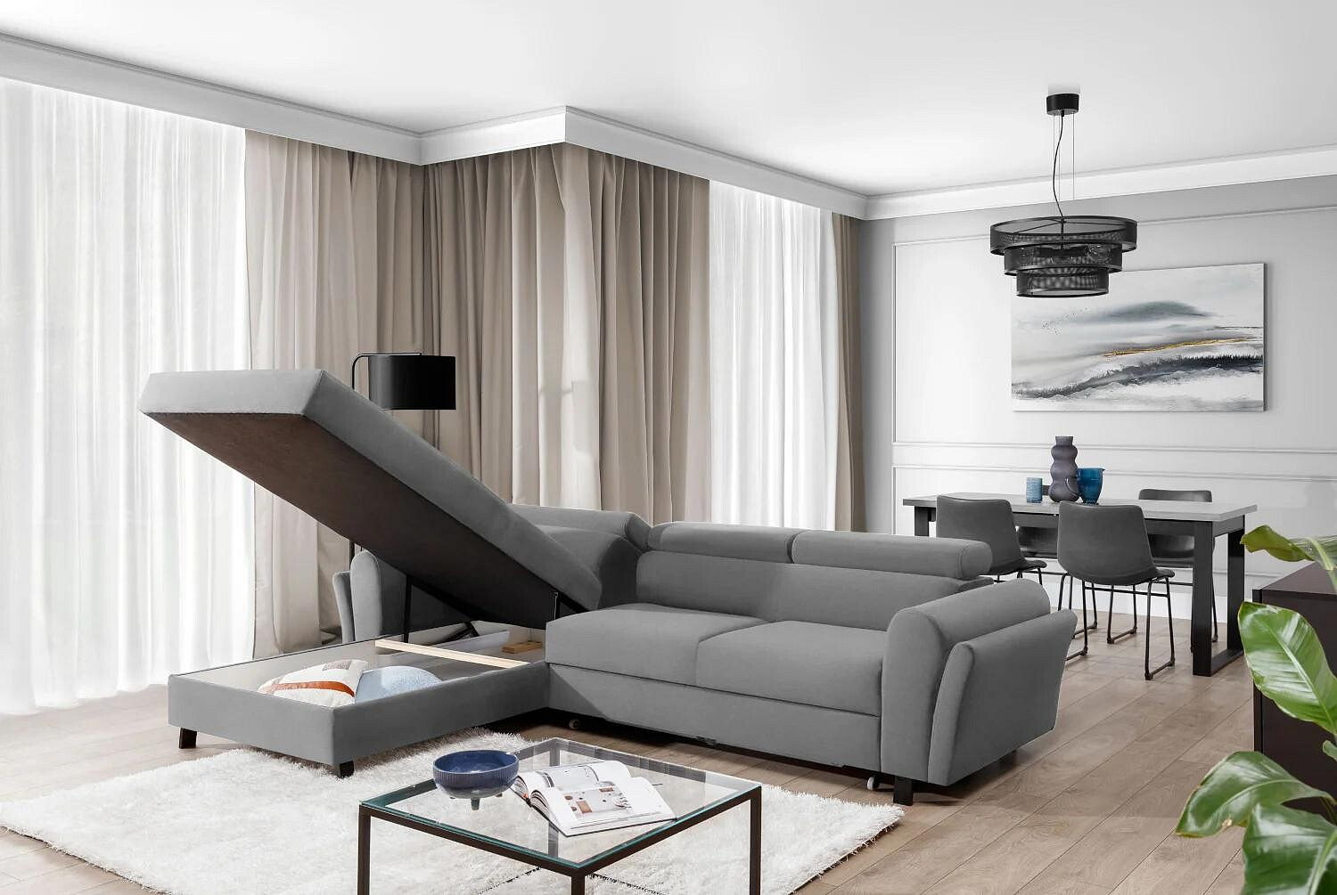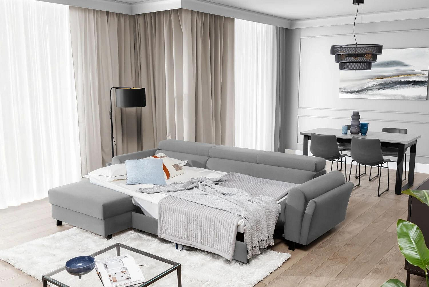 Mariall is a classic, yet comfortable and chic L-shaped corner sofa, measuring 300 x 190 x 98 cm. Its distinguishing features include: adjustable headrests, upholstered back of the sofa, elegant metal legs with wooden finish and deep, soft seat made of innovative T30 and HR foam, which are resistant to deformation and damage. In addition, they guarantee maximum comfort both during daytime relaxation and while sleeping. Due to its sleeping function, Mariall is a multifunctional piece of furniture. After unfolding the sofa using the intuitive and uncomplicated dolphin mechanism, we get a spacious bed of 110 x 240 cm, as well as a capacious, deep bedding compartment located in the ottoman. If you are looking for a functional, yet classic and elegant piece of furniture - there can be only one choice - with a clear conscience we recommend the Mariall corner sofa, which is the answer to all questions.