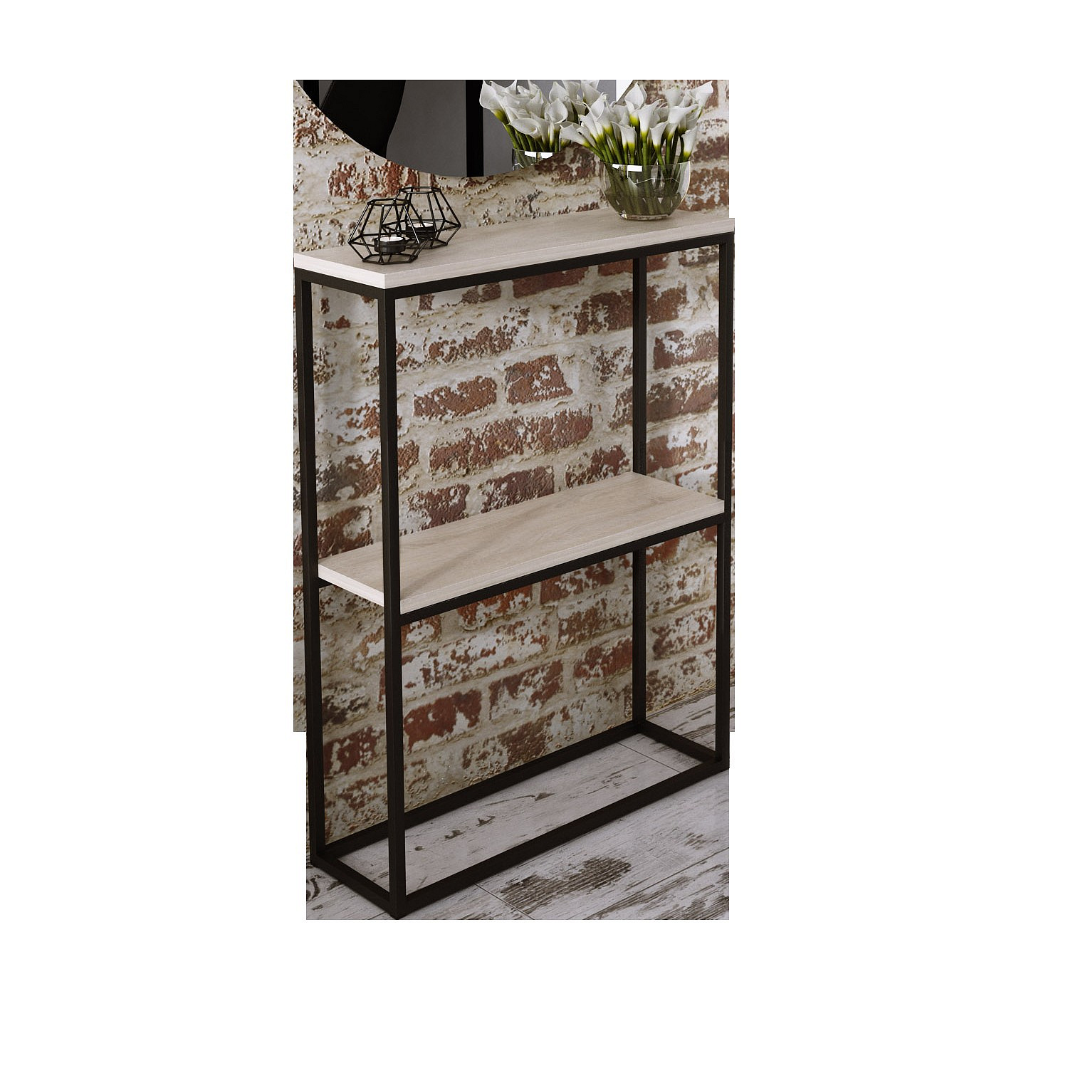 Stílusos és modern MASON konzol az előszobába. A széles deszka rengeteg helyet kínál dekorációk vagy szuvenírek kiállítására. Stílusos kivitelezésének köszönhetően a konzol ipari jelleget kölcsönöz a belső tereknek. A bútorok egyben érkeznek, és nem igényelnek összeszerelést.