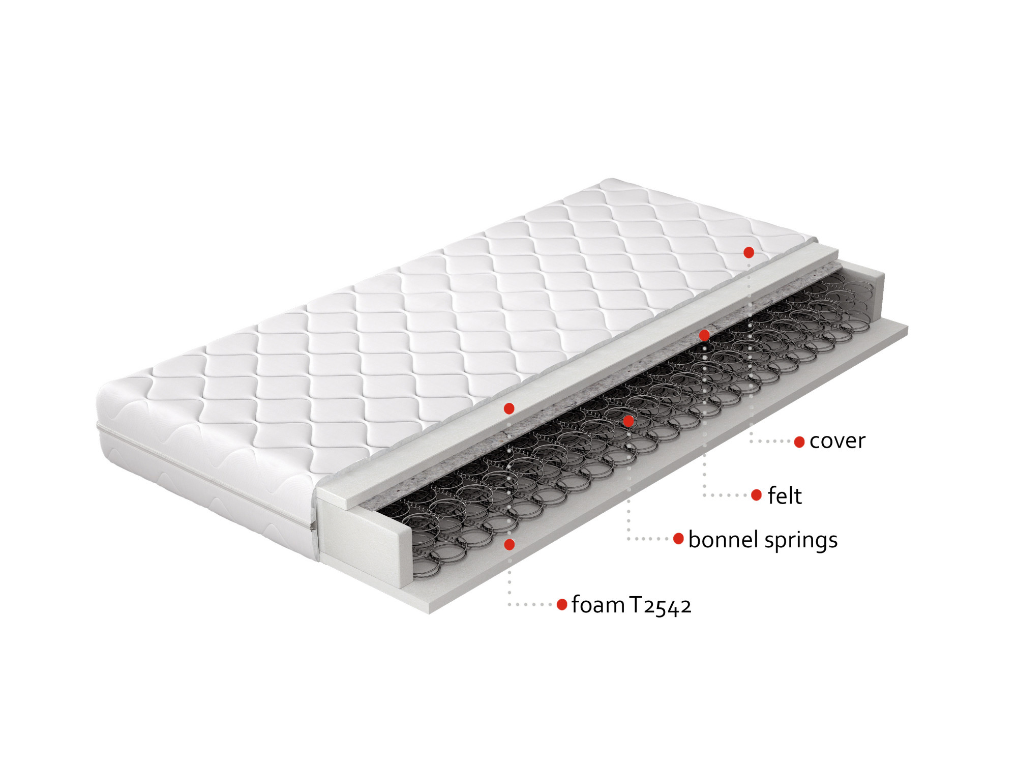The guarantee of a good night's sleep is a perfectly chosen mattress. We know how important this choice is, so we present to you the bonell mattress ORSOLA. Bonell spring is a guarantee that the mattress will not deform during use, which is extremely important for the comfort of sleep. The bonell spring has been covered, on two sides, with a felt pad, on which T2542 foam has been applied on both sides. All this enclosed in a removable cover.