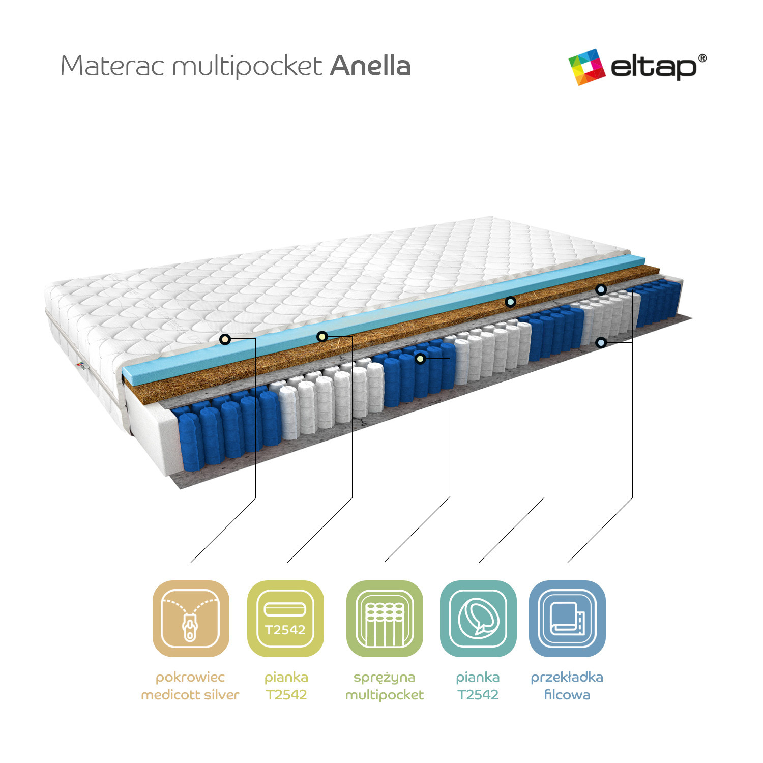The guarantee of a good night's sleep is a well-chosen mattress. We know how important this choice is, which is why we have produced the Anella multipocket mattress in a silver cover. The multipocket spring means that the surface of the mattress does not ripple and is not subject to vibration. In addition, durability and stability is guaranteed by the presence of a coconut board, and T2542 foam will ensure the comfort of rest all this encased in a removable silver cover.