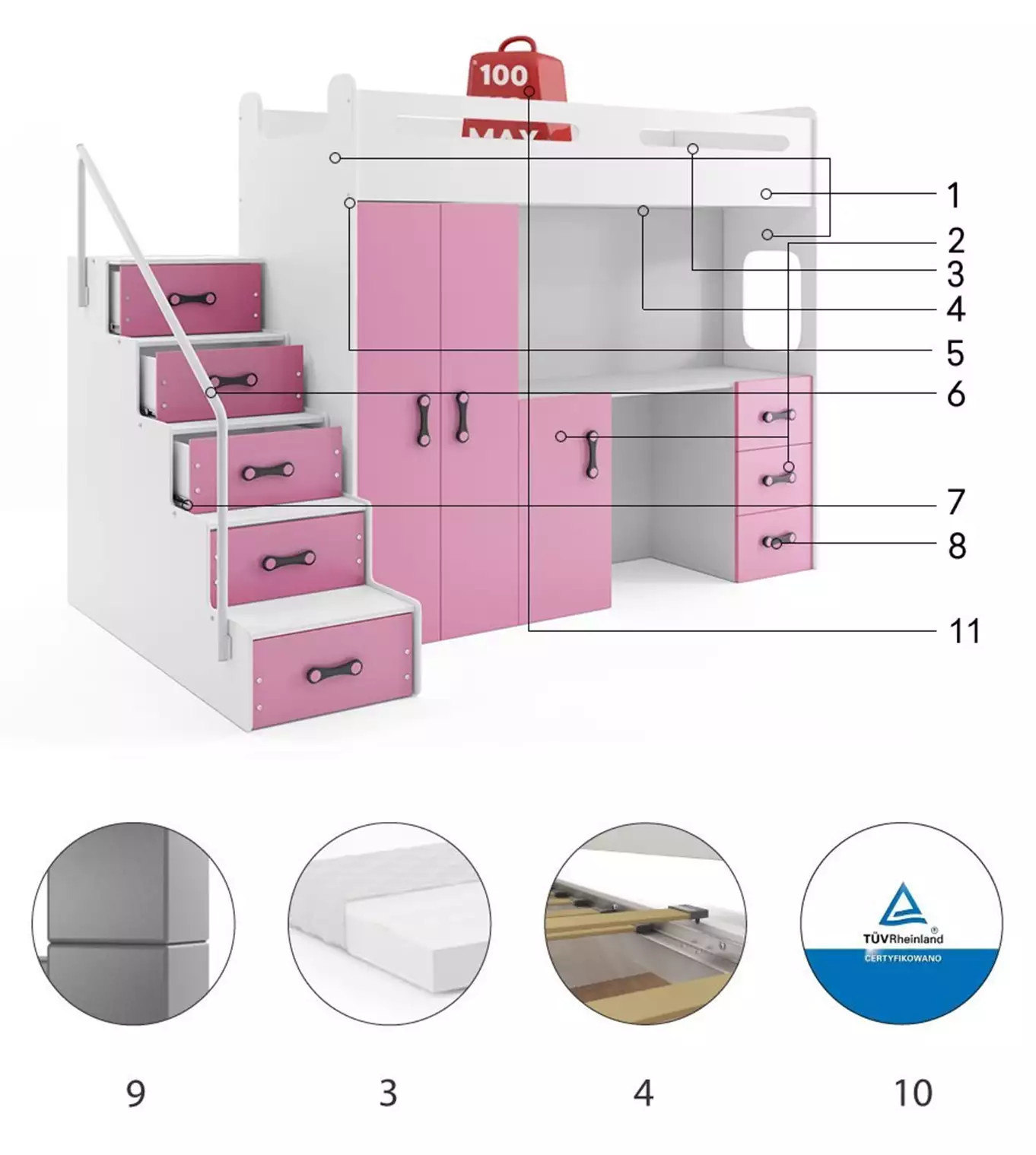 - Certyfikowane łóżko - jakość i bezpieczeństwo zgodnie z normami TUV.