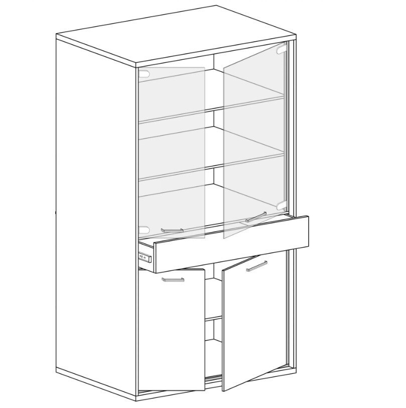 Gondolkodik, milyen bútort helyezzen az étkezőbe? Vitrin a MEDIOLAN kollekcióból természetes hikorifa színben. Kétajtós szekrény kombinációja az alsó részben és üveges vitrin a felső részben. Ez a bútordarab remekül illik olyan helyiségekbe, mint az étkező, dolgozószoba, nappali vagy nappali. Az étkezőben tökéletesen érvényesül a karácsonyi edénykészlet, ha kihasználjuk a polcok világításának lehetőségét. A vitrin illik az ipari stílusú modern elrendezéshez. A vitrin felső részét füstszínű edzett üvegből készült dupla előlap és két laminált deszkából készült polc alkotja. A szekrény alsó részét világos előlapok alkotják fekete fém fogantyúkkal, amelyek mögött polcok találhatók. Az alsó szekrény felett található egy kihúzható fiók, amely érintéssel nyílik. Modern push-to-open rendszer van használatban. Használhat hozzá kiegészítőket, például fekete lábakat, amelyek illeszkednek a fekete lamellákhoz, és tökéletes harmóniát teremtenek. A fiók előlapját tölgyfa deszkával lehet díszíteni. A jobb hatás érdekében használhatunk LED világítást az üvegpolcokhoz és a díszítőlapokhoz.