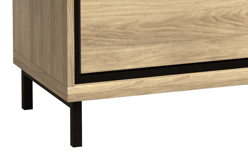 A szekrény felső részén üvegezett felület található, ahol kiállíthatjuk számunkra fontos szuveníreket, apróságokat vagy dekoratív tárgyakat. Az üveg elülső felületek biztonsági edzett üvegből készültek füstös hatással. Középen egy erős laminált deszkából készült polc található. A szekrény alsó részébe viszont elhelyezhetjük azokat a dolgokat, amelyeket csak ritkán használunk. A szekrény tágas alsó része egy polccal van felszerelve, amely nagyon tágassá és funkcionálissá teszi. Az üvegrész alatt található egy kihúzható fiók síneken, amely érintéssel nyitható. A szekrény ajtajai csendes záródású pántokkal vannak felszerelve. További lehetőségek közé tartozik a fekete lábak kiegészítése, a polcok LED világítása és a szépen faragott tölgyfa lap, mint a fiók előlapja. A konnektort is meg lehet világítani, így érdekes hangulatot teremtve a belső tereinkben.
