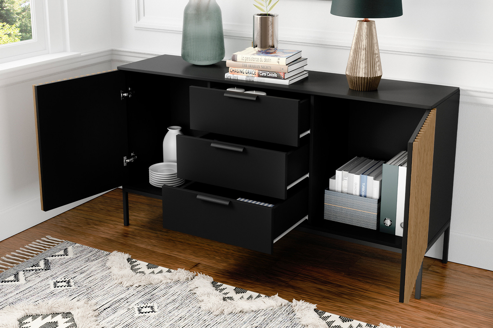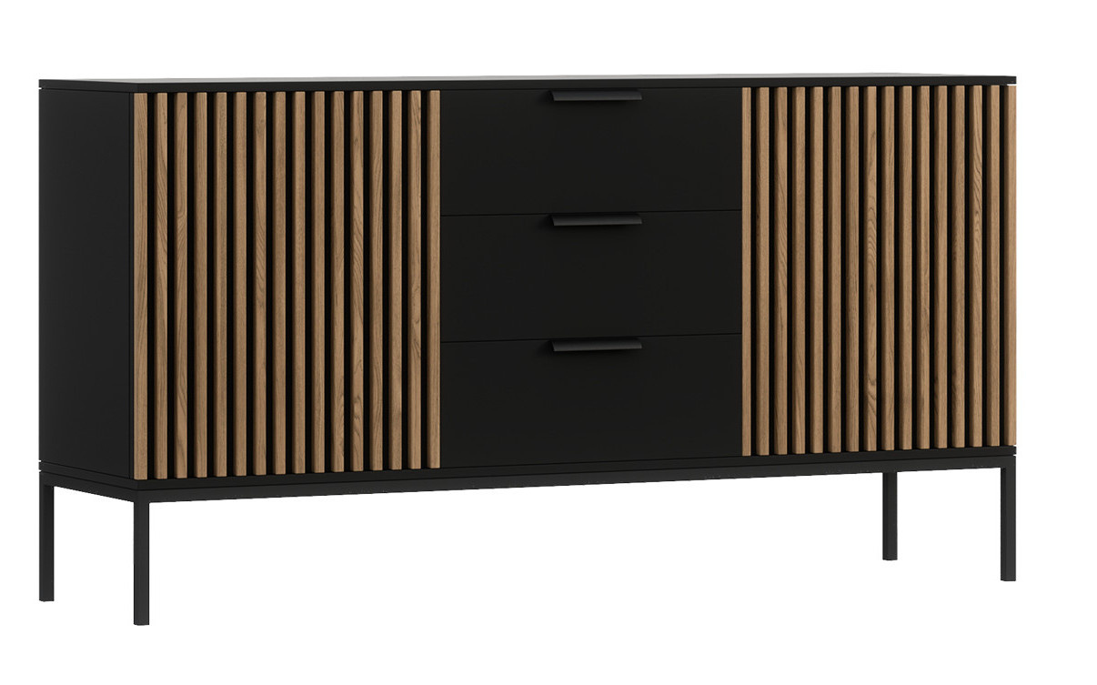 The black Meorati sideboard is an elegant and practical piece of furniture that fits perfectly in modern interiors. It has been designed to provide adequate storage space for various items. The depth of the product is 40 cm, the width is 150 cm, and the height is 80 cm, offering sufficient space for storage. The sideboard is equipped with two pairs of doors and three drawers, which facilitate organization of stored items. The doors have contrasting light carved fronts, adding a unique and stylish character to the furniture. The material used in the production of the sideboard is high-quality board, which is durable and solid. Both the drawers and the body of the sideboard have ABS edges, which further enhance the durability of the furniture and prevent potential damage. The legs of the sideboard are made of metal, guaranteeing stability and sturdy support. They have a height of 20 cm, elevating the sideboard slightly above the floor, giving it a sense of lightness and elegance. The thickness of the board used in the production is 16 mm, ensuring a solid construction of the furniture. As a result, the sideboard is durable and sturdy. The black Meorati sideboard is not only a functional piece of furniture but also an elegant addition to any interior. Its black finish gives it a modern look that blends perfectly with various decoration styles. With its ample capacity and practical layout, the Meorati sideboard is an excellent solution for storing various items in your home.