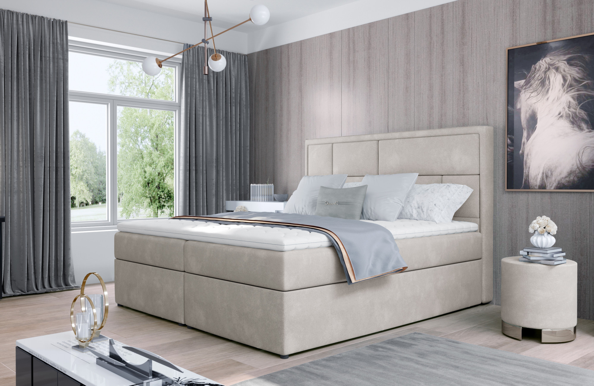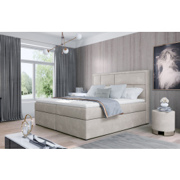 Meron is a tasteful, elegant, perfectly soft and comfortable boxspring continental bed in modern classic style, which is available in three sizes: 140/ 160/ 180 x 200 cm. The exceptional comfort is enhanced by the high 53 centimeter seat and filling of the bed. The bonell mattress and T25 foam gives the user of the furniture the highest comfort and perfectly stabilizes the position of the body during rest. Such a solution guarantees a comfortable rest for everyone, because, after all, a healthy sleep is a good sleep! In addition to the considerable comfort, it is also worth noting the finish of the individual elements of the Meron model. The high headrest, stitched into the shape of irregular rectangles, is both a soft, comfortable and invaluable support, as well as an interesting decoration of the bedroom. Thanks to two spacious bedding containers - our boxspring is not only a functional accessory for the apartment, but also its own oasis of peace, making the use of such a bed - a real pleasure. It is worth having such a bed as Meron in your apartment - satisfaction guaranteed.