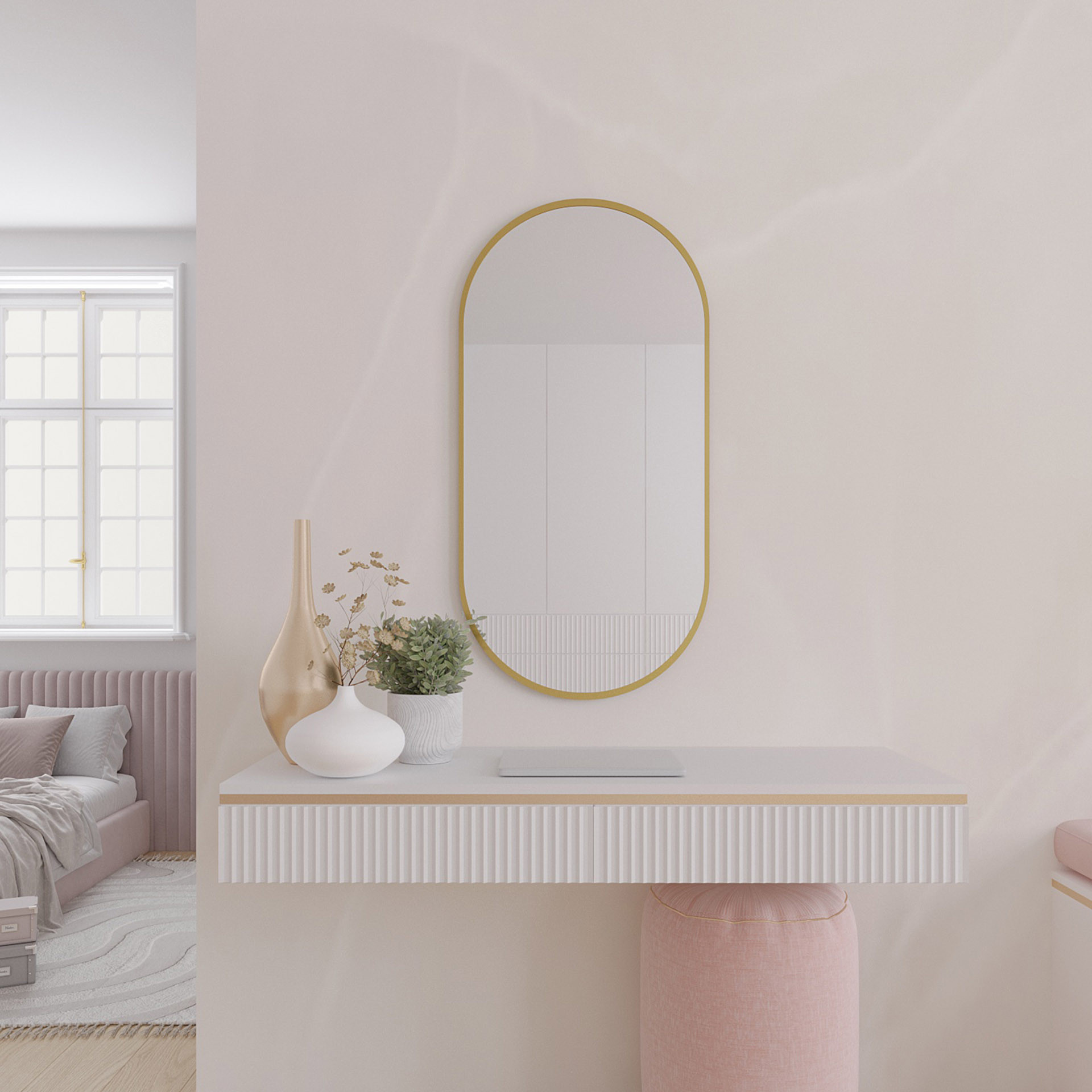 The Micedi mirror is an elegant mirror with a golden frame and rounded edges that adds charm and style to any room. It is a beautiful mirror with dimensions of 50 cm width, 100 cm height, and 4 cm depth of the mirror panel. It is sturdy and durable, weighing 11 kg. The Micedi mirror comes with two hooks that facilitate hanging it on the wall, along with four screws measuring 2x51 mm and four expansion plugs measuring 8x50 mm, providing secure mounting. The mirror is easy to install. The package dimensions for the delivered mirror are 107x57x7 cm. One set of the Micedi mirror is packed in a single package. All components are carefully packaged to ensure safe transportation. The Micedi mirror is an excellent choice if you are looking for a beautiful and stylish mirror that adds elegance and character to your interior.