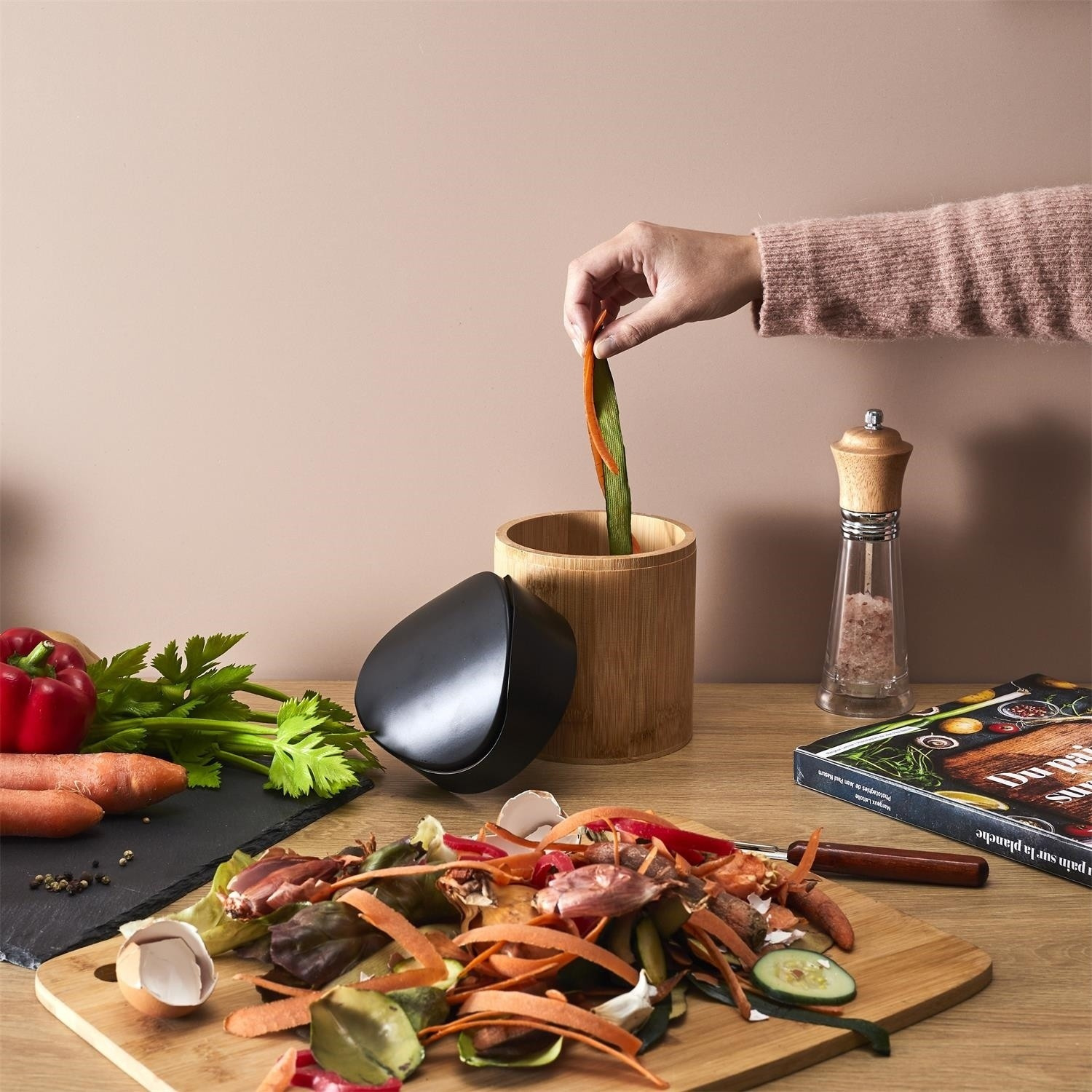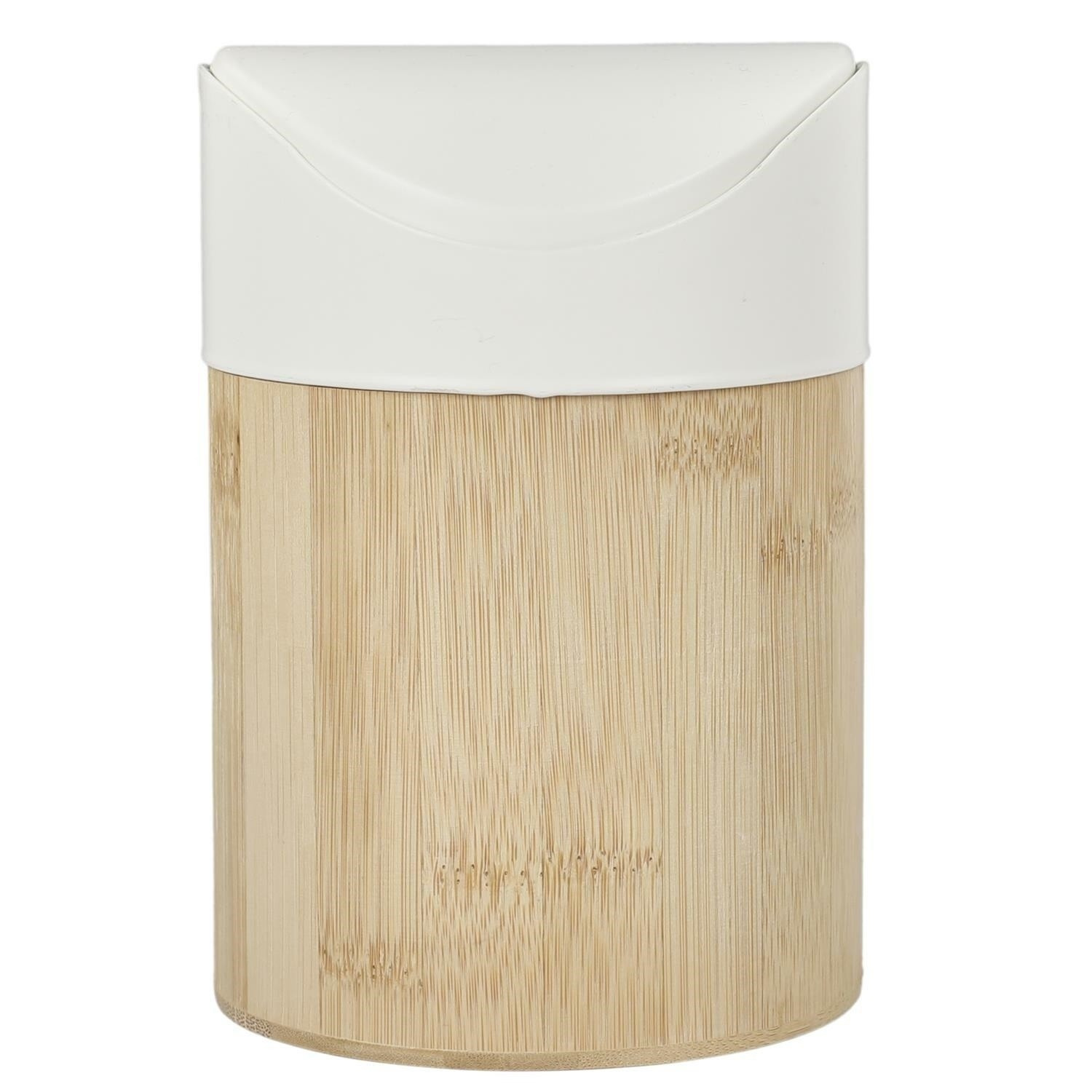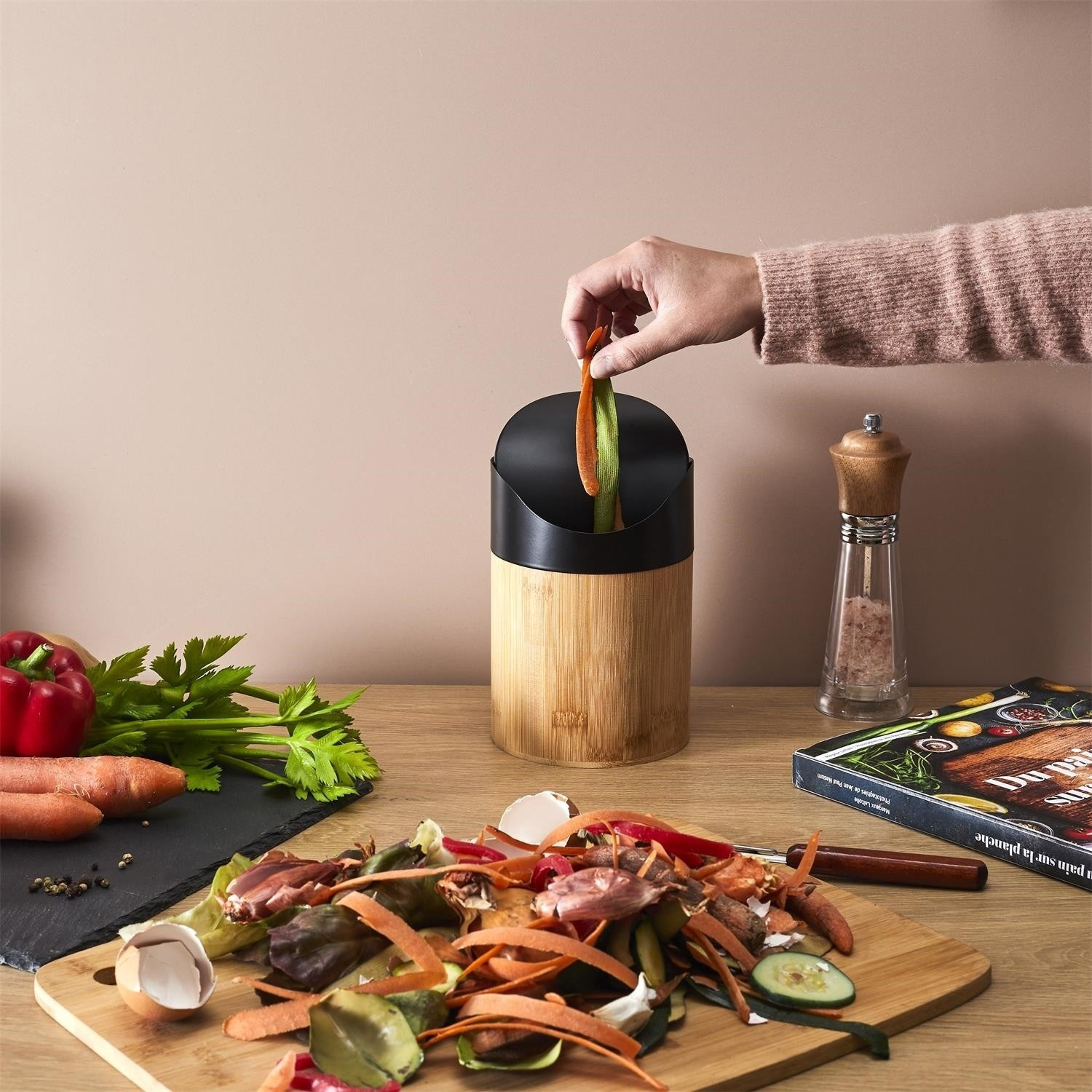 A bambuszfából készült mini kosár ideális edényként szolgál komposztálóként vagy szerves hulladék tárolására a konyhában. A forgó fedéllel ellátott mini kuka beválik az ételek elkészítésekor, és ideális mini szemetes konténer lesz például. a fürdőszobában vagy az irodában. Térfogat 1 liter. Műanyag burkolat. Bambuszfa korpus.