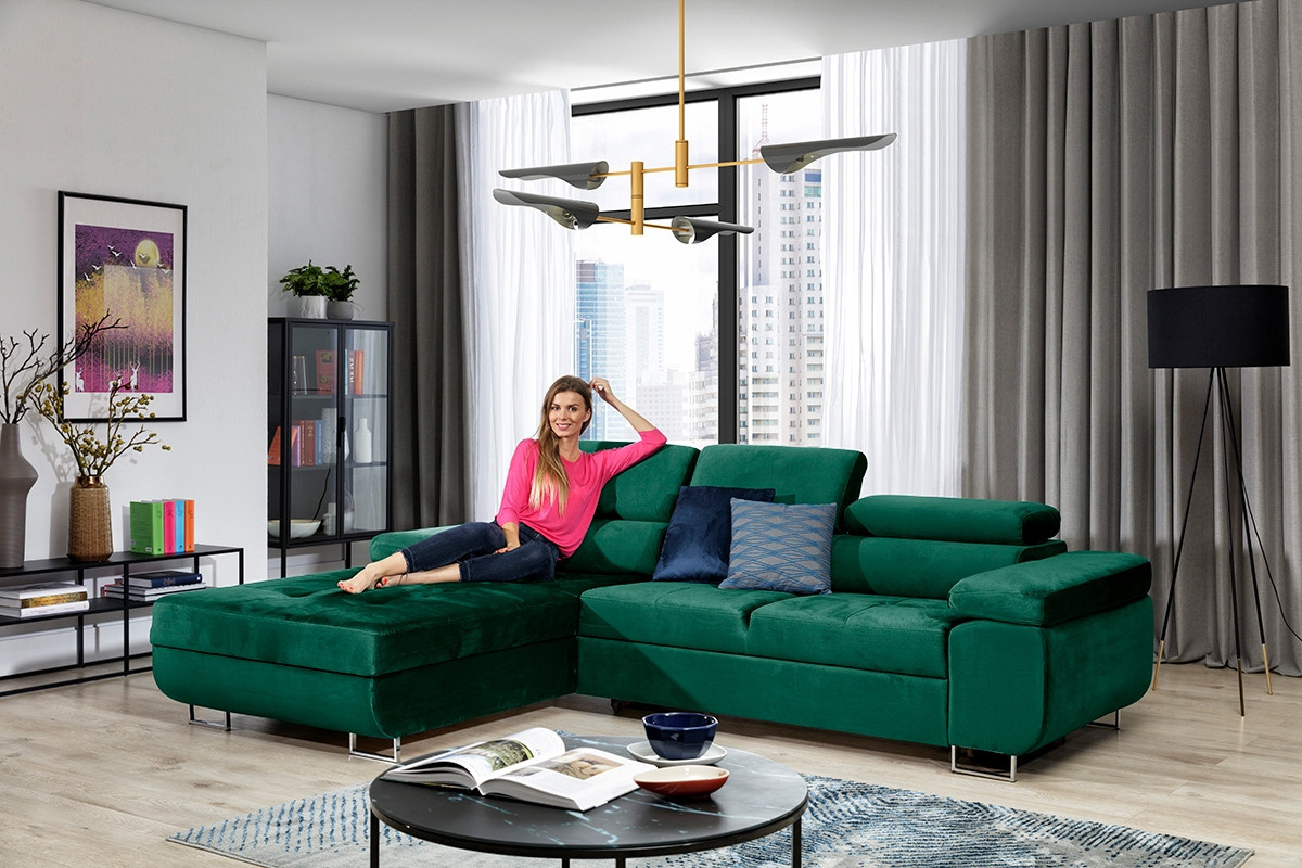 Chceš útulně zařídit svůj obývací pokoj? Hledáte rohovou sedačku, která bude plnit jak dekorativní, tak i užitkovou funkci? Bezpochyby tento model bude pro tebe trefou do černého! Jeho odstín v barvě tmavé zeleně dodá místnosti výraz a dokonale ji oživí. Má dekorativní prošívání a funkční pohyblivé opěrky hlavy, díky čemuž je velmi praktickou a pohodlnou volbou. Jeho stabilní konstrukce na pevných kovových nožkách je potvrzením obrovské kvality, která zajišťuje záruku dlouholetého používání. Vsaďte na tento roh a užijte si barevný a atraktivní interiér! Moderní rohová sedačka Annabelle II, Šířka: 277, Výška: 76/98, Hloubka: 201, Plocha na spaní: 198 x 125, Výška nožek: , Montáž:.