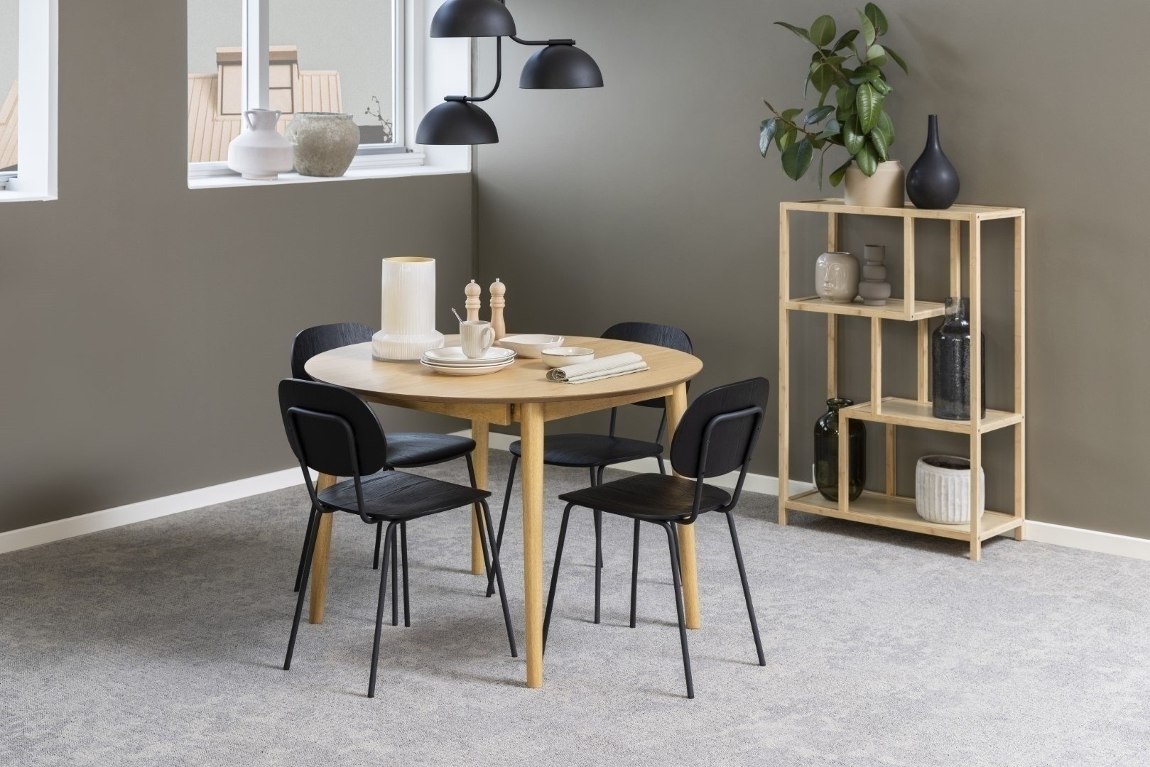 A Montreux asztal teljes egészében fából készült. Nagy, kerek asztallapja tölgy színű furnérral van borítva. Az alap gumifa fából készült, amelyet a lap színéhez igazítva pácoltak. Az asztallap kihúzható, a fő lap alatt találhatók a lapok, amelyek az asztalt 154 cm szélességűre növelik. Kartondobozok száma: 1 Kartondobozok méretei: 122,5x118,7x13cm Kartondobozok súlya: 35kg