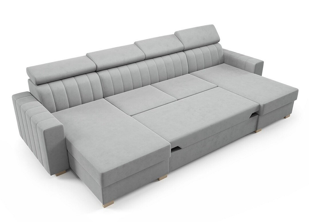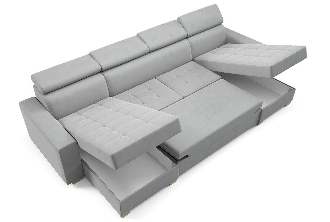 A Dolphin pozicionáló rendszerrel könnyedén átalakíthatja a kanapét egy kényelmes ággyá, amelynek fekvőfelülete 283x124 cm. Ez ideális vendégek számára vagy azoknak, akik szeretnek délutáni pihenést tartani.Ezenkívül a kanapé két ágynemű tárolóval van felszerelve, ami nagyszerű megoldás a helytakarékosságra és a rend fenntartására a nappaliban. A maximális teherbírás 350 kg, ami biztosítja, hogy a készlet robusztus és tartós.
