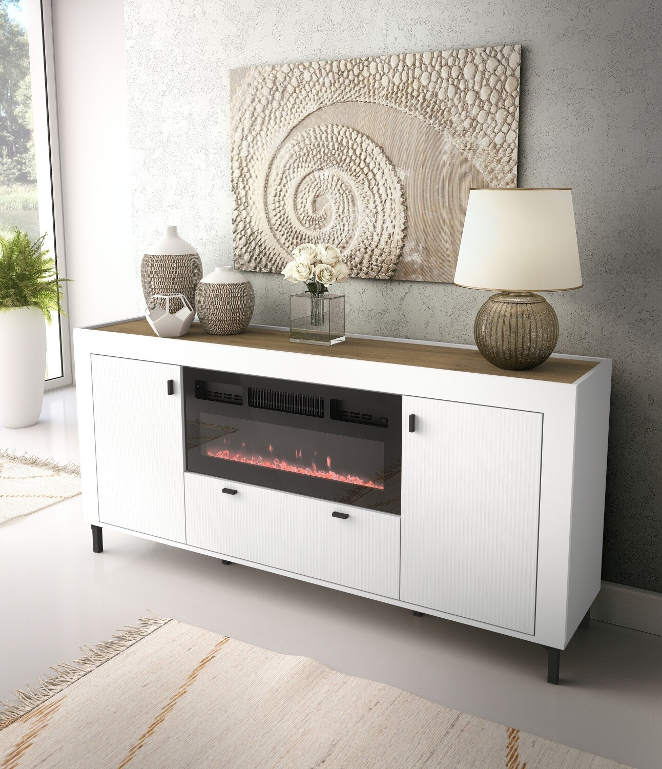 MOSSA MO7 komód kandallóval, Whisky Tölgy/Fehér Matt