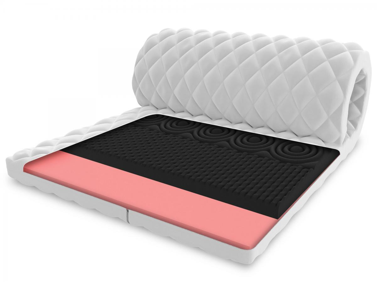 Budowa nakładki: Profilowana 7-strefowa pianka wysoko-elastyczna HR H30: Profilowana powierzchnia dzieli materac na 7 stref, dzięki czemu pianka idealnie dopasowuje się do kształtu ciała. Posiada niejednolitą strukturę komórkową, w związku z czym uzyskuje lepsze parametry komfortu oraz sprężystości. Materiał ten wyróżnia się niezwykłą trwałością i odpornością na odkształcenia. Ponadto odzyskuje ona swój pierwotny kształt dwa razy szybciej niż standardowa pianka poliuretanowa. Oznacza to, że profilowana pianka HR szybciej reaguje na zmianę pozycji ciała w trakcie snu. Drugi składnik nakładki to termoplastyczna pianka VISCO. Jej unikatowy skład oraz konstrukcja sprawiają, że reaguje ona na temperaturę i nacisk śpiącej na niej osoby. Daje efekt zapadania się w nakładce i spania „na chmurce”. Całe ciało dzięki temu jest w odpowiedni sposób podparte, a sen wyjątkowo komfortowy i zdrowy. Niweluje też wszelkie uciski w okolicach bioder i karku, a nieobciążona powraca do swojego pierwotnego kształtu. Uniemożliwia także rozwój mikroorganizmów. Pikowany pokrowiec Premium 200g/m² Antyalergiczny o membranowej strukturze, został wykonany z najwyższej jakości materiałów hipoalergicznych pierwszego gatunku, zapewniając wyjątkową miękkość, świeżość oraz niezwykły komfort i satysfakcję z jego użytkowania. Zabezpiecza przed wnikaniem zanieczyszczeń do materaca, chroni przed wnikaniem bakterii, grzybów, pleśni i roztoczy. Pokrowiec posiada wszyty zamek, który umożliwia jego łatwe ściągnięcie w celu wyprania. Zalety: Pod wpływem nacisku ciała doskonale dopasowuje się do kształtu i sylwetki użytkownika. Zmniejsza uciski w okolicach bioder i karku. Zdejmowany pokrowiec - zapinany na zamek błyskawiczny. Efekt masażu Specyfikacja: twardość: H3 średnio twardy, grubość: 7 cm. Skład: Pianka HR H30: 4 cm, VISCO pianka termoplastyczna: 2 cm, Pokrowiec: 1 cm.