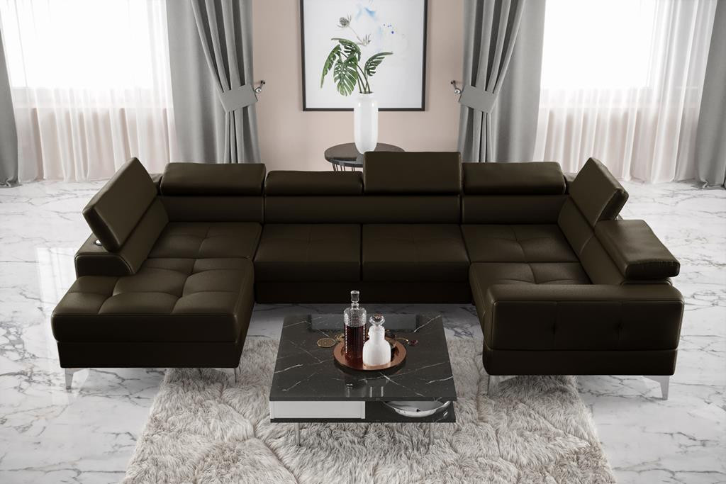 NAROŻNIK TOSCANIA MAX I 168x350x185 CM SKÓRA NATURALNA Narożnik Toscania Max I skóra naturalna to niezwykle elegancki mebel, dzięki któremu Twój salon otrzyma zupełnie nowy nietuzinkowy wygląd. Rogówka na wysokich nóżkach z pikowanymi siedziskami oraz regulowanymi zagłówkami doskonale wkomponuje się zarówno w nowoczesne jak również klasyczne wnętrza. Model Max I z pewnością pomieści całą rodzinę przed telewizorem czy gości na domowym przyjęciu. Sprawdź nasze pozostałe narożniki ze skóry naturalnej. Szukasz narożnika, który wyróżni się niebanalnym stylem i doskonałą jakością wykonania? Narożnik Toscania Max I skóra naturalna to propozycja, która spełni oczekiwania nawet najbardziej wymagających użytkowników. Nasza oferta pozwala na pełną personalizację produktu, co gwarantuje idealne dopasowanie do Twoich potrzeb. Ten narożnik posiada praktyczną funkcję spania oraz pojemny schowek na pościel. Komfort codziennego użytkowania zapewnia starannie zaprojektowane siedzisko, które dzięki zastosowaniu sprężyn falistych oraz wysokoelastycznej pianki oferuje wyjątkową wygodę i trwałość. Grube szwy, które zdobią obicie ze skóry naturalnej, pełnią nie tylko funkcję estetyczną, ale również wzmacniają połączenia materiałów, zwiększając trwałość mebla. Solidne stelaże wykonano z połączenia drewna i płyty meblowej, a najbardziej obciążone elementy konstrukcji zostały wzmocnione drewnianymi ramami, co czyni narożnik wyjątkowo wytrzymałym. Decydując się na Narożnik Toscania Max I skóra naturalna, masz pewność, że otrzymasz mebel najwyższej jakości, wyprodukowany z dbałością o najmniejsze detale. Co więcej, dajemy Ci możliwość wyboru spośród szerokiej gamy tkanin i materiałów, aby stworzyć idealne rozwiązanie dla Twojego wnętrza. Wybierz ponadczasową skórę naturalną, która doda elegancji i klasy Twojemu salonowi. Zaufaj naszej ofercie i wybierz Narożnik Toscania Max I skóra naturalna – mebel od producenta, który łączy estetykę, komfort i funkcjonalność. Wzornik skór naturalnych Zamawiając meble naszej produkcji możesz być pewien, że otrzymujesz produkt najwyższej jakości. Korzystamy jedynie ze skóry naturalnej licowej, a więc meble wykonane są z całych błamów zwierzęcych, dzięki czemu mebel zyskuje na trwałości. W porównaniu do innych producentów, my nie korzystamy z żadnych zastępczych materiałów. Nasze meble wykonane są w całości ze skóry naturalnej, także boki oraz tył (poza funkcją spania). W naszej pracy kierujemy się starannością i dbałością o najdrobniejszy szczegół. Madras jednokolorowy półmat, symbol K Madras antykowany połysk, cieniowana, symbole A, C, S Federica pół-połysk, symbol G Skóry mogą wykazywać delikatne różnice w kolorystyce, strukturze powierzchni i mogą posiadać drobne blizny. Wynika to z naturalnego środowiska, w którym żyły zwierzęta i nadaje skórze jak i meblom indywidualny charakterystyczny wygląd. Cechy te absolutnie nie mają wpływu na trwałość użytkową mebli a wręcz przeciwnie. Takie i podobne zaniki nie są wadą, a jedynie potwierdzeniem autentyczności naturalnej skóry. Mebel z funkcją rozkładania do spania okazjonalnego. Do spania codziennego rekomendujemy sofy typu DL. Funkcja spania wykonywana jest w tkaninie zastępczej. Wszystkie meble wykonywane są pod indywidualne zamówienie. Prosimy o przemyślane zakupy. Towar nie podlega zwrotowi. Meble do samodzielnego montażu.