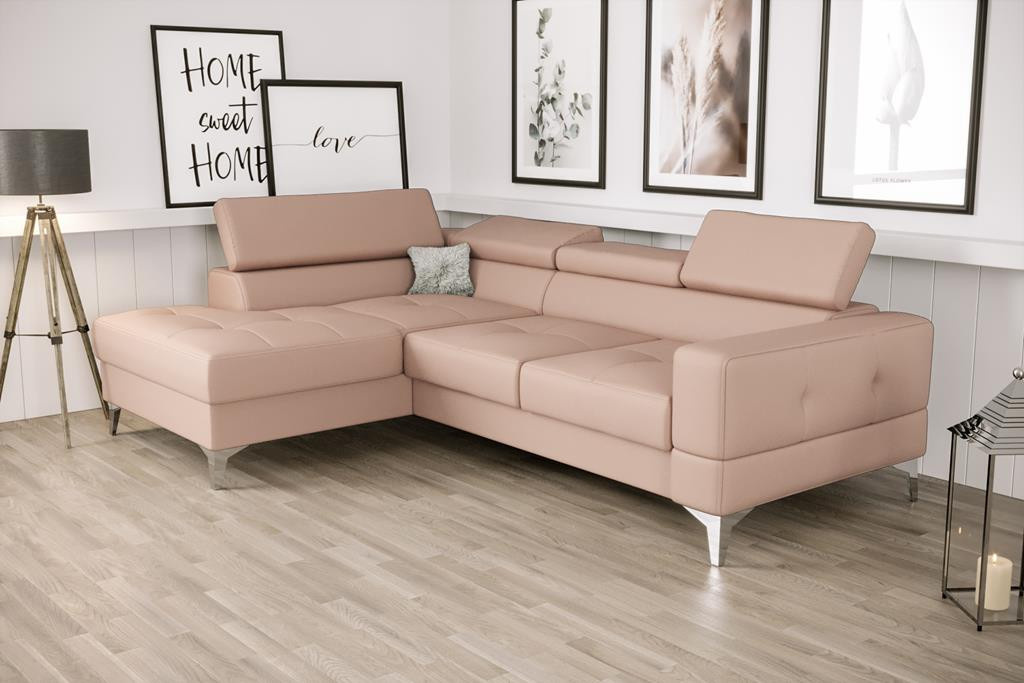 NAROŻNIK TOSCANIA MINI SKÓRA NATURALNA 170x250 CM Narożnik Toscania Mini skóra naturalna to kolejny element kolekcji mebli tapicerowanych Toscania. Powstała ona z myślą o wszystkich, którzy cenią sobie nowoczesny design i jednocześnie oczekują wysokiego komfortu. Funkcję spania rozkładaną na automacie Delfin łatwo zmienisz sofę w łóżko dla gości, zapewniając wygodne miejsce do wypoczynku w kilka chwil. Pojemnik, wykonany w całości z trwałej płyty laminowanej, oferuje praktyczne rozwiązanie na przechowywanie pościeli lub innych przedmiotów, pomagając utrzymać porządek. Dwie wersje nóg do wyboru – metalowe szpilki w kolorze srebrnym lub czarnym. Pozwalają na dopasowanie mebla do indywidualnych potrzeb i stylistyki wnętrza. Nogi o wysokości 13 cm nie tylko nadają elegancji, ale także ułatwiają sprzątanie przy użyciu robotów odkurzających typu I-Robot. Regulowane zagłówki z możliwością dostosowania do indywidualnych potrzeb gwarantują maksymalny komfort, podczas gdy zagłówek narożny stały zapewnia stabilność i wygodę. Ozdobne przeszycia oraz starannie wykonane pikowanie na siedziskach i bokach dodają sofie elegancji i podkreślają jej wysoką jakość. Siedzisko stworzone z użyciem sprężyn falistych oraz nowoczesnej pianki T35+HR. Zapewnia to doskonałe podparcie, komfort i trwałość, czyniąc mebel idealnym wyborem dla wymagających użytkowników. Sprawdź pozostałe narożniki ze skóry naturalnej. Wykonanie Wszystkie elementy produktu narożnik Toscania Mini zostały obszyte grubym szwem, co stanowi ozdobę i wzmacnia połączenia tkanin. Siedziska zbudowaliśmy na sprężynach falistych oraz piance wysoko elastycznej (połączenie najlepszych jakościowo pianek T35 i HR), co sprawiło, że są one średnio miękkie a jednocześnie bardzo wytrzymałe. Stelaże wykonujemy z drewna i płyty meblowej, dlatego nasze meble są solidnie wykonane, a cena idzie zawsze w parze z jakością. Wzornik skór naturalnych: Madras jednokolorowy półmat, symbol K Madras antykowany połysk, cieniowana, symbole A, C, S Federica pół-połysk, symbol G Skóry mogą wykazywać delikatne różnice w kolorystyce, strukturze powierzchni i mogą posiadać drobne blizny. Wynika to z naturalnego środowiska, w którym żyły zwierzęta i nadaje skórze jak i meblom indywidualny charakterystyczny. Prosimy o przemyślane zakupy. Meble ze skóry naturalnej są wykonywane na zamówienie indywidualne i nie podlegają zwrotowi. Wirtualna galeria Już teraz możesz obejrzeć nasze realizacje bez wychodzenia z domu, ponieważ udostępniliśmy dla Ciebie GALERIĘ. Miłego oglądania! Meble do samodzielnego montażu. Mebel z funkcją rozkładania do spania okazjonalnego. Do spania codziennego rekomendujemy sofy typu DL. Funkcja spania wykonywana jest w tkaninie zastępczej.