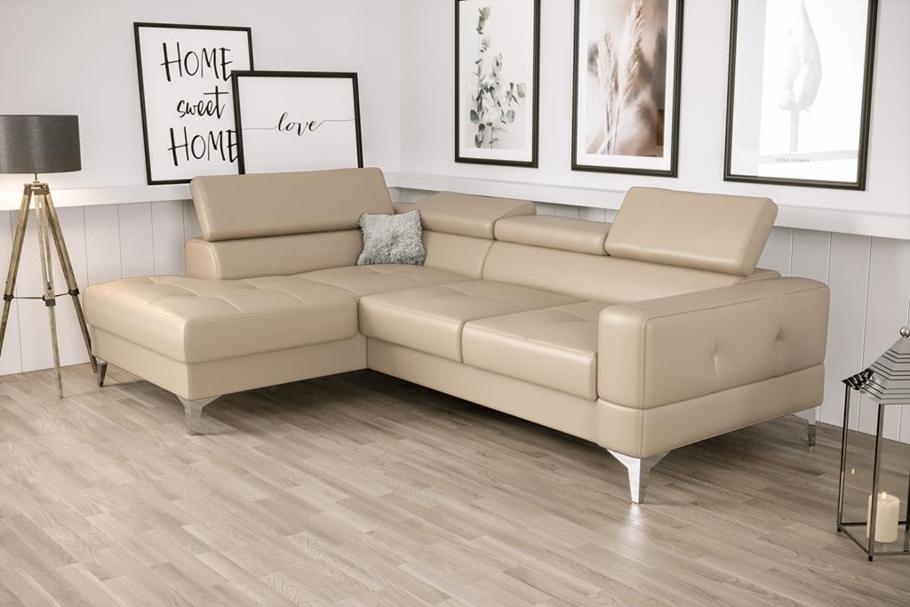 NAROŻNIK TOSCANIA MINI SKÓRA NATURALNA 170x250 CM Narożnik Toscania Mini skóra naturalna to kolejny element kolekcji mebli tapicerowanych Toscania. Powstała ona z myślą o wszystkich, którzy cenią sobie nowoczesny design i jednocześnie oczekują wysokiego komfortu. Funkcję spania rozkładaną na automacie Delfin łatwo zmienisz sofę w łóżko dla gości, zapewniając wygodne miejsce do wypoczynku w kilka chwil. Pojemnik, wykonany w całości z trwałej płyty laminowanej, oferuje praktyczne rozwiązanie na przechowywanie pościeli lub innych przedmiotów, pomagając utrzymać porządek. Dwie wersje nóg do wyboru – metalowe szpilki w kolorze srebrnym lub czarnym. Pozwalają na dopasowanie mebla do indywidualnych potrzeb i stylistyki wnętrza. Nogi o wysokości 13 cm nie tylko nadają elegancji, ale także ułatwiają sprzątanie przy użyciu robotów odkurzających typu I-Robot. Regulowane zagłówki z możliwością dostosowania do indywidualnych potrzeb gwarantują maksymalny komfort, podczas gdy zagłówek narożny stały zapewnia stabilność i wygodę. Ozdobne przeszycia oraz starannie wykonane pikowanie na siedziskach i bokach dodają sofie elegancji i podkreślają jej wysoką jakość. Siedzisko stworzone z użyciem sprężyn falistych oraz nowoczesnej pianki T35+HR. Zapewnia to doskonałe podparcie, komfort i trwałość, czyniąc mebel idealnym wyborem dla wymagających użytkowników. Sprawdź pozostałe narożniki ze skóry naturalnej. Wykonanie Wszystkie elementy produktu narożnik Toscania Mini zostały obszyte grubym szwem, co stanowi ozdobę i wzmacnia połączenia tkanin. Siedziska zbudowaliśmy na sprężynach falistych oraz piance wysoko elastycznej (połączenie najlepszych jakościowo pianek T35 i HR), co sprawiło, że są one średnio miękkie a jednocześnie bardzo wytrzymałe. Stelaże wykonujemy z drewna i płyty meblowej, dlatego nasze meble są solidnie wykonane, a cena idzie zawsze w parze z jakością. Wzornik skór naturalnych: Madras jednokolorowy półmat, symbol K Madras antykowany połysk, cieniowana, symbole A, C, S Federica pół-połysk, symbol G Skóry mogą wykazywać delikatne różnice w kolorystyce, strukturze powierzchni i mogą posiadać drobne blizny. Wynika to z naturalnego środowiska, w którym żyły zwierzęta i nadaje skórze jak i meblom indywidualny charakterystyczny. Prosimy o przemyślane zakupy. Meble ze skóry naturalnej są wykonywane na zamówienie indywidualne i nie podlegają zwrotowi. Wirtualna galeria Już teraz możesz obejrzeć nasze realizacje bez wychodzenia z domu, ponieważ udostępniliśmy dla Ciebie GALERIĘ. Miłego oglądania! Meble do samodzielnego montażu. Mebel z funkcją rozkładania do spania okazjonalnego. Do spania codziennego rekomendujemy sofy typu DL. Funkcja spania wykonywana jest w tkaninie zastępczej.