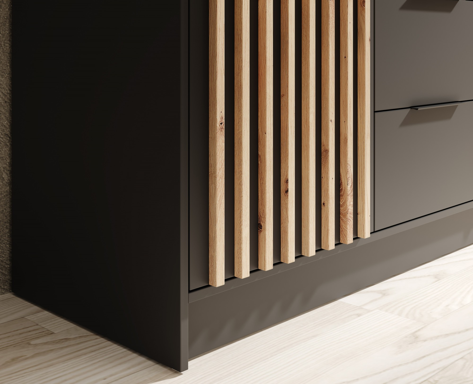 Neri ruhásszekrény – elegáns és funkcionális szekrény, amely tökéletesen illeszkedik a modern és klasszikus belső terekbe egyaránt. A színek széles választékának köszönhetően mindenki megtalálja azt a verziót, amely tökéletesen illeszkedik a stílusához. A Neri szekrény dekoratív lamellákkal rendelkeznek az elülső oldalakon és egy nagy tükörrel, amely optikailag megnöveli a teret és könnyedséget kölcsönöz neki.A szekrény három praktikus méretben kaphatók:- 100 cm – kompakt, ideális kisebb terekhez,- 150 cm – kiváló kompromisszum a tér és a méret között,- 200 cm – tágas változat, ideális nagyobb ruhatár tárolására.Mindegyik verziót a felhasználó kényelmét és az esztétikát szem előtt tartva tervezték, amely gazdagítja bármely hálószobát vagy gardróbot.