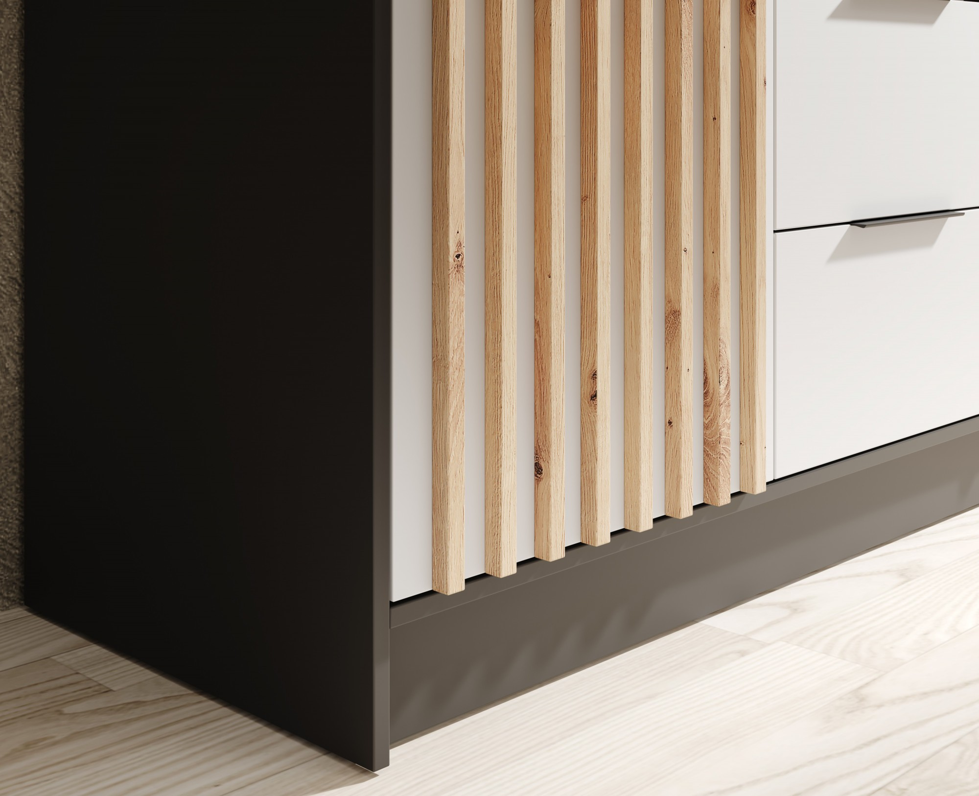 Neri ruhásszekrény – elegáns és funkcionális szekrény, amely tökéletesen illeszkedik a modern és klasszikus belső terekbe egyaránt. A színek széles választékának köszönhetően mindenki megtalálja azt a verziót, amely tökéletesen illeszkedik a stílusához. A Neri szekrény dekoratív lamellákkal rendelkeznek az elülső oldalakon és egy nagy tükörrel, amely optikailag megnöveli a teret és könnyedséget kölcsönöz neki.A szekrény három praktikus méretben kaphatók:- 100 cm – kompakt, ideális kisebb terekhez,- 150 cm – kiváló kompromisszum a tér és a méret között,- 200 cm – tágas változat, ideális nagyobb ruhatár tárolására.Mindegyik verziót a felhasználó kényelmét és az esztétikát szem előtt tartva tervezték, amely gazdagítja bármely hálószobát vagy gardróbot.