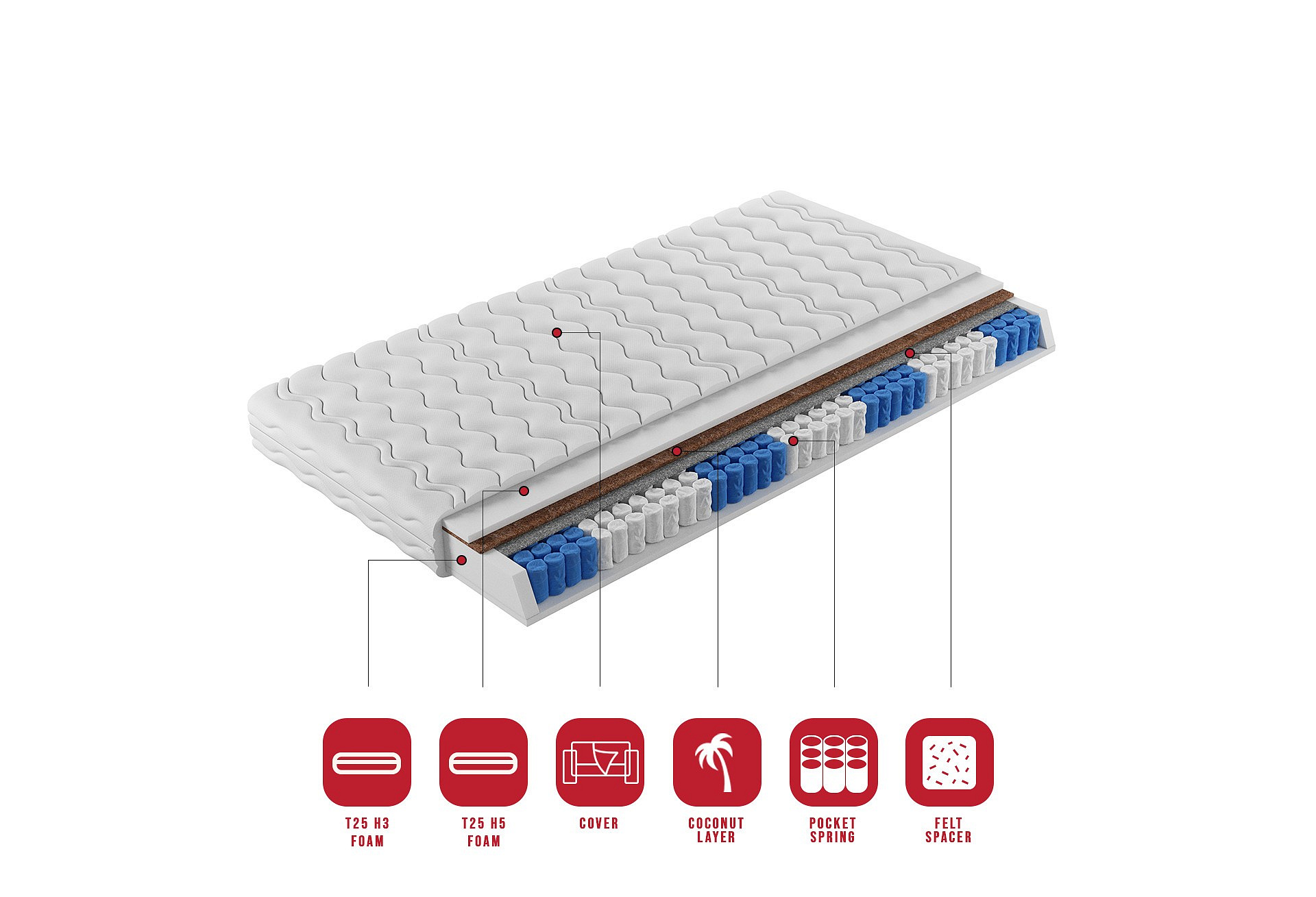 A NEVA zsebes matrac magas rugalmasságával és pontszerű testtámogatásával tűnik ki alvás közben, ami biztosítja a gerinc tehermentesítését és a jobb pihenést. A matrac töltete kiváló minőségű T25 poliuretán habból készült, kétoldalas keménységgel: H5 és H3 - kemény és közepesen kemény. A pihenés kényelmének javítása érdekében a NEVA modell 1 cm magas kókuszlemezzel van felszerelve. Ilyen kombináció biztosítja, hogy a matrac jó tartóssággal és légáramlással rendelkezzen. Fontos tulajdonsága a hipoallergén jellege is. Antiallergén, steppelt huzat nem vonzza a port, atkákat vagy más allergéneket, így kedvelt választás az allergiára és bőrirritációra hajlamos személyek számára. Ezenkívül mosógépben is mosható 40 Celsius-fokon, ami még inkább megkönnyíti az alvás megfelelő higiéniájának fenntartását. A huzat cipzárral rendelkezik, így könnyen levehető és felhelyezhető. A NEVA modell a következő méretekben érhető el: 80/90/120/140/160/180/200 x 200 cm.